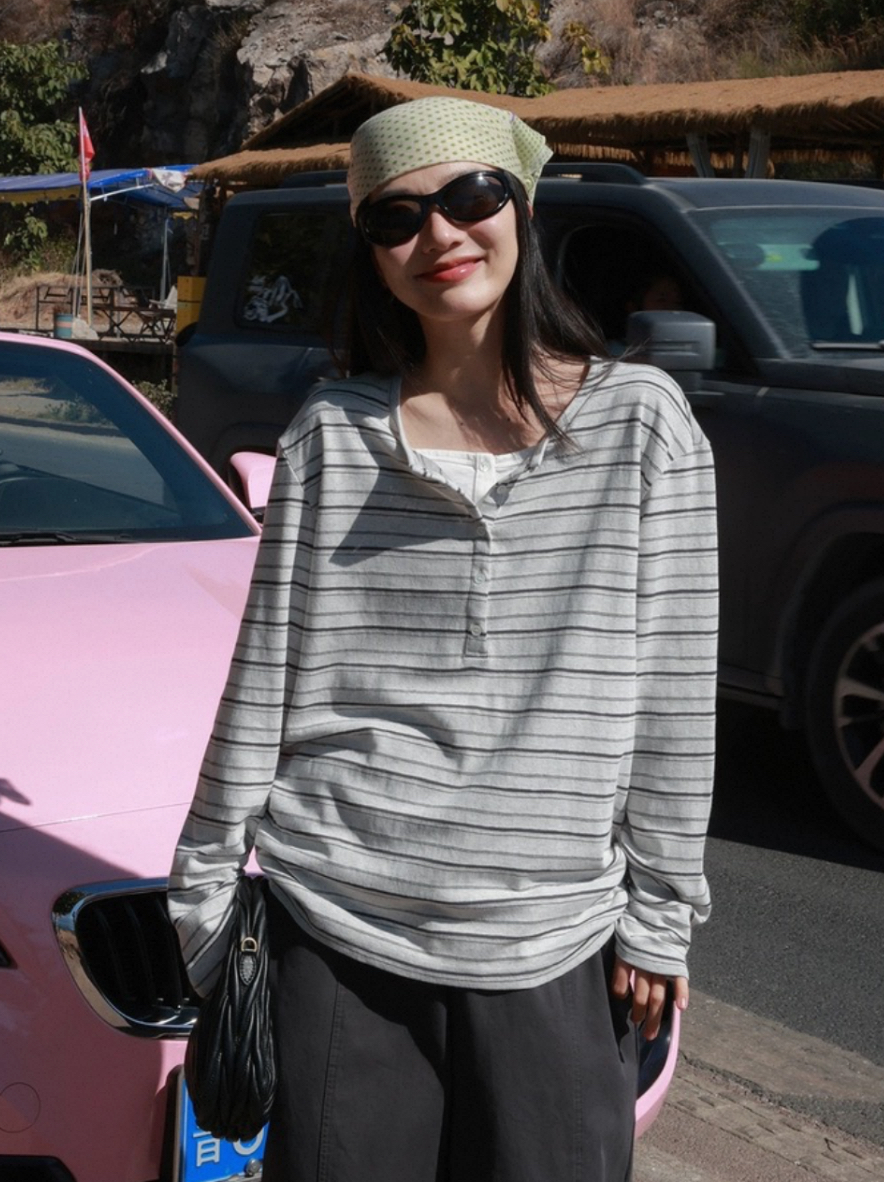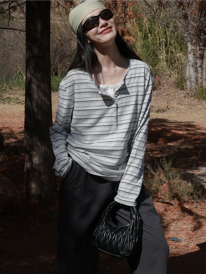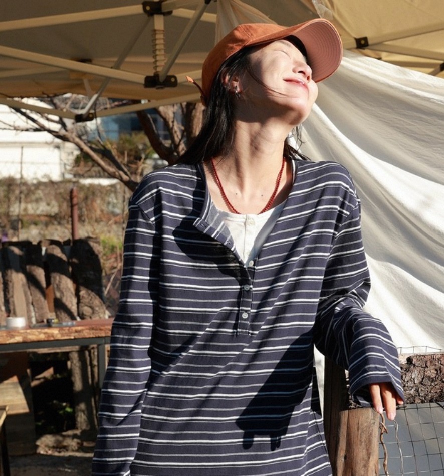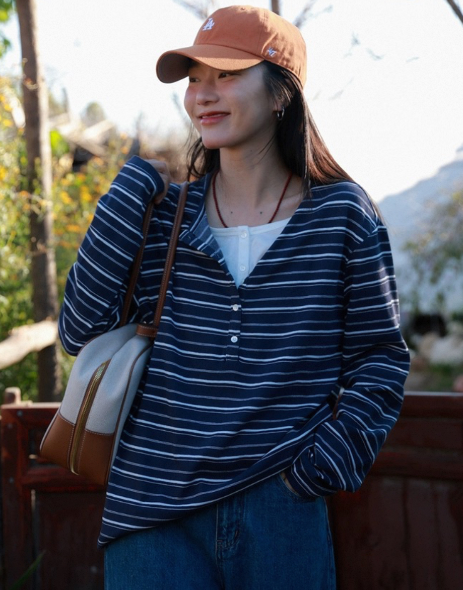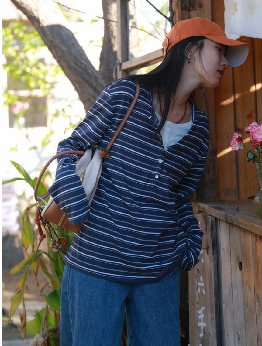 老米优品🎈预售7天!超显瘦!软fufu的春日触感~《假两件设计感半开襟条纹TEE》春天的松弛感,一件条纹T就够了🌿T260322A