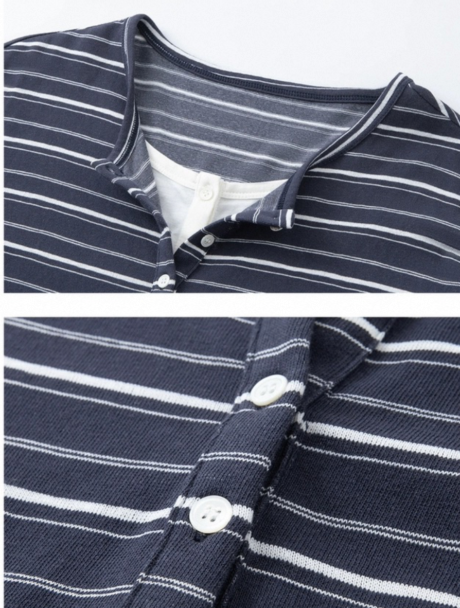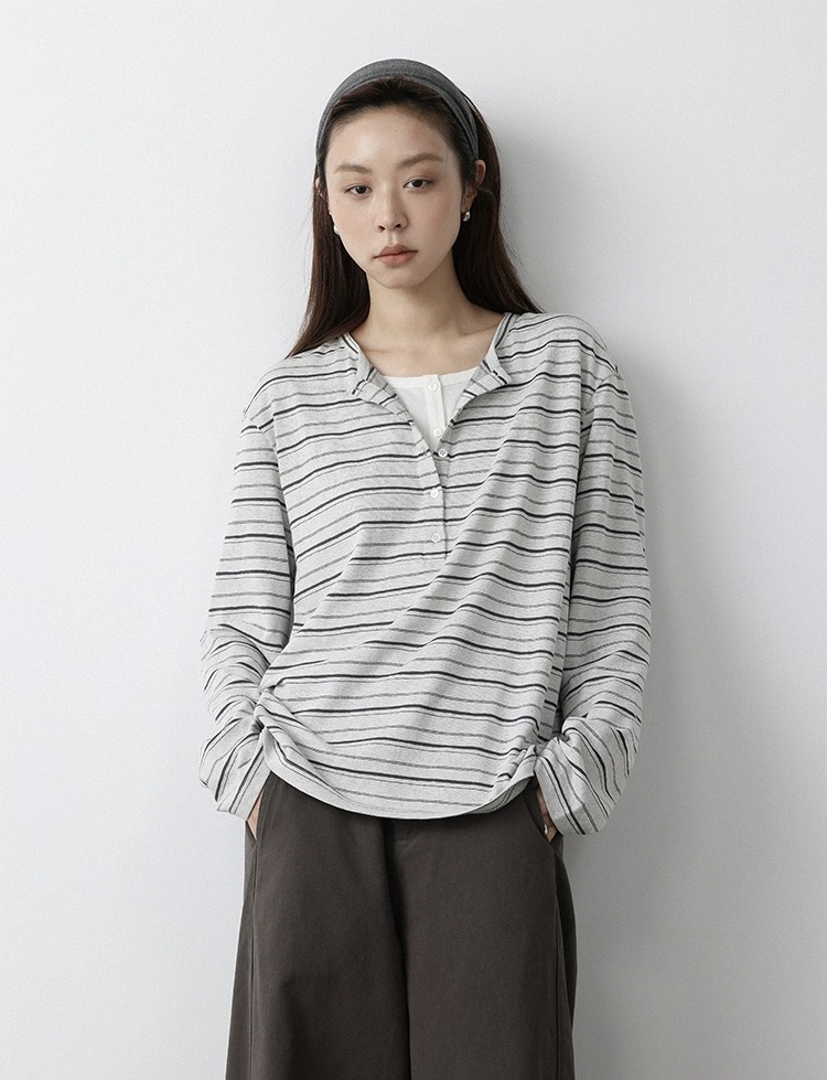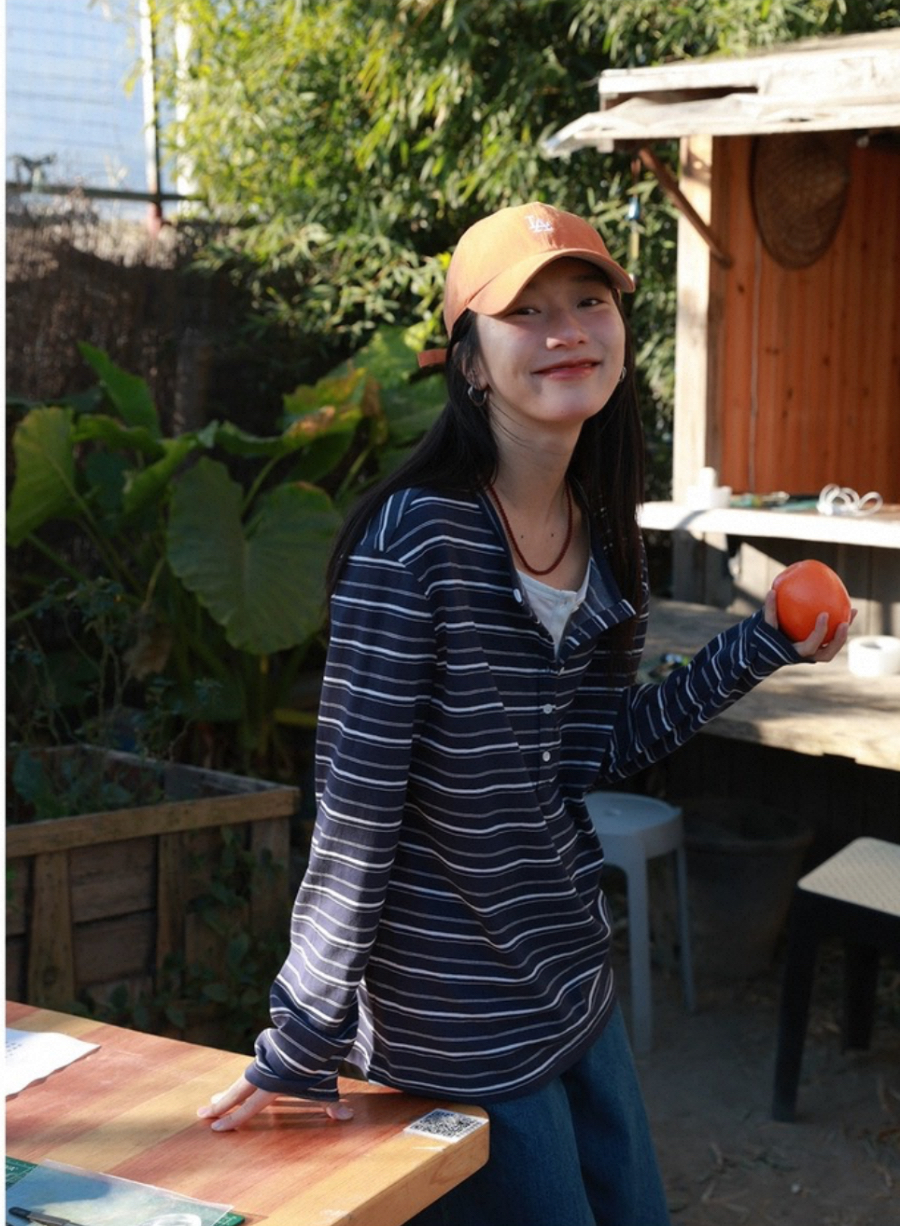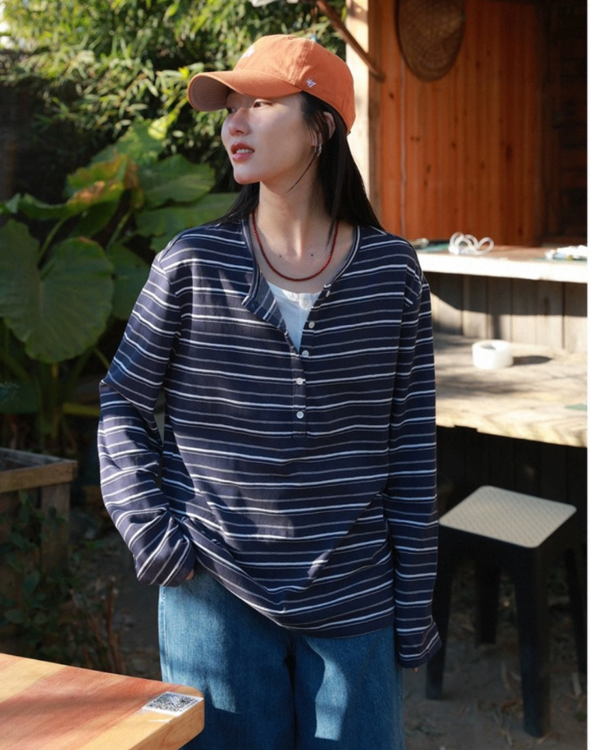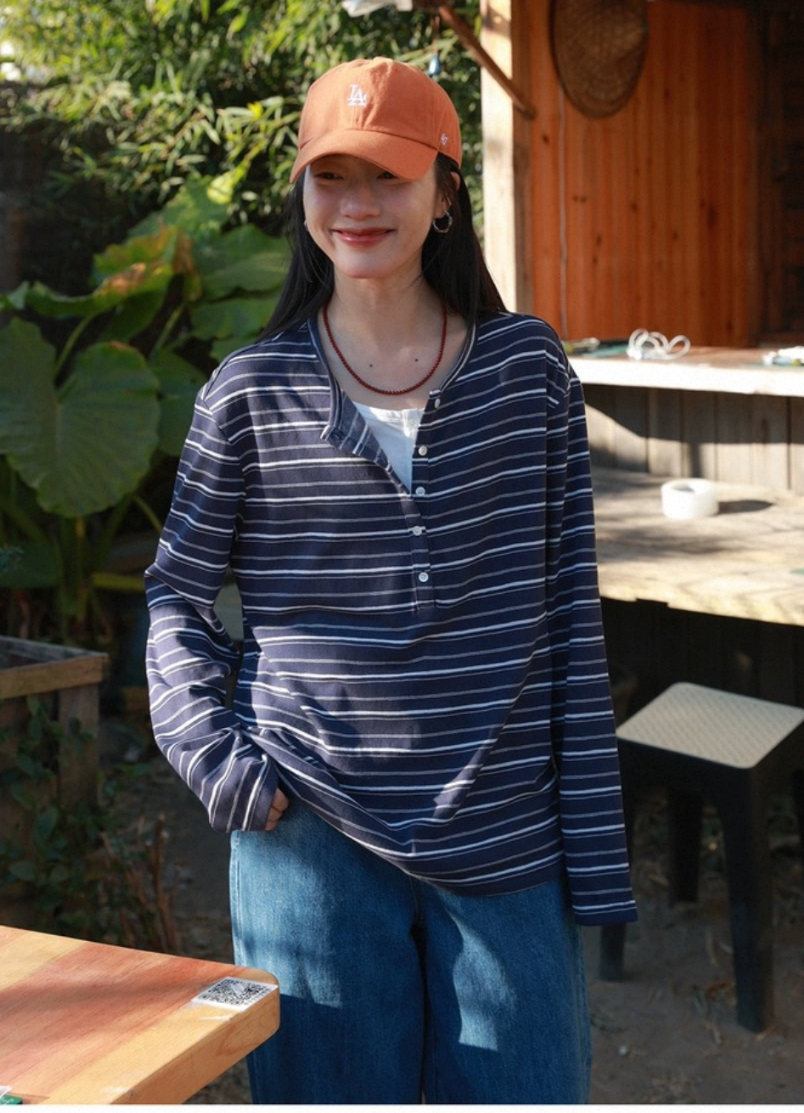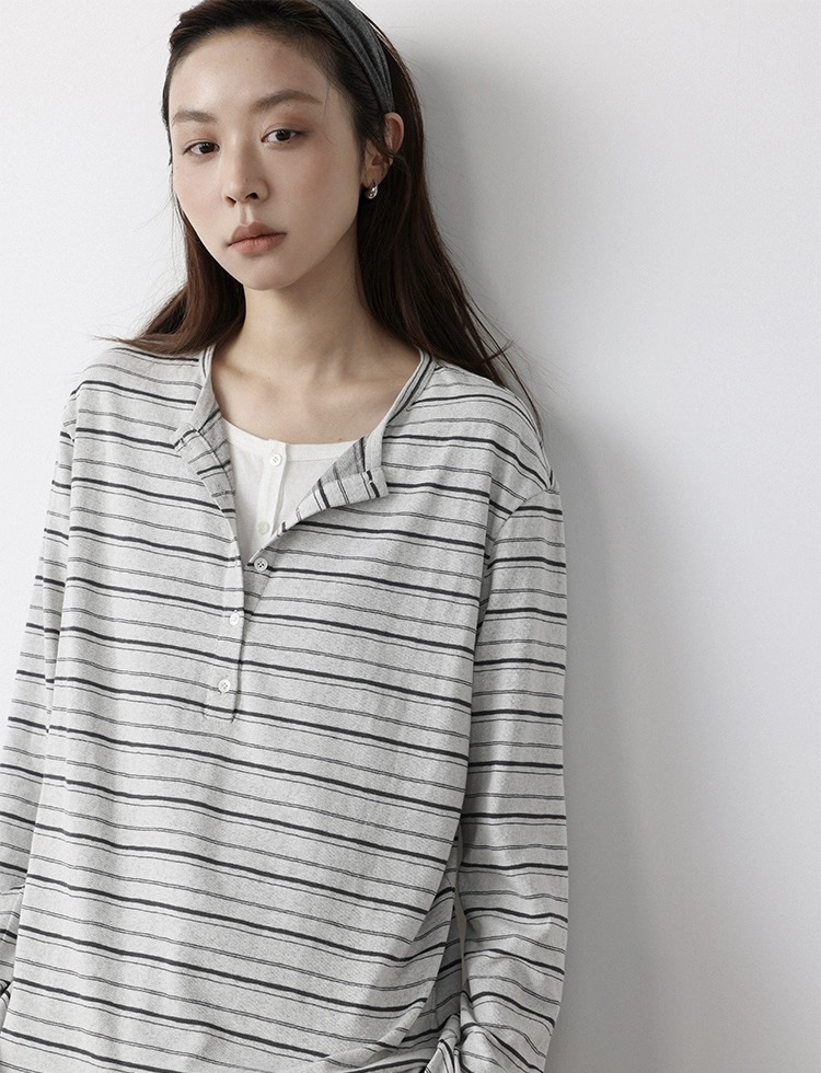 老米优品🎈预售7天!超显瘦!软fufu的春日触感~《假两件设计感半开襟条纹TEE》春天的松弛感,一件条纹T就够了🌿T260322A