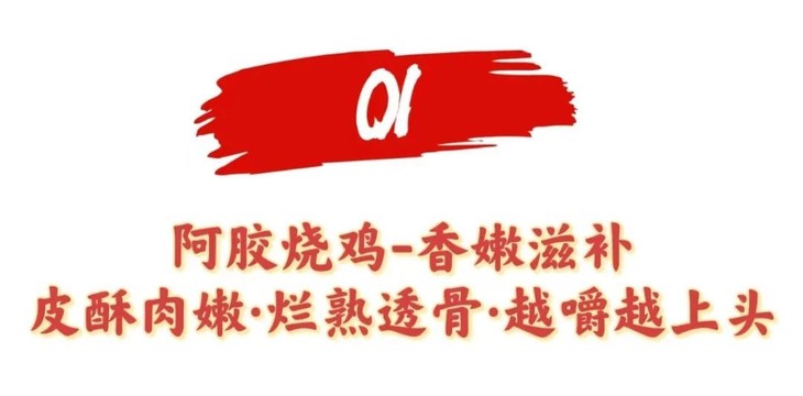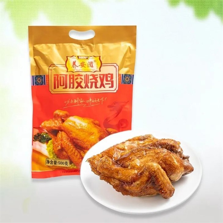 阿胶烧鸡,是一道融合了传统与创新的美味佳肴 让人一尝难忘,回味无穷。 选用上等农家鸡,经过精心烹饪 每一块吸饱了醇厚汤汁,色泽诱人,泛着诱人油光