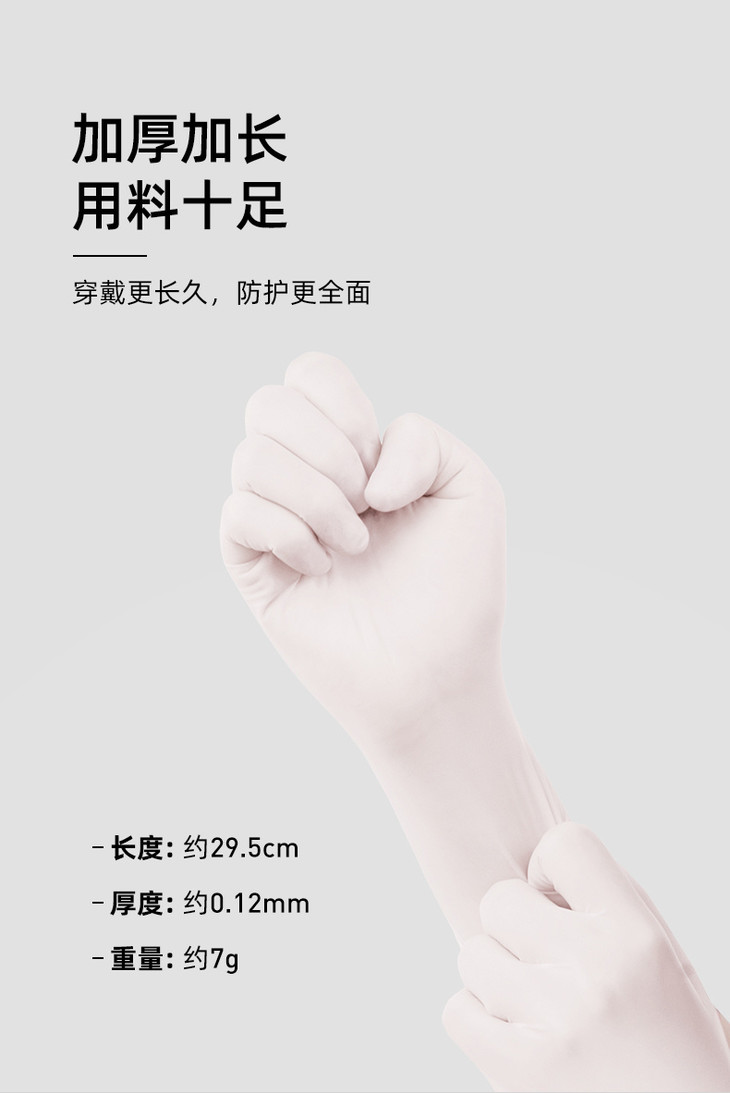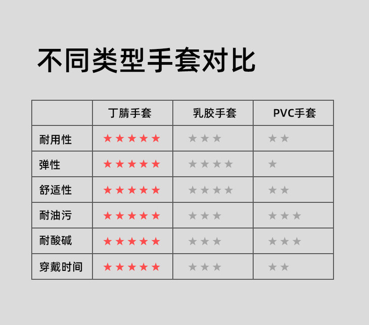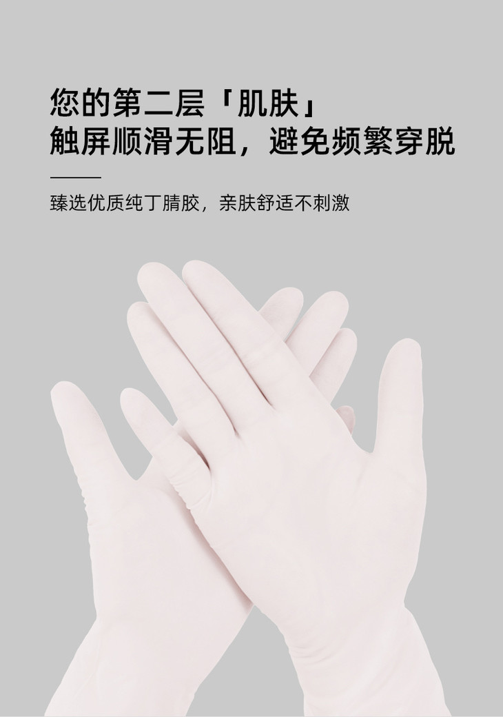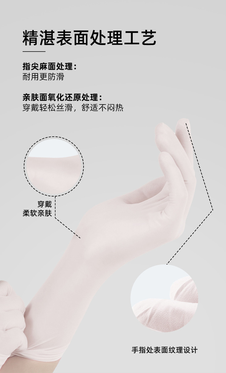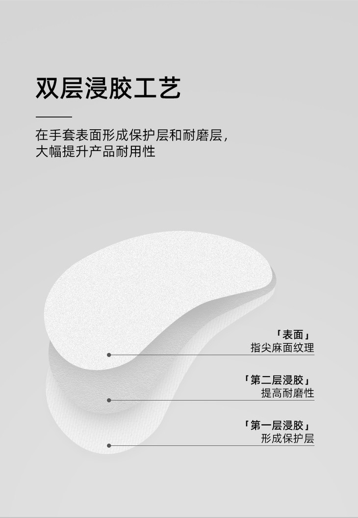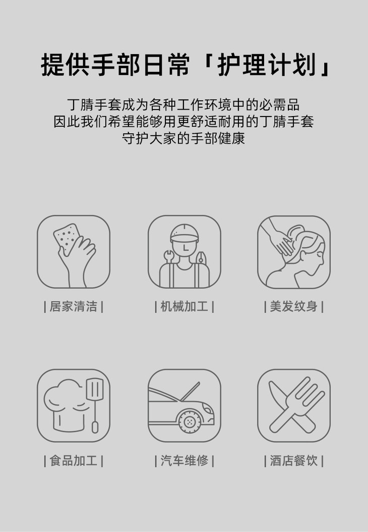 2、丁腈材质 高弹耐用 选用优质纯丁腈材质,高度回弹,不易老化;行业独创双层浸胶工艺,形成亲肤层和保护层,安全低敏不刺激,柔软舒适不闷热,超强韧性防穿刺,耐油耐污更耐用;