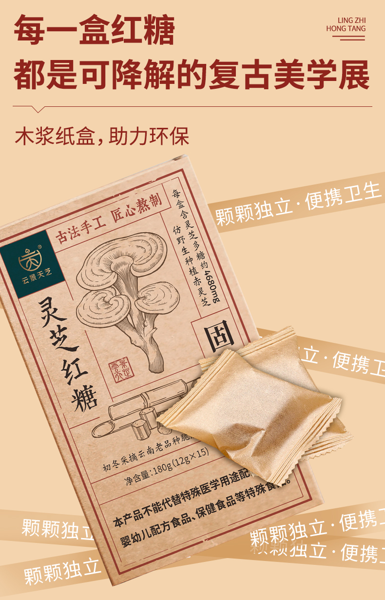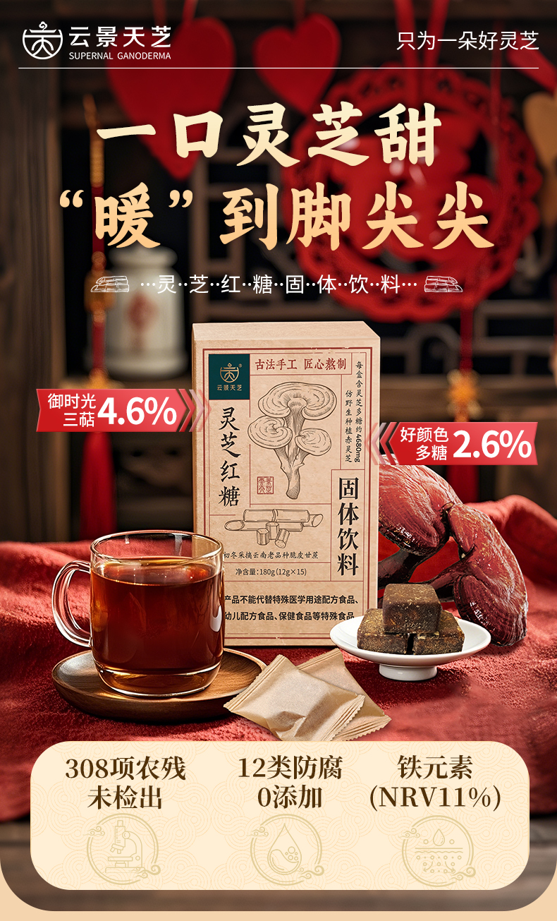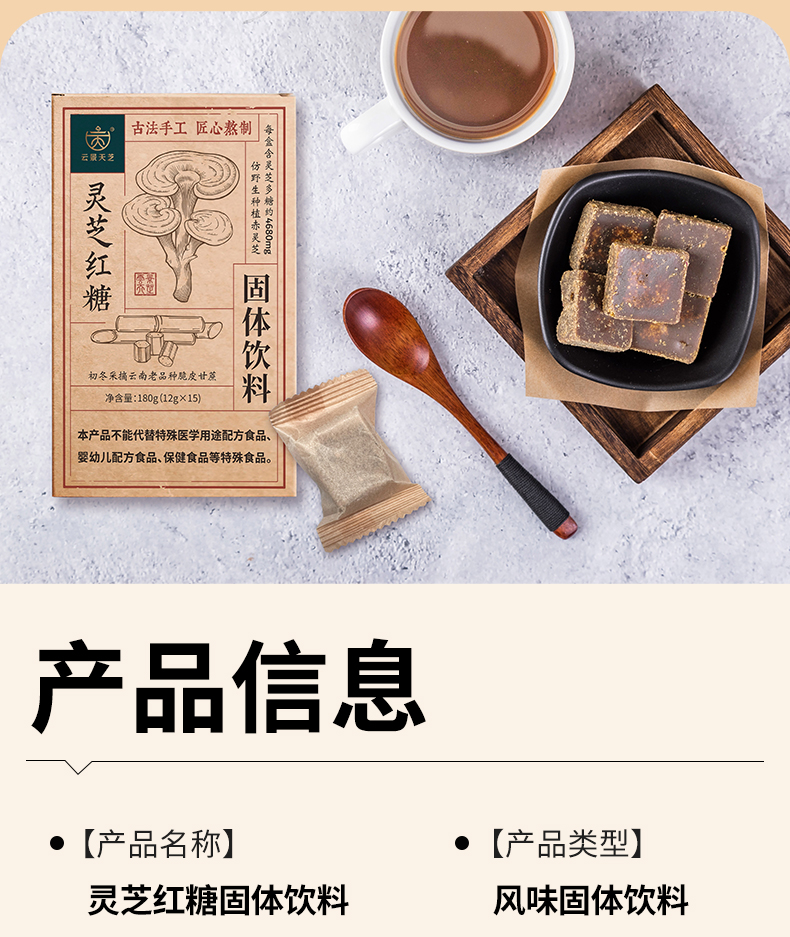 灵芝红糖固体饮料 云景天芝出品 灵芝多糖含量2.6% 每添加盒7000mg灵芝嫩芽 308项农残12项防腐0检出 云南高原有机栽培基地