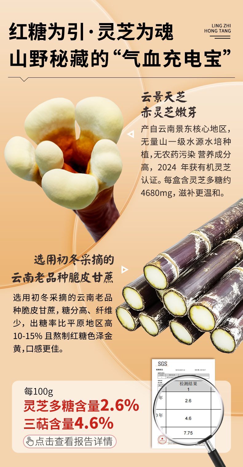 【灵芝红糖】云景天芝灵芝多糖含量2.6%·每添加盒7000mg灵芝嫩芽 ·308项农残12项防腐0检出·云南高 原灵芝栽培基地