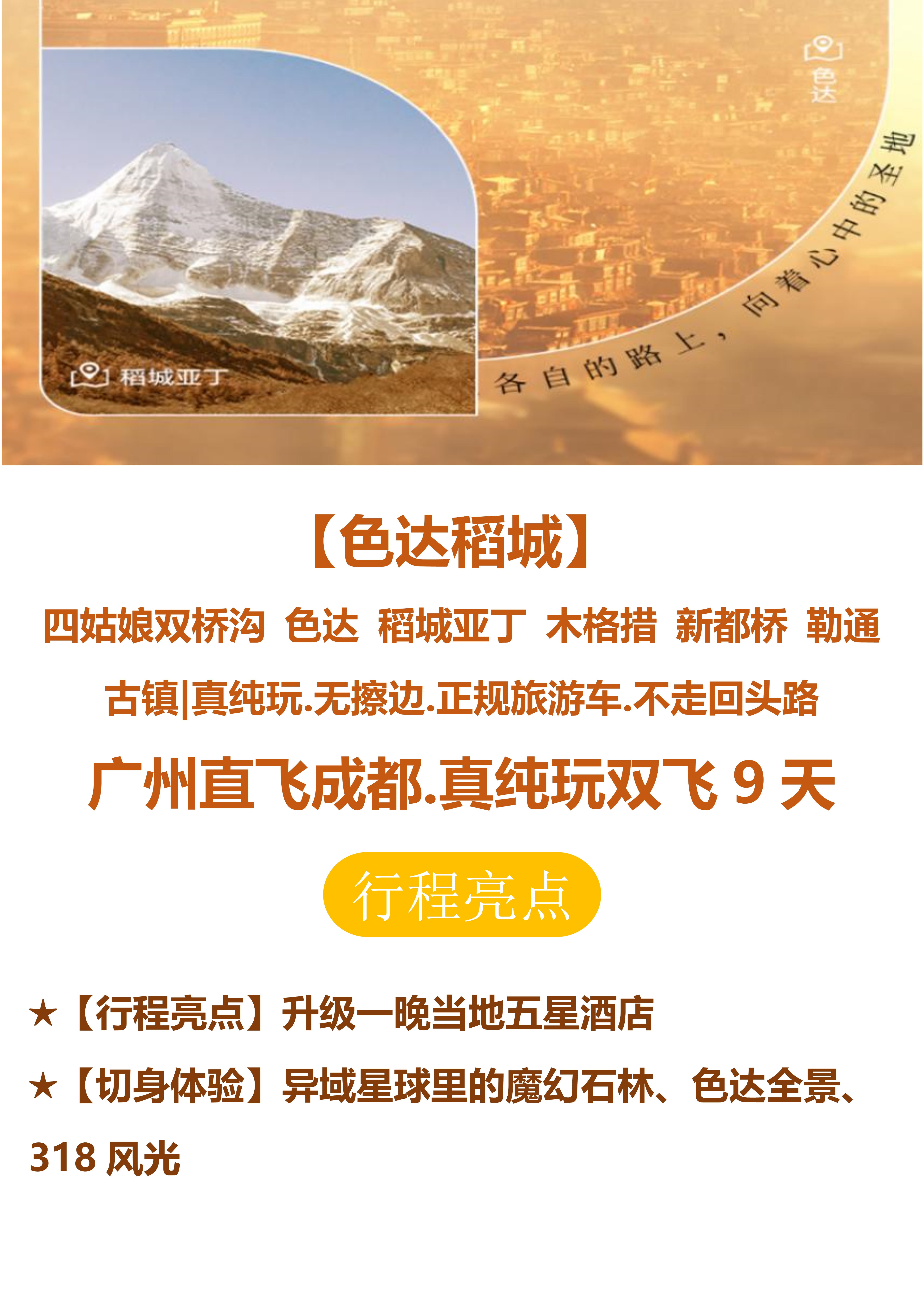 【色达稻城】广州直飞成都.真纯玩双飞 9 天