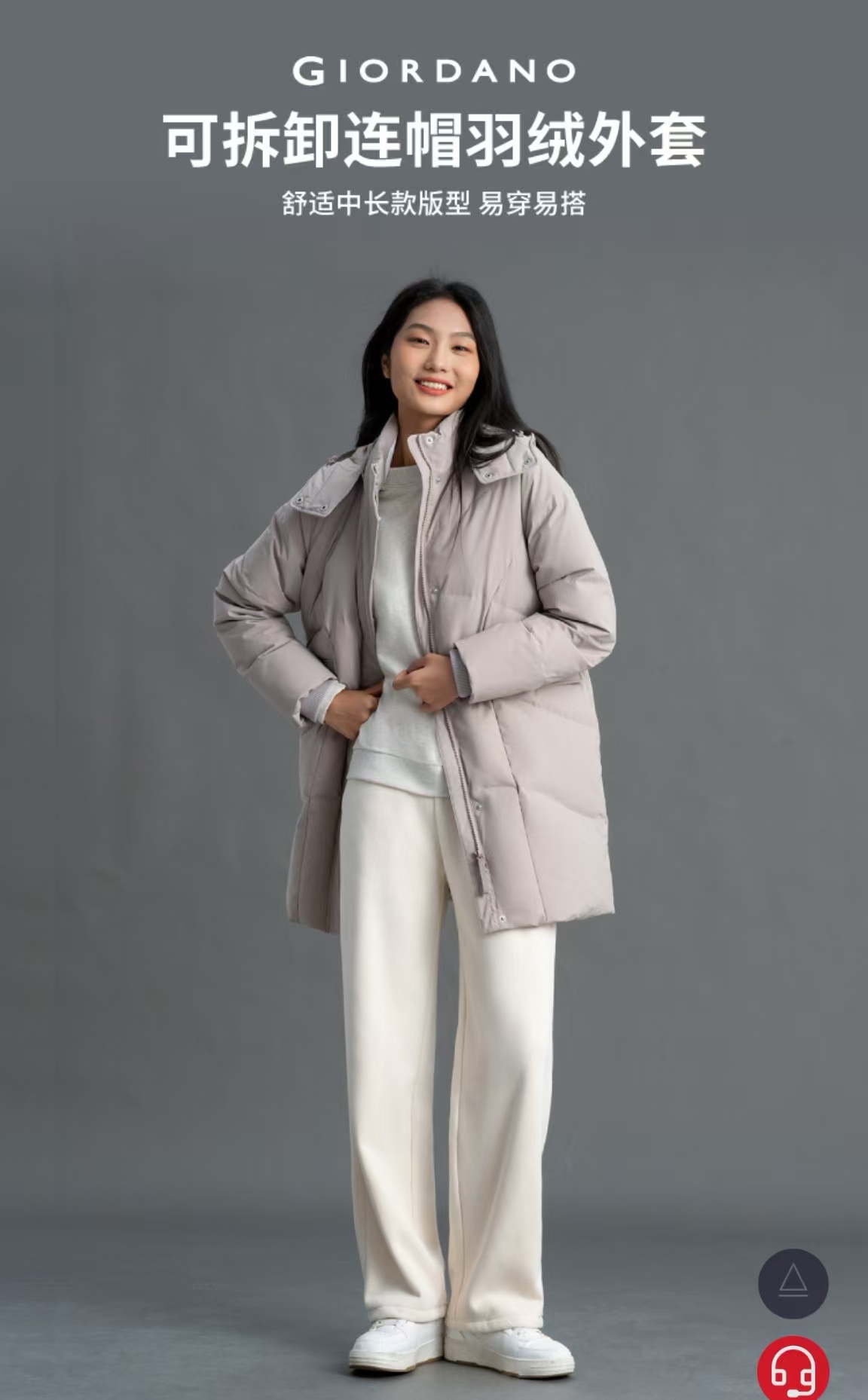 佐丹奴女装25年新款防风防泼水防污可机洗可拆帽羽绒大衣05375629
