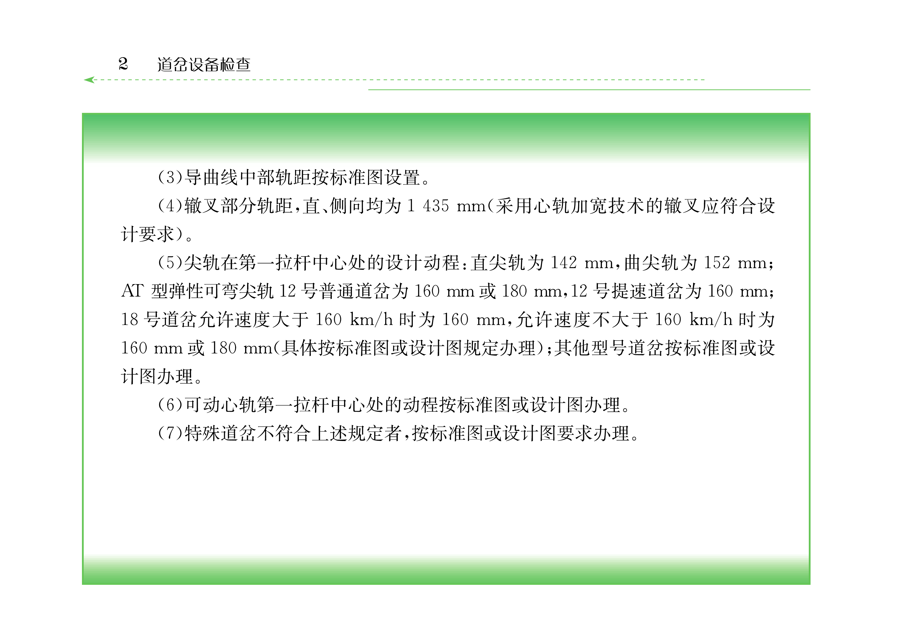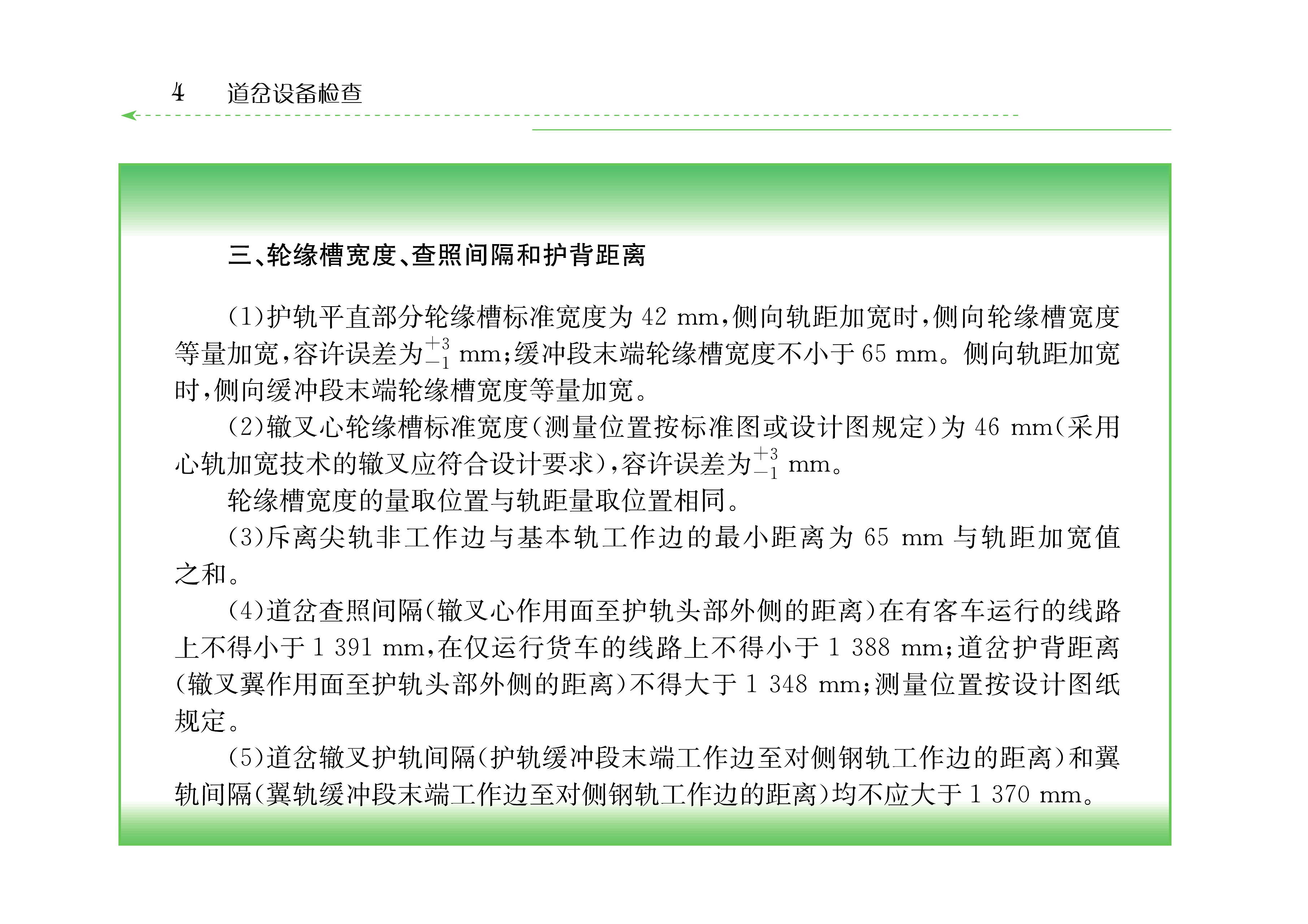 线路道岔静态检查是辅助线路动态检查,掌握设备变化规律的有效方法,也是制订维修作业计划的一项重要依据。对于动态检查周期内或轨道检查车、综合检测列车无法进行检查的线路道岔,应根据有关要求进行周期性检查。根据现场检查作业需求,编写了《铁路线路设备静态检查》系列共四册,主要根据国铁集团相关规定、铁路局集团公司道岔检查作业指导书及现场实际作业情况,阐述了常用道岔各部位轨距标准、道岔轨距水平检查位置、道岔其他尺寸检查和道岔结构检查方法及标准等内容。'
