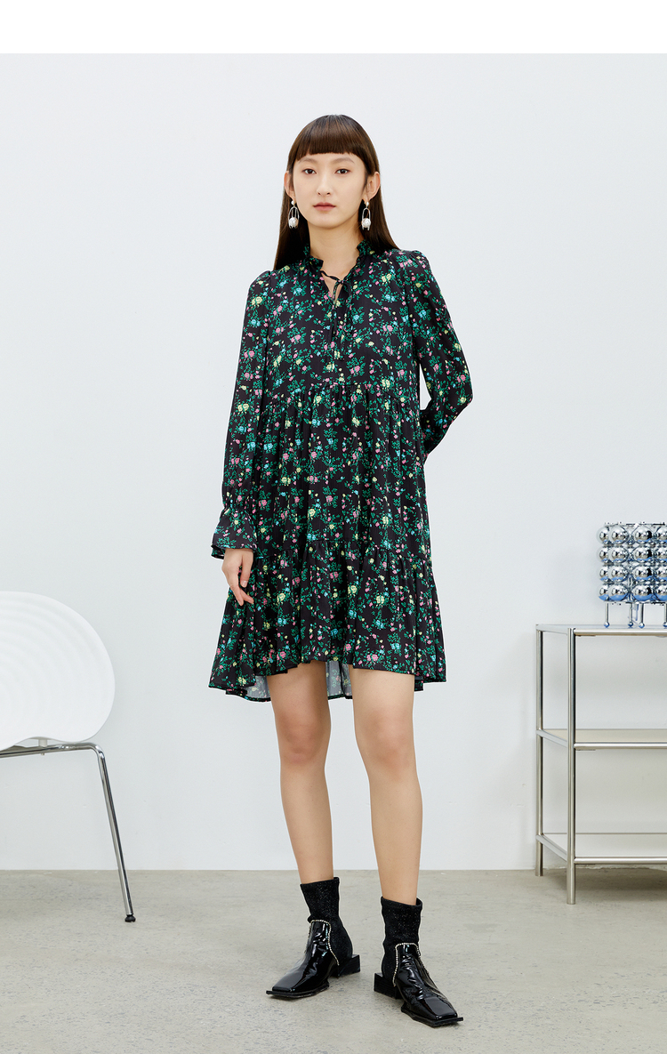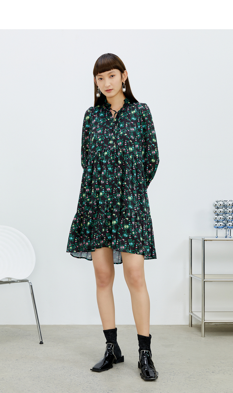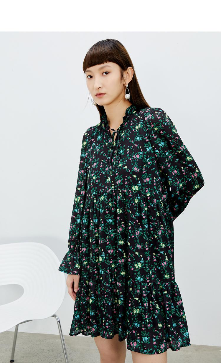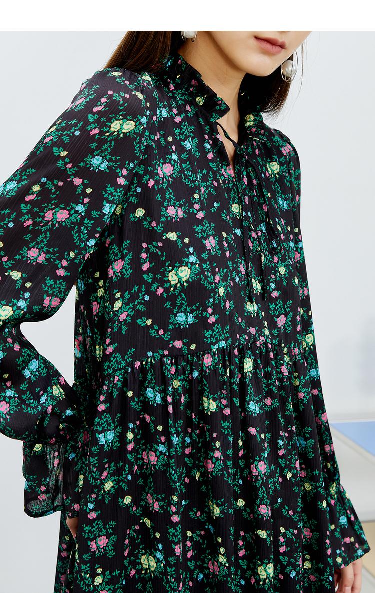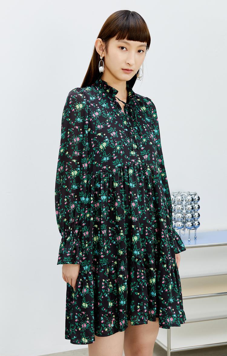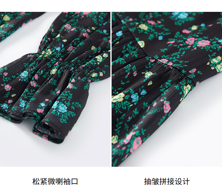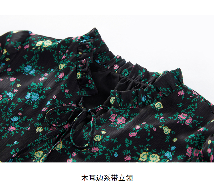 NEELLY纳俪气质立领系带碎花连衣裙2022新款春夏泡泡袖中长裙韩版N22031Y01136