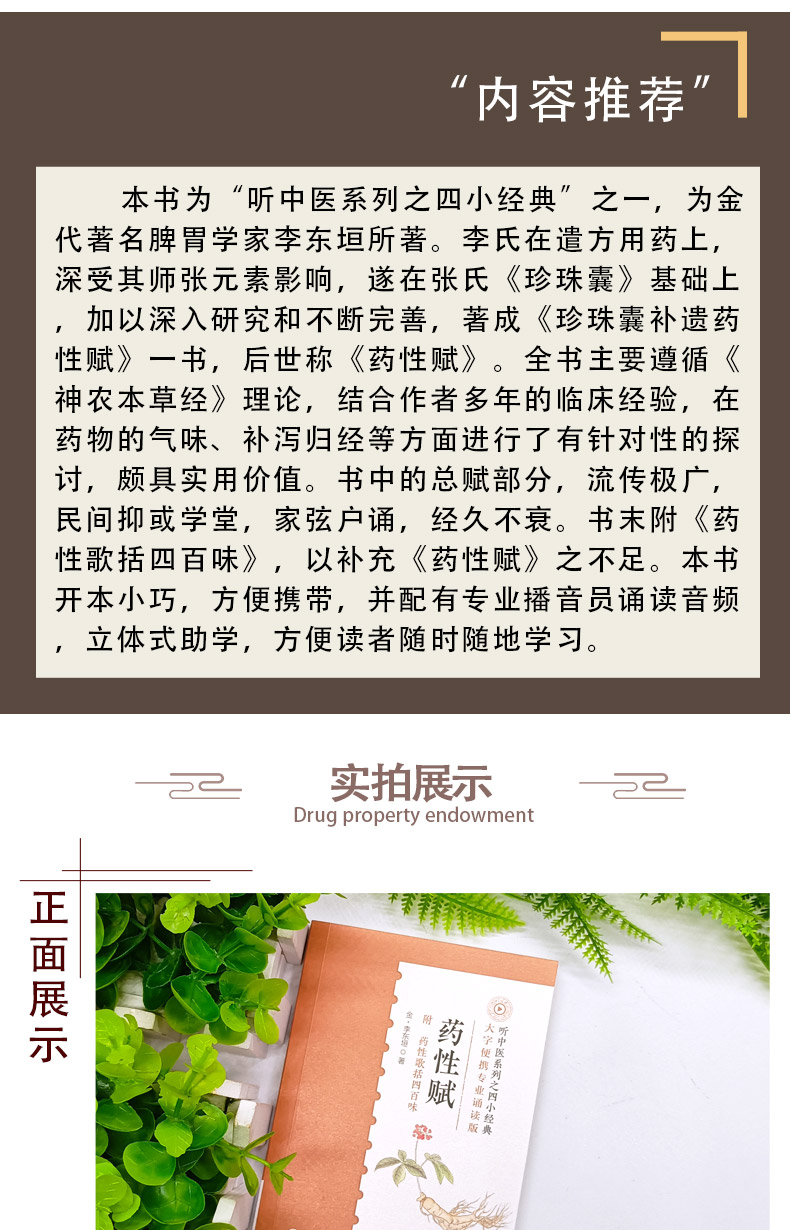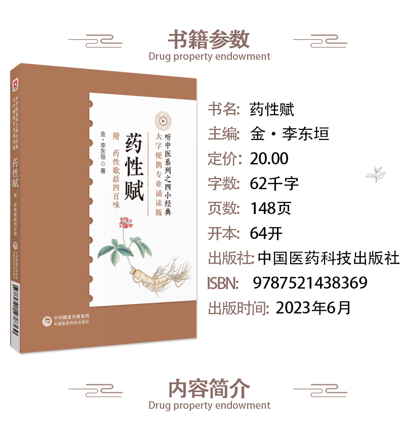 本书为“听中医系列之四小经典”之一,为金代著名脾胃学家李东垣所著。李氏在遣方用药上,深受其师张元素影响,遂在张氏《珍珠囊》基础上,加以深入研究和不断完善,著成《珍珠囊补遗药性赋》一书,后世称《药性赋》。全书主要遵循《神农本草经》理论,结合作者多年的临床经验,在药物的气味、补泻归经等方面进行了有针对性的探讨,颇具实用价值。书中的总赋部分,流传极广,民间抑或学堂,家弦户诵,经久不衰。书末附《药性歌括四百味》,以补充《药性赋》之不足。本书开本小巧,方便携带,并配有专业播音员诵读音频,立体式助学,方便读者随时随地学习。