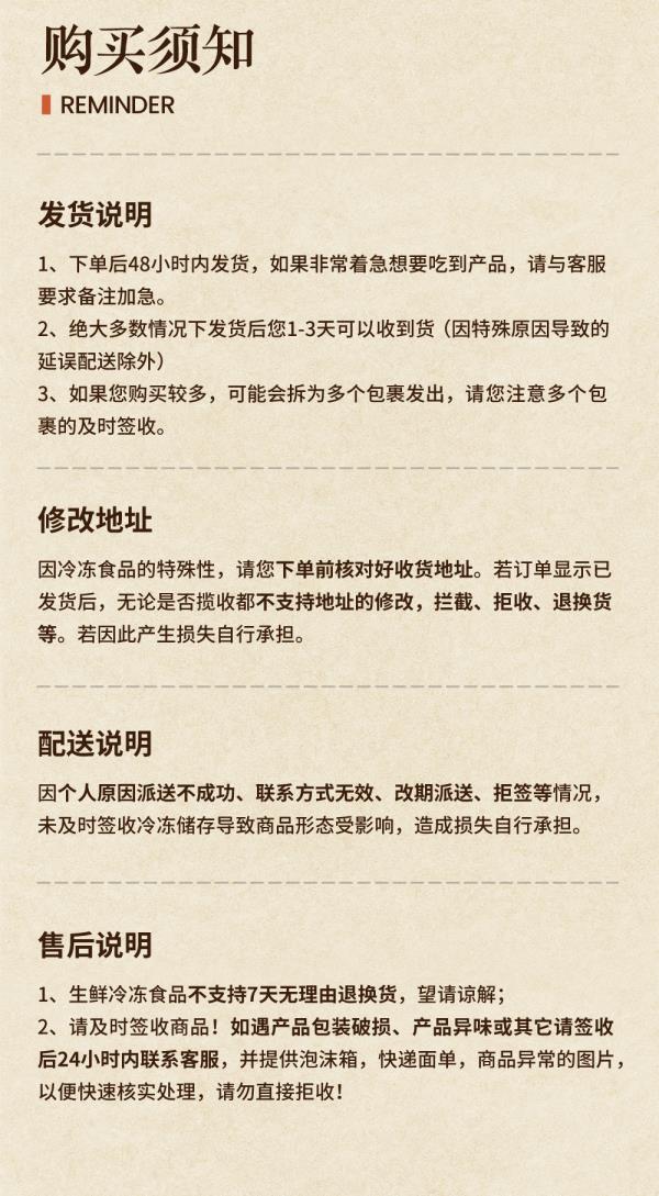 【其他注意事项】本人签收,收货后立即放入冷冻