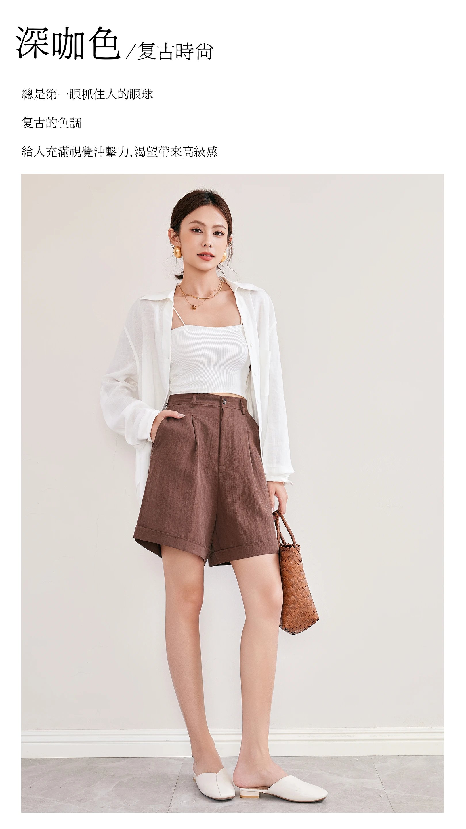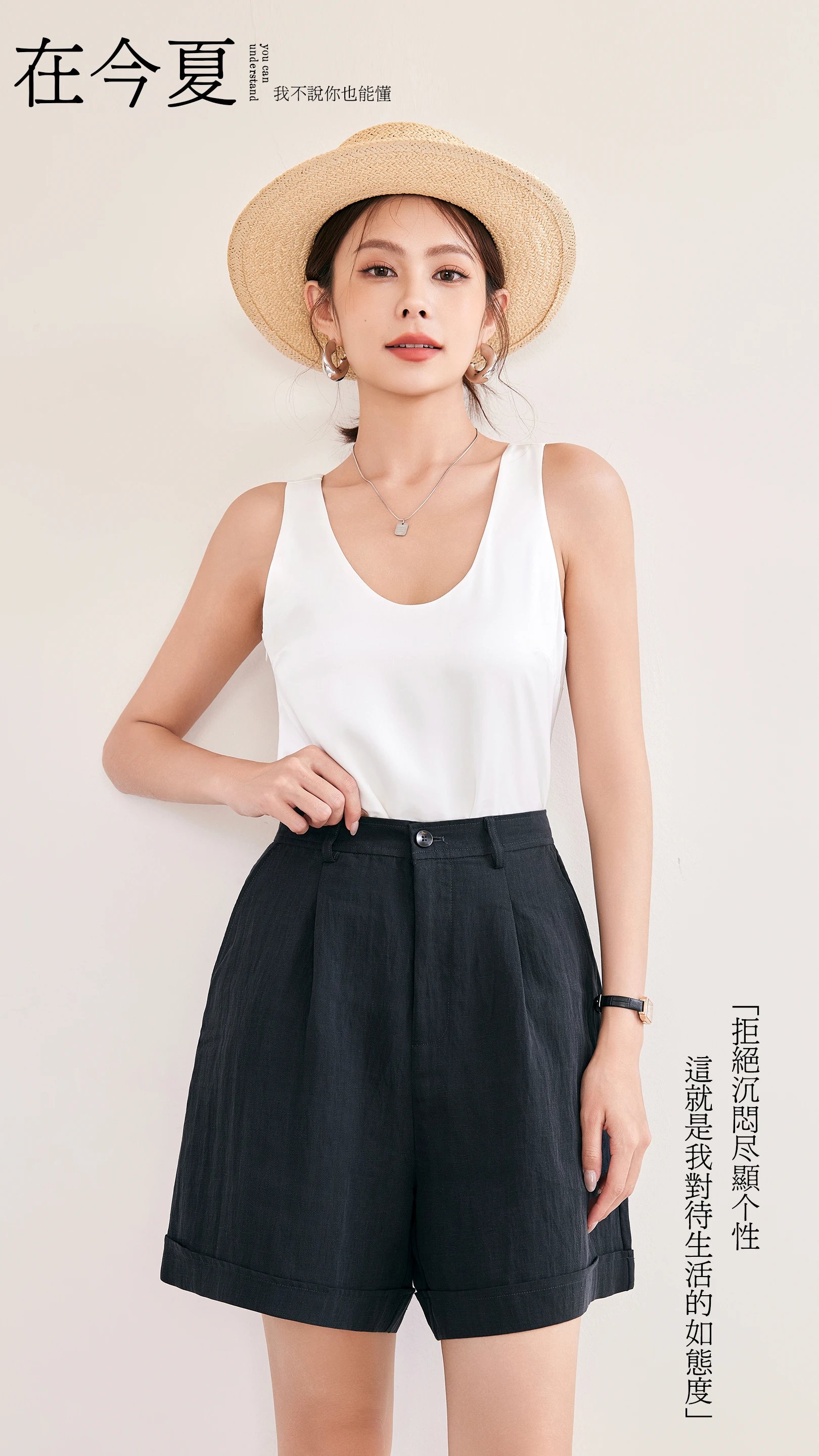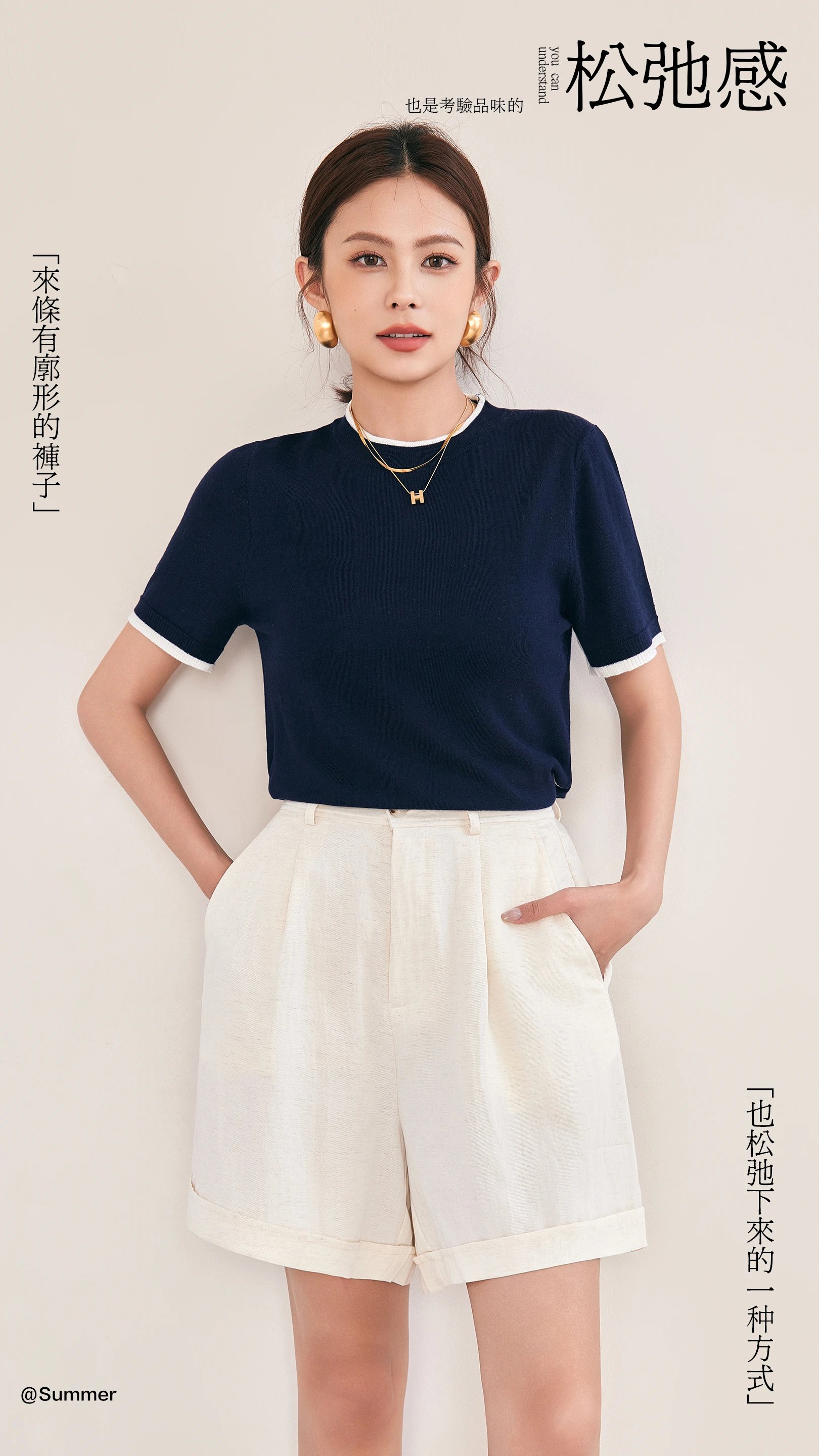 裤长恰好,得体自在。前后腰加入收省,修饰出微微打开的复古A字裤型,对于东方女性的跨部和臀围非常友好。