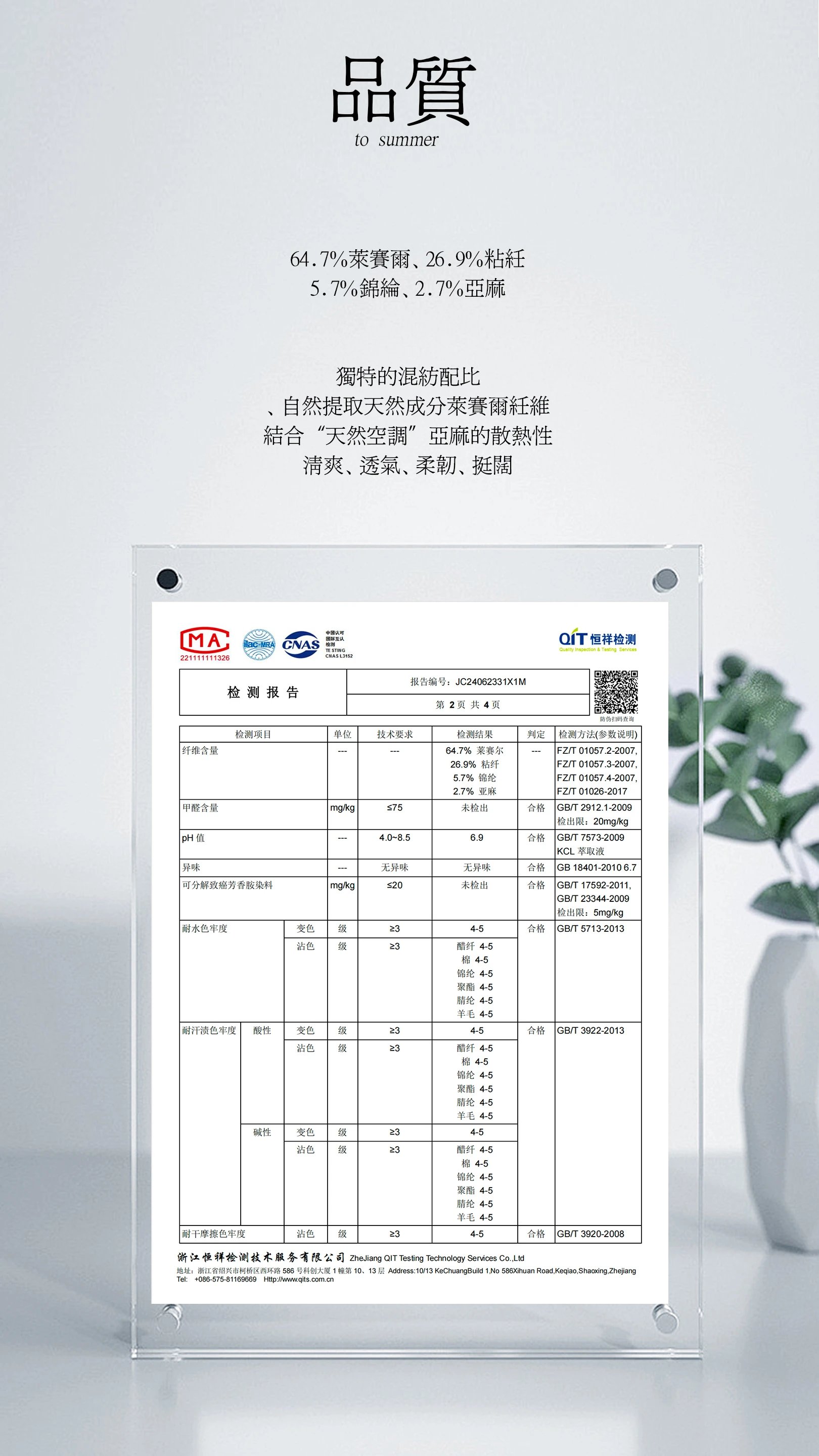 麻:强度高,吸湿性和透气性优异,能抑菌防螨除臭,带来凉爽感,风格休闲自然
