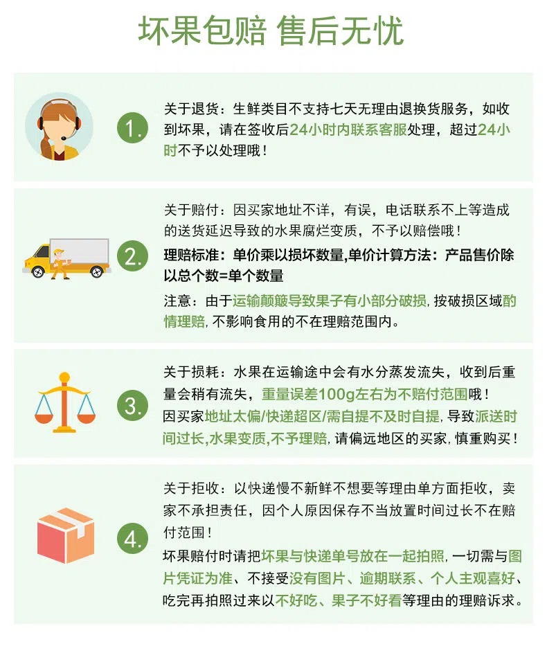 4、生鲜类不支持7天无理由退换货服务,因保质期短如有损坏请在签收后的24小时内拍照联系客服处理,超过24小时不予处理。
