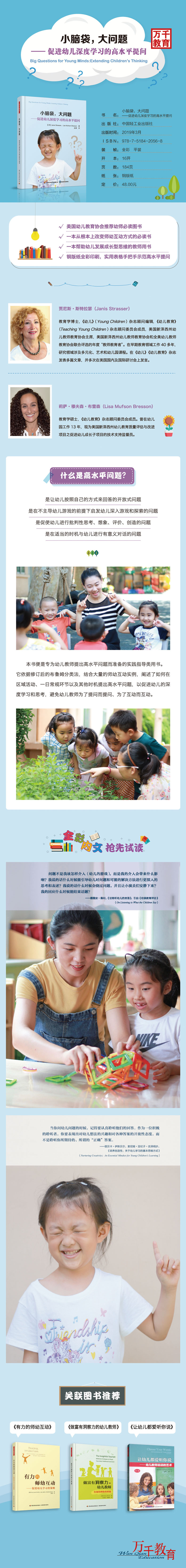 什么是高水平问题?高水平问题,是让幼儿按照自己的方式来回答的开放式问题。是在不主导幼儿游戏的前提下启发幼儿深入游戏和探索的问题,是促使幼儿进行批判性思考、想象、评价及创造的问题,是在适当的时机与幼儿进行有意义对话的问题。 贾尼斯·斯特拉瑟、莉萨·穆夫森·布雷森著的《小脑袋大问题--促进幼儿深度学习的高水平提问》便是专为幼儿教师提出高水平问题而准备的实践指导类用书。它依据修订后的布鲁姆分类法,结合大量的师幼互动实例,阐述了如何在区域活动、一日常规环节以及其他时机提出高水平问题,以促进幼儿的深度学习和思考,避免幼儿教师为了提问而提问、为了互动而互动。
