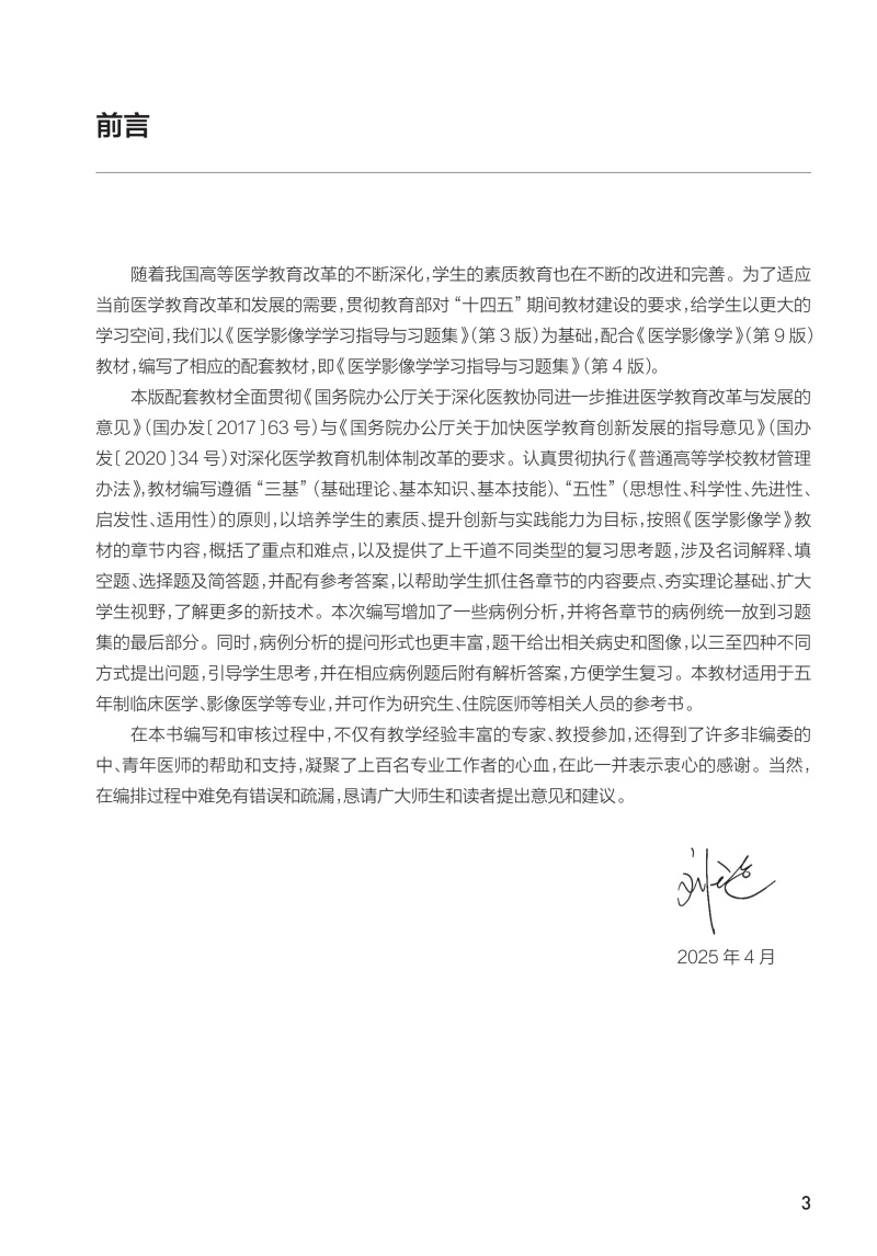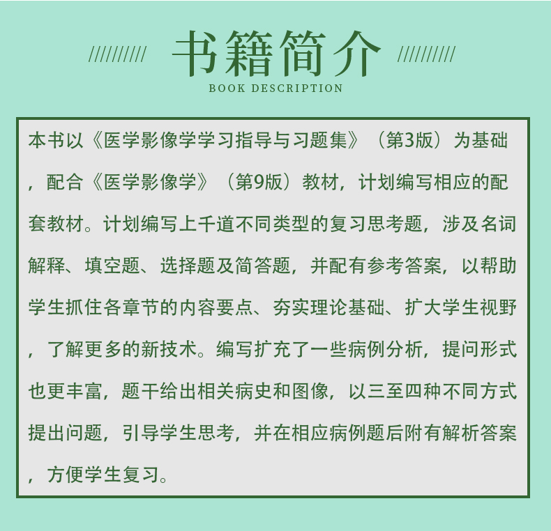 本书以《医学影像学学习指导与习题集》(第3版)为基础,配合《医学影像学》(第9版)教材,计划编写相应的配套教材。计划编写上千道不同类型的复习思考题,涉及名词解释、填空题、选择题及简答题,并配有参考答案,以帮助学生抓住各章节的内容要点、夯实理论基础、扩大学生视野,了解更多的新技术。编写扩充了一些病例分析,提问形式也更丰富,题干给出相关病史和图像,以三至四种不同方式提出问题,引导学生思考,并在相应病例题后附有解析答案,方便学生复习。