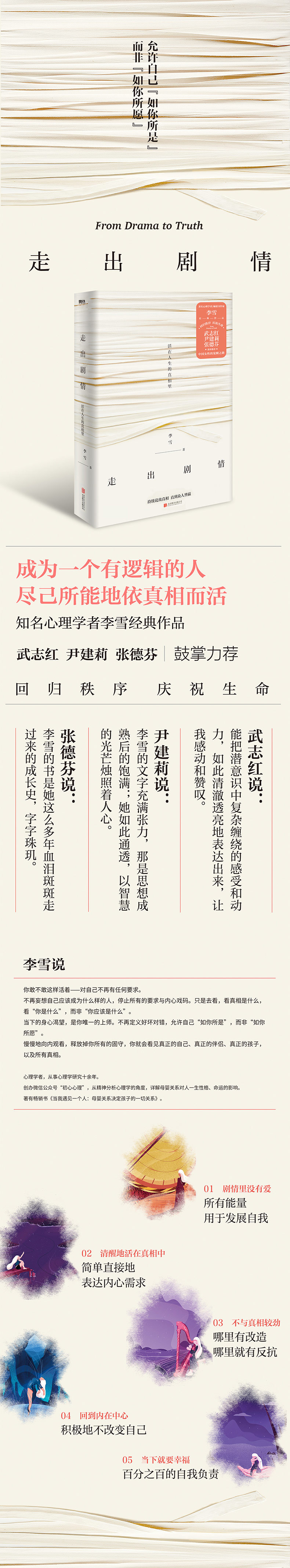 李雪的书是她这么多年血泪斑斑走过来的成长史,字字珠玑,她不断剥落自己身上的虚无,也一直在面对那个“总是想要变得更好”的自己。相信所有愿意敞开心去阅读她的书的读者,都能从字里行间感受到她的真实、犀利、智慧和勇气。 ——张德芬 畅销书作家