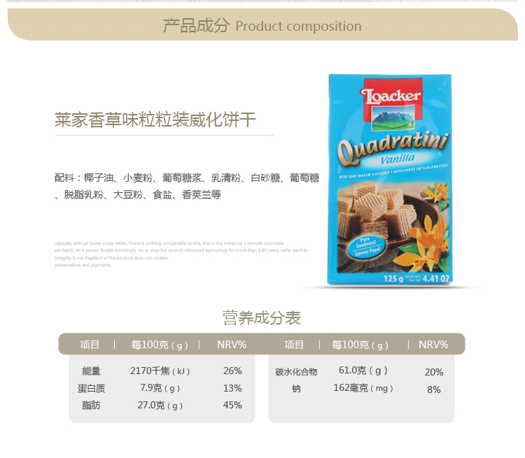 规格:125g 产地:奥地利 包装尺寸信息:95*64*158mm 保质期:540天 储存条件:存放于干燥阴凉处 |