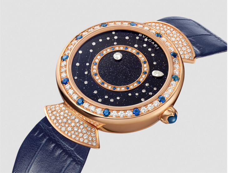 镜面 材质 | 蓝宝石水晶玻璃 | 表盘 | 18k玫瑰金表壳,镶嵌明亮式切割钻石和圆形切割钻石。 蓝色表盘,镶嵌钻石。 钻石时标 |
