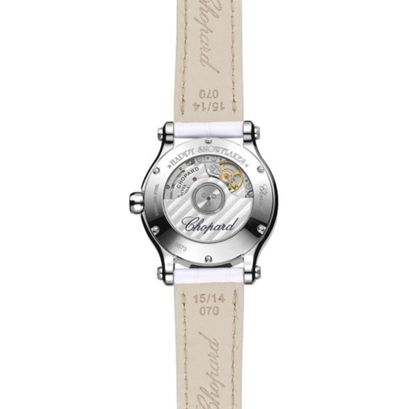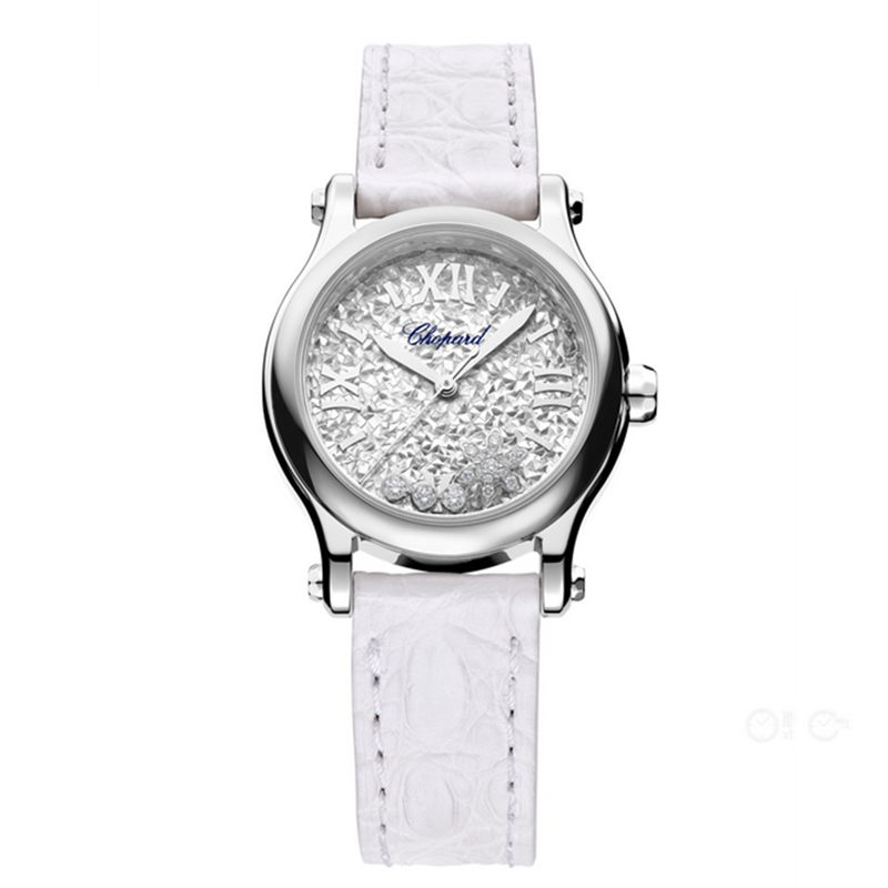镜面材质 | 蓝宝石水晶玻璃 | 表盘 | 精钢表壳 银色锤锻表盘,3颗灵动钻石和1枚以符合Chopard萧邦可持续发展和社会责任理念的白18K金打造的活动雪花,镶嵌钻石;镀铑罗马数字;镀铑锥形时针和分针;镀金棒形秒针 透底 |