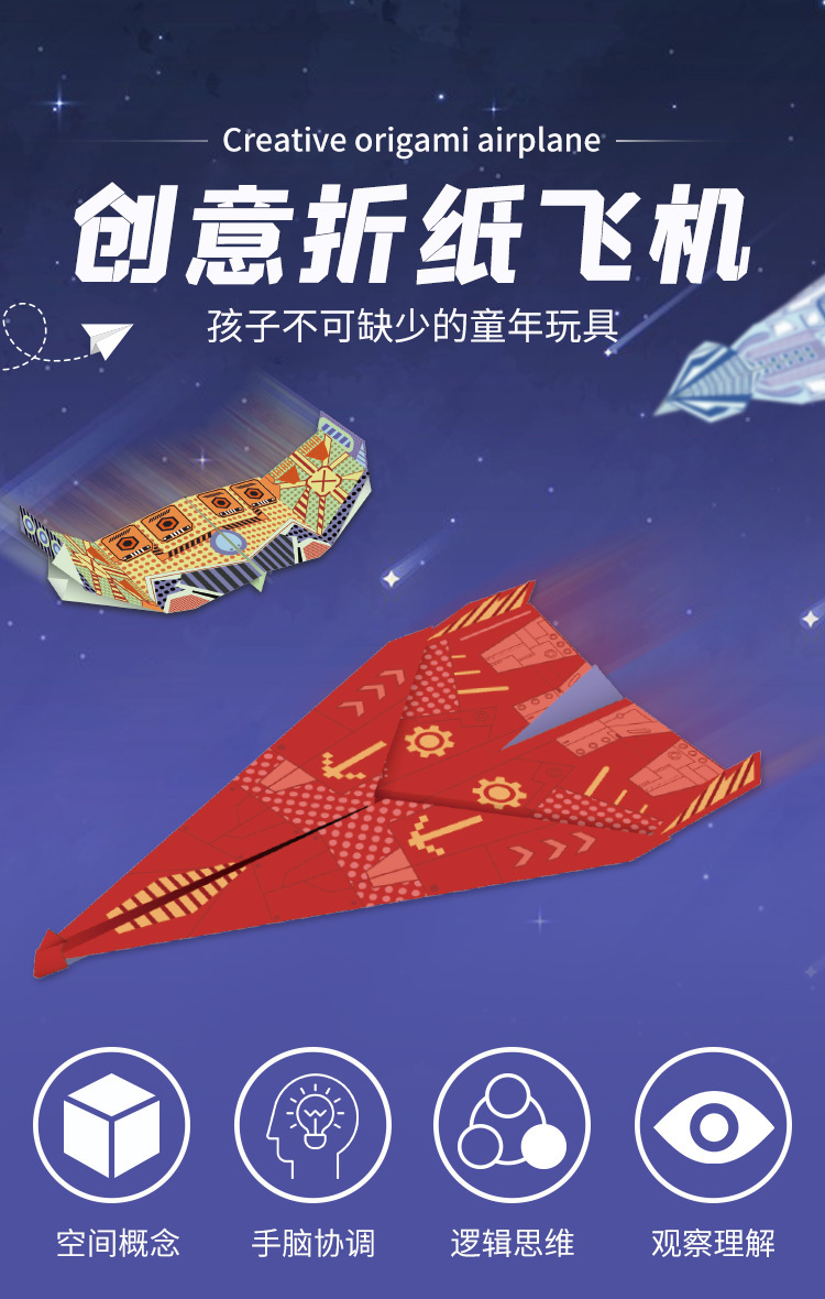 【商品名称】创意折纸飞机 【发货时效】48h内发货 【物流说明】西藏、新疆、内蒙不发,北上+1 【售后说明】1.商品非质量问题不支持退换;2.质量、缺件问题请签收后48小时内反馈,过期无法为您处理喔;3.快递送货外观有严重破损的请拒收;4.随机赠品不在售后范围内;5.买家原因拦截拒收退回扣4元。 特别提醒:物流异常问题,比如无信息更新、退件等,请于发货后1个月内反馈,超过1个月不做处理!