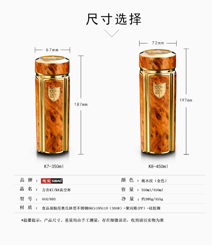 思宝方舟K7/K8真空杯镀金商务高档礼盒装男女办公泡茶保温水杯