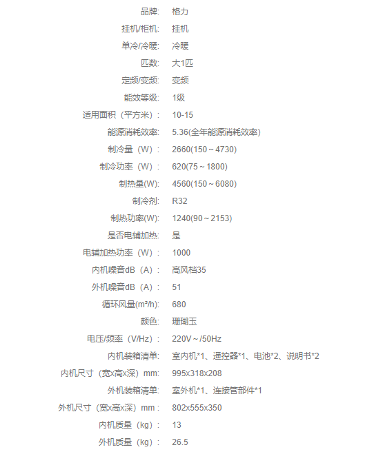格力·星梦变频冷暖大1匹1级能效挂机空调 KFR-26GW/(26518)FNhAa-B1(WIFI)(珊瑚玉)