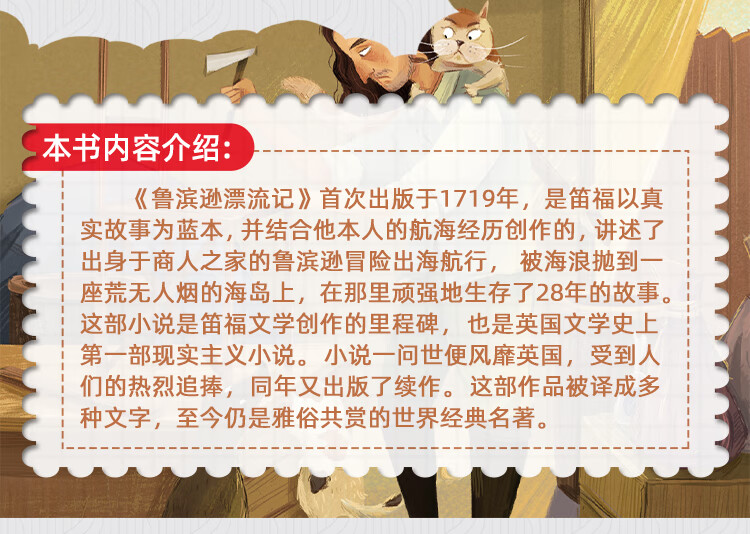 《鲁滨逊漂流记》首次出版于1719年,是笛福以真实故事为蓝本,并结合他本人的航海经历创作的,讲述了出身于商人之家的鲁滨逊冒险出海航行,被海浪抛到一座荒无人烟的海岛上,在那里顽强地生存了28年的故事。这部小说是笛福文学创作的里程碑,也是英国文学史上第一部现实主义小说。小说一问世便风靡英国,受到人们的热烈追捧,同年又出版了续作。这部作品被译成多种文字,至今仍是雅俗共赏的世界经典名著。