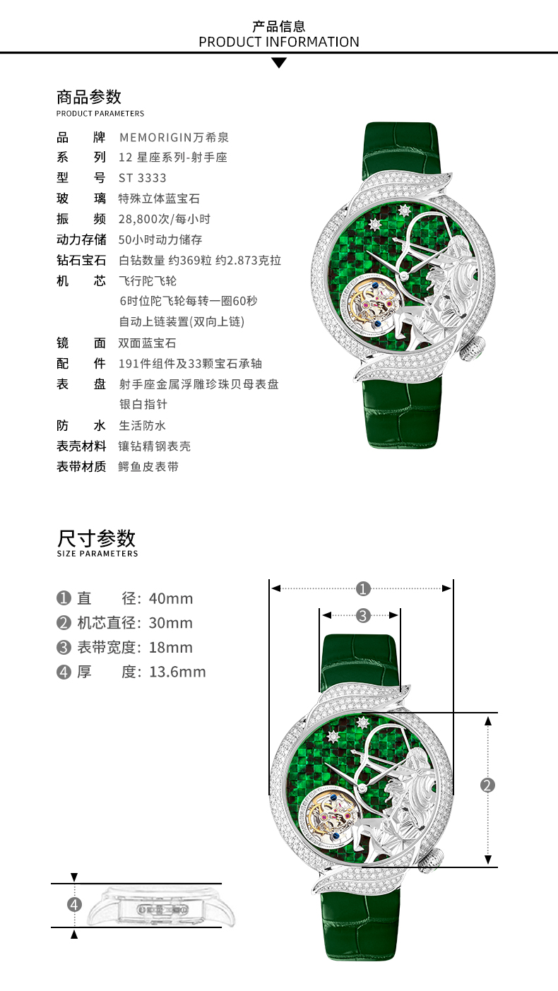 MEMORIGIN万希泉12星座系列射手座陀飞轮钻石腕表机械表镂空手表