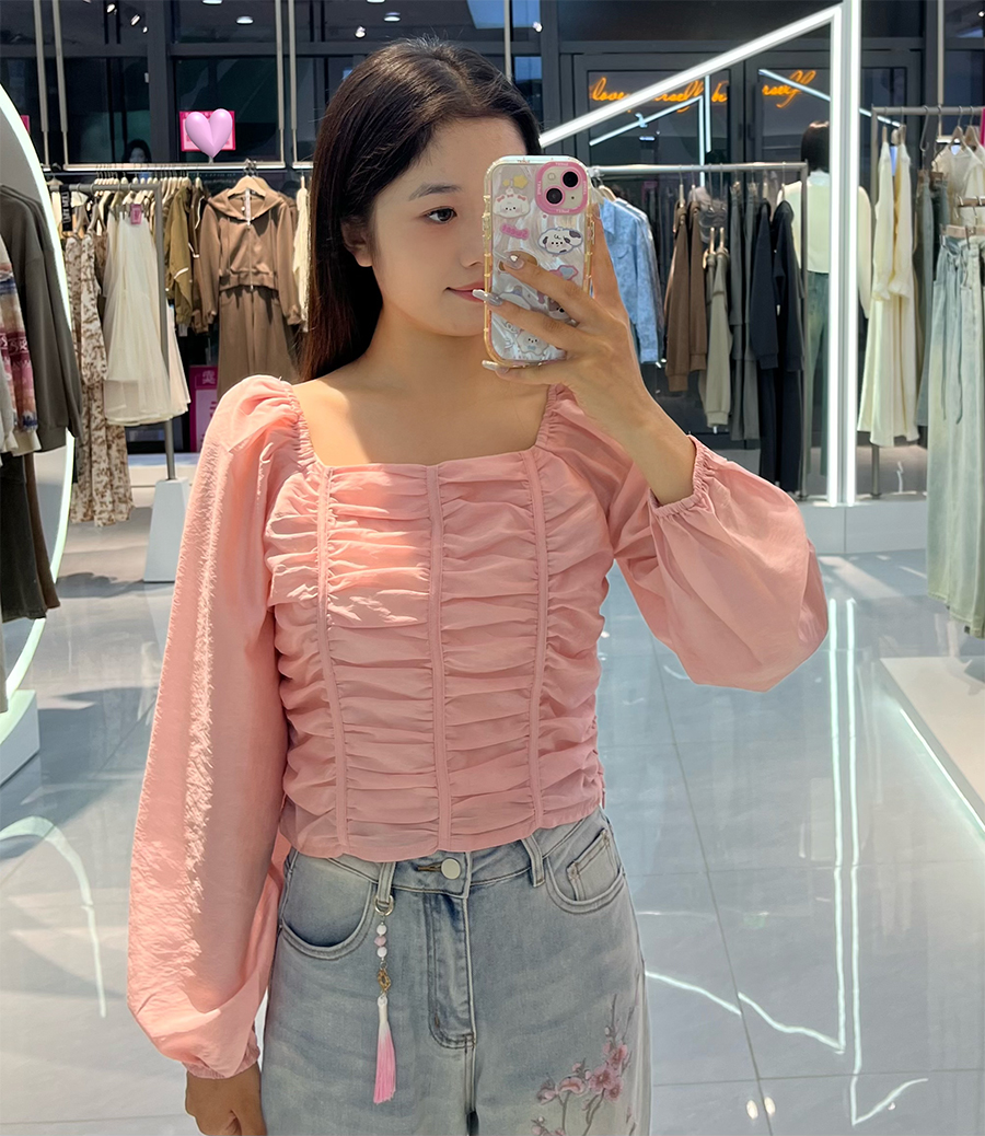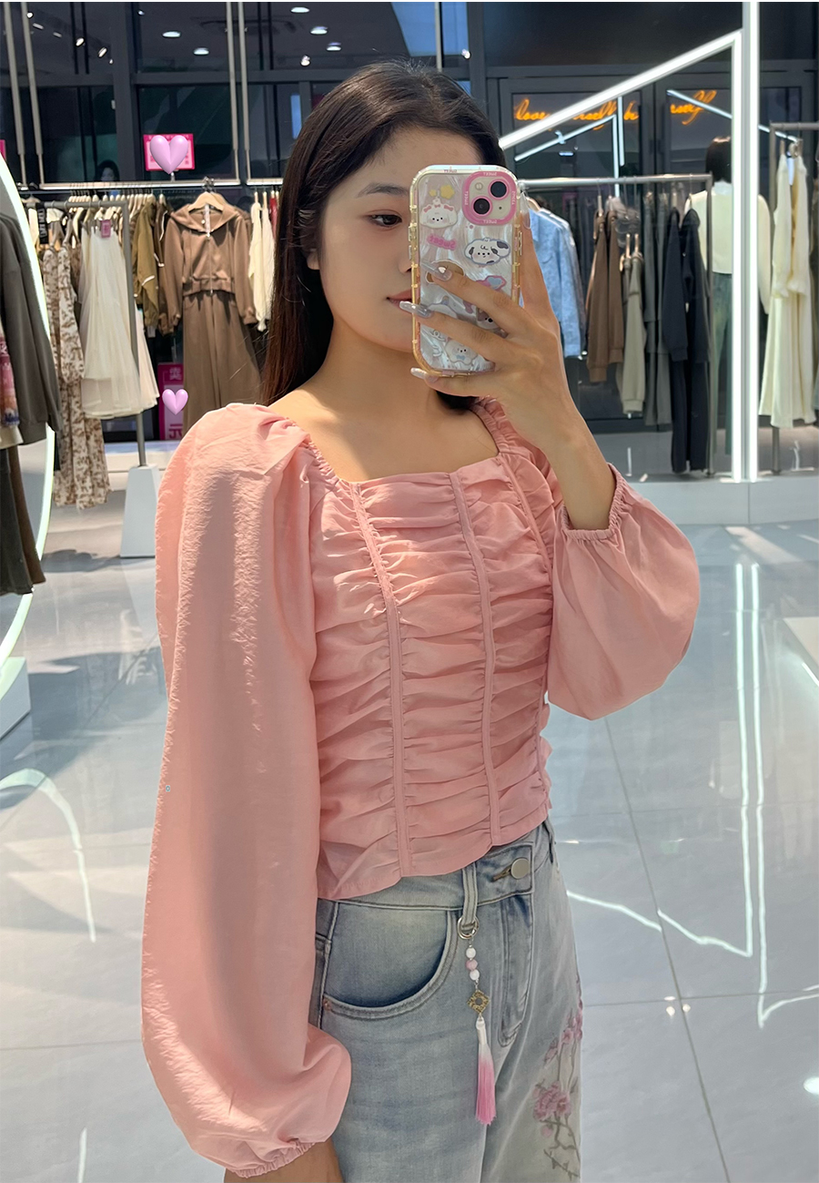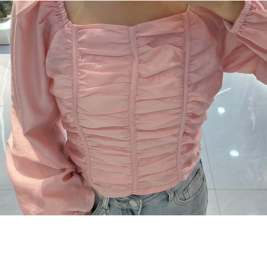 P&X设计师女装秋季方领长袖褶皱气质短款小衫 824328097 粉色