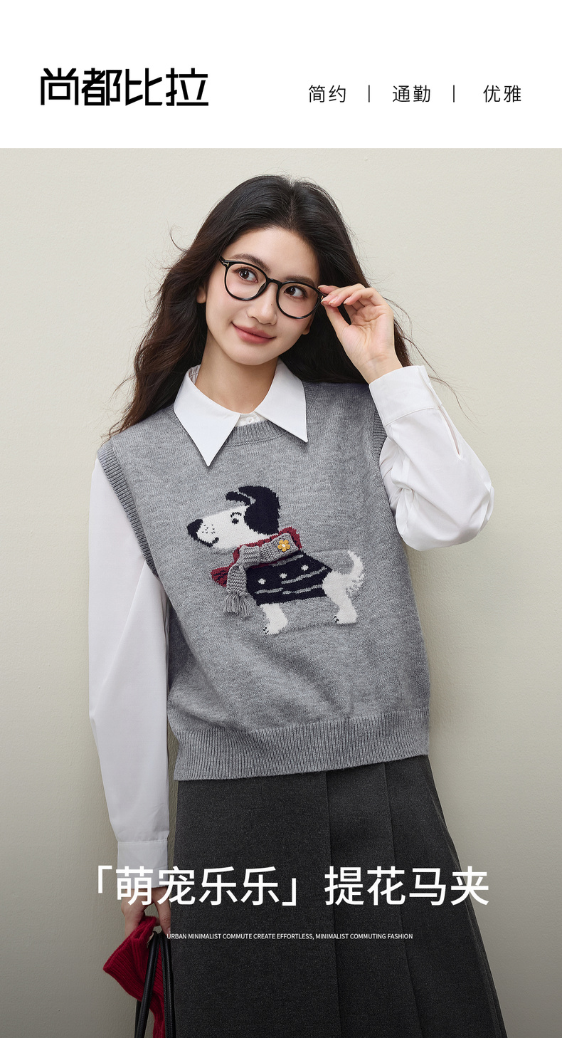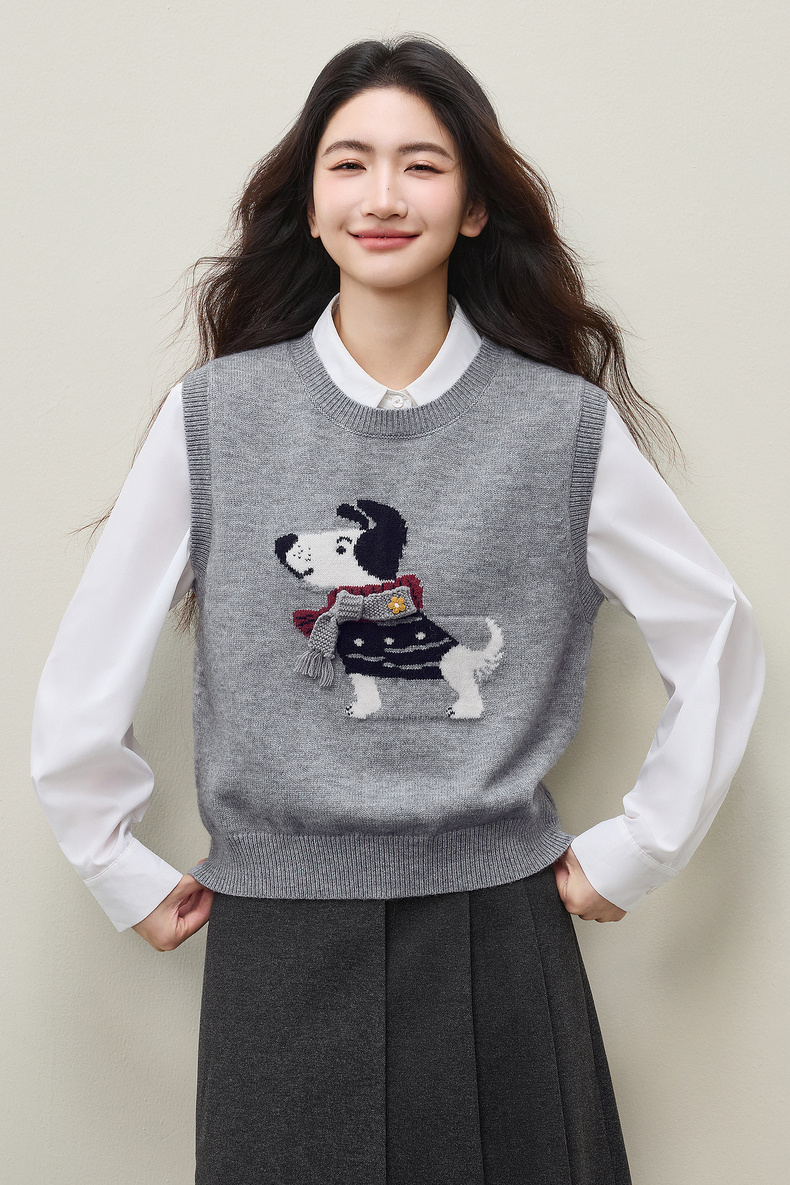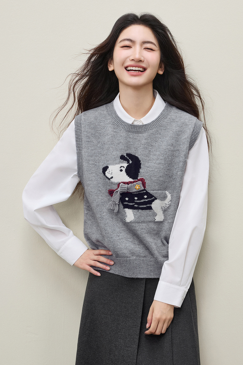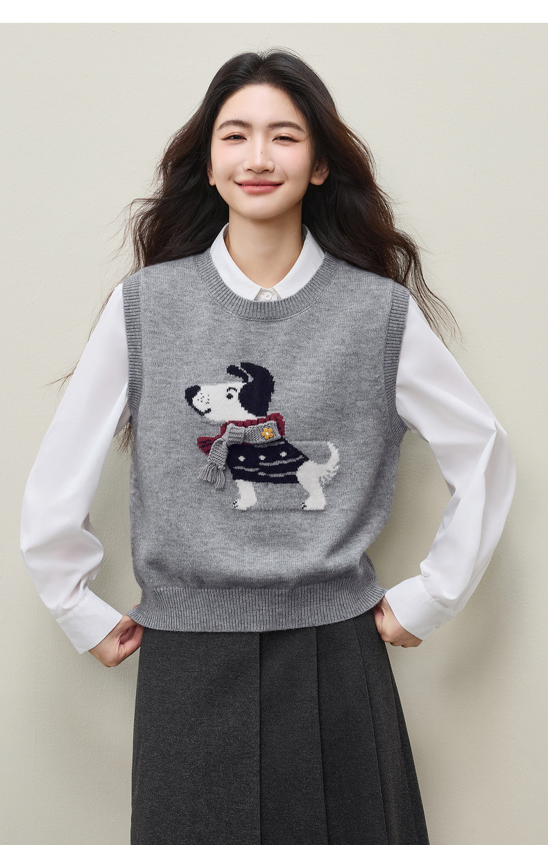 【内购】【萌宠乐乐】休闲通勤圆领提花小狗图案弹力厚穿三季毛织马夹-W54JB5368