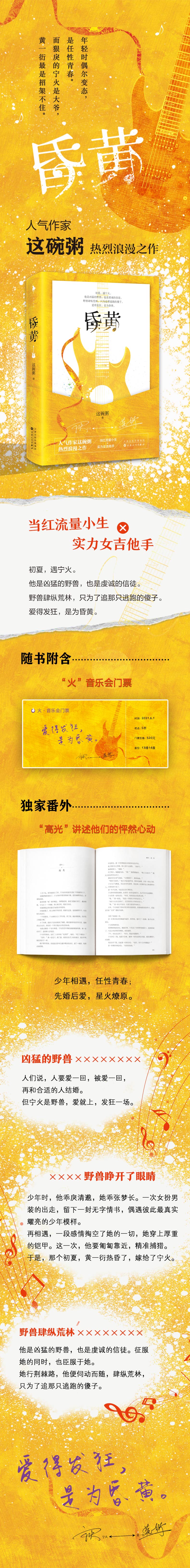 ☆少年相遇,任性青春;先婚后爱,星火燎原。 ☆人气作家这碗粥热烈浪漫之作!当红流量小生×实力女吉他手! ☆初夏,遇宁火。他是凶猛的野兽,也是虔诚的信徒。 野兽肆纵荒林,只为了追那逃跑的傻子。 ☆爱得发狂,是为昏黄。 ☆独家番外——“高光”讲述他们的怦然心动。随书附赠“火”音乐会门票。 ☆小说《昏黄》是人气作者这碗粥热烈而浪漫的作品,讲述了当红流量小生宁火和实力女吉他手黄一衍先婚后爱的都市爱情故事。 宁火是一个凶猛的“野兽”,也是虔诚的“信徒”,遇到黄一衍,爱上黄一衍,是他的劫,是他的命,更是他不顾一切也要得到的美好。而黄一衍,冷静性感,果敢飒爽,宁火于她,是深渊,亦是天堂。 本书的调性,张扬,爆裂,青春,热辣都深受读者的喜欢,而独家番外高光则如一汪清泉重塑怦然心动的时刻,读者万分期待。
