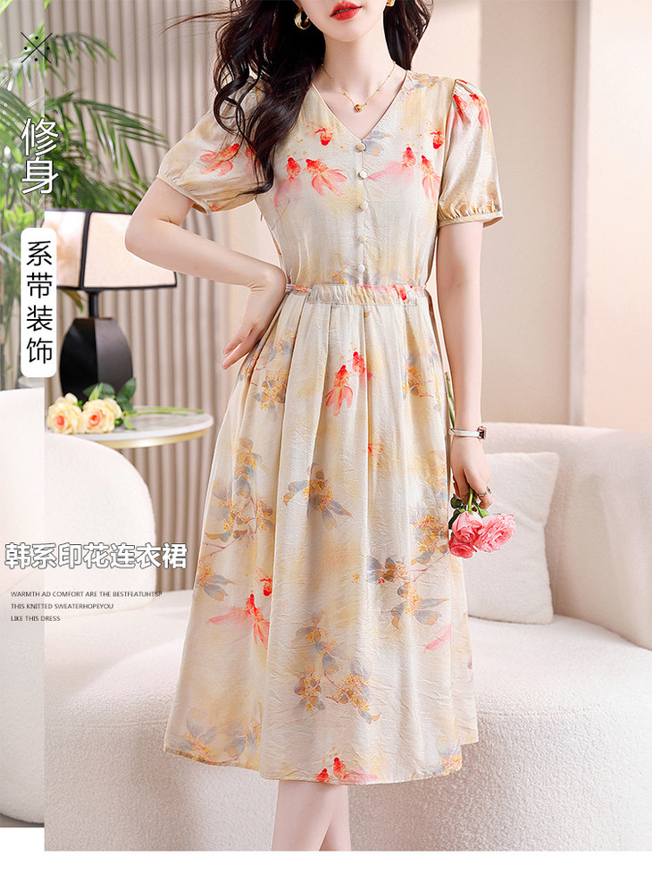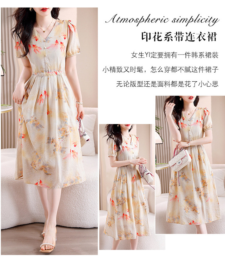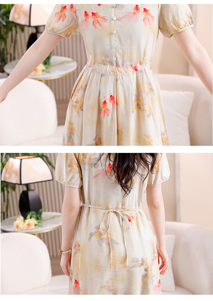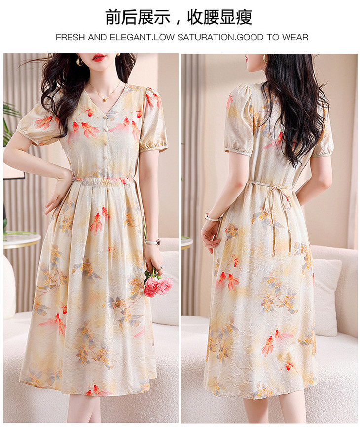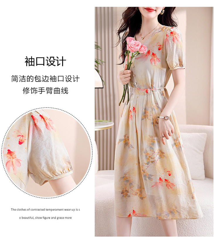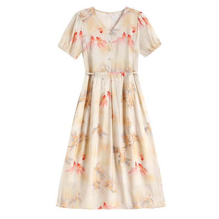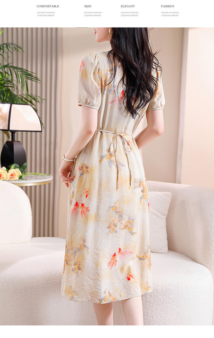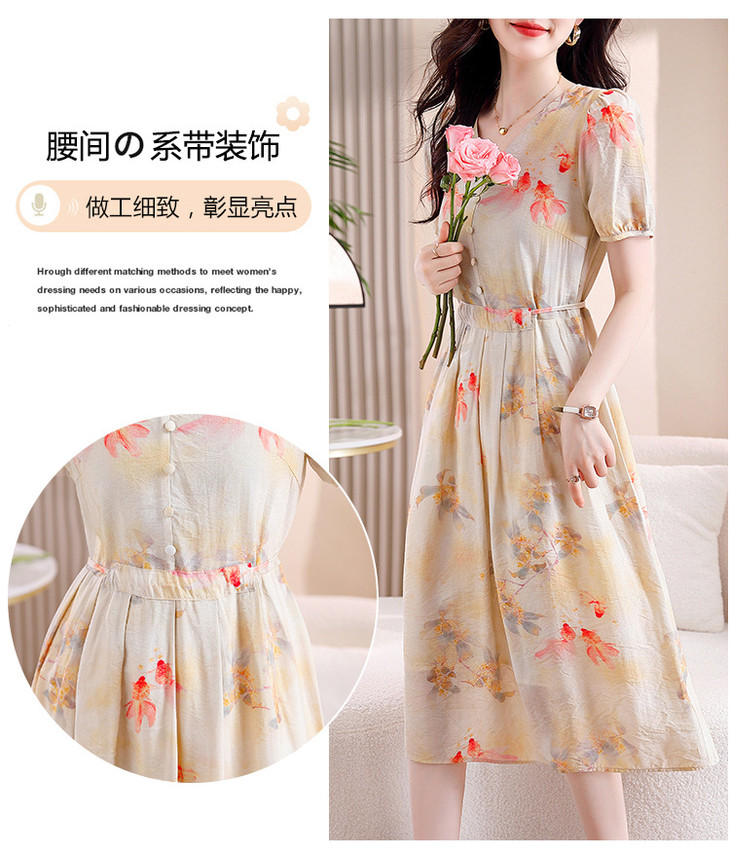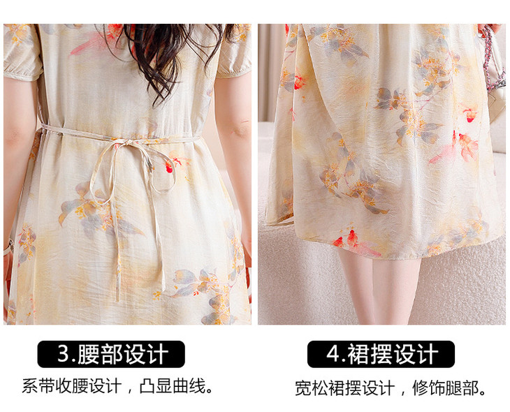 新中式短袖仿真丝印花系带连衣裙AHM-zmdm9641