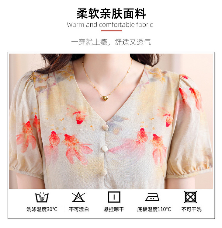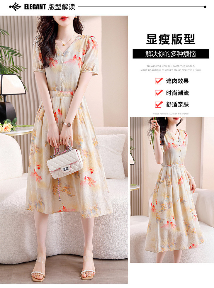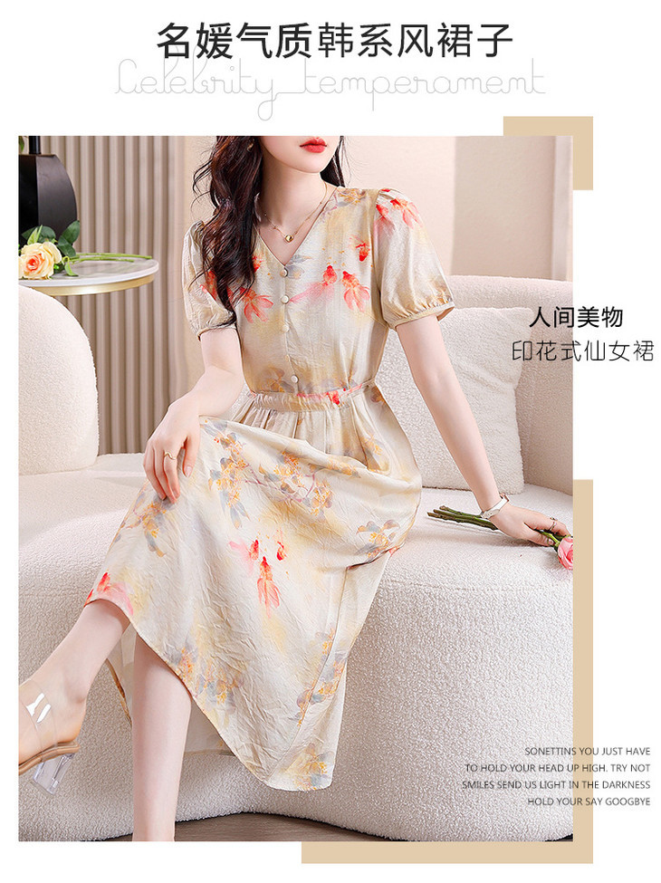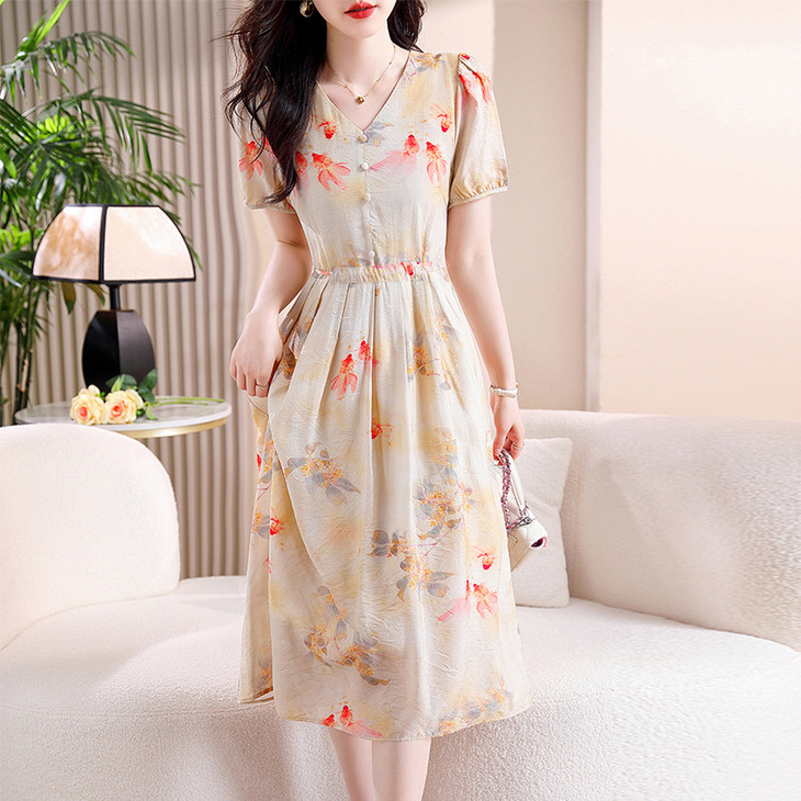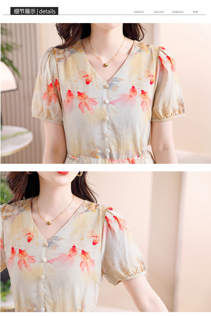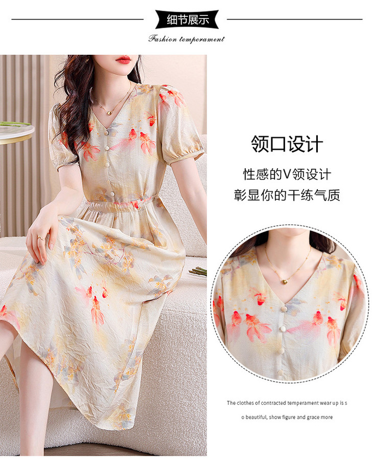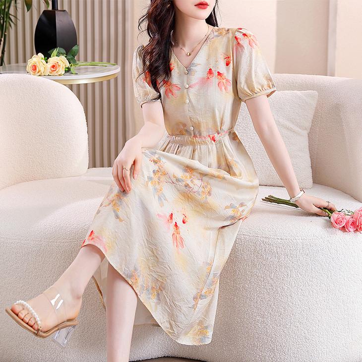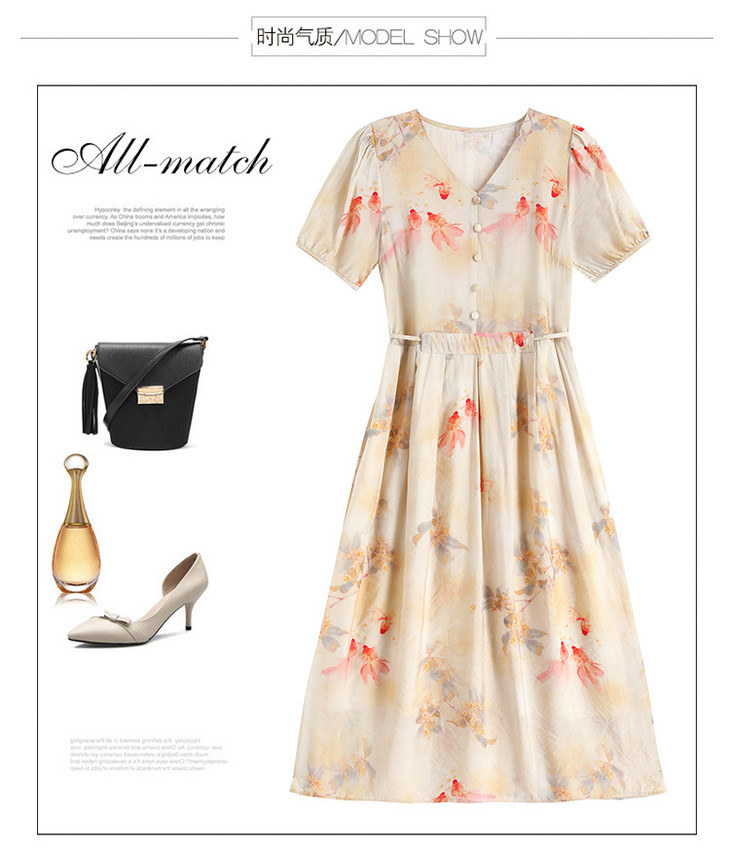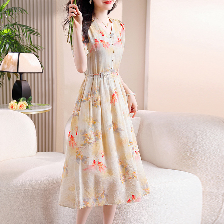 新中式短袖仿真丝印花系带连衣裙AHM-zmdm9641