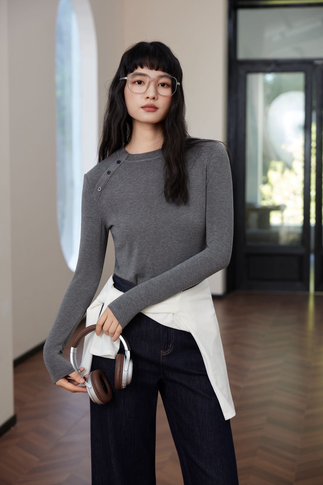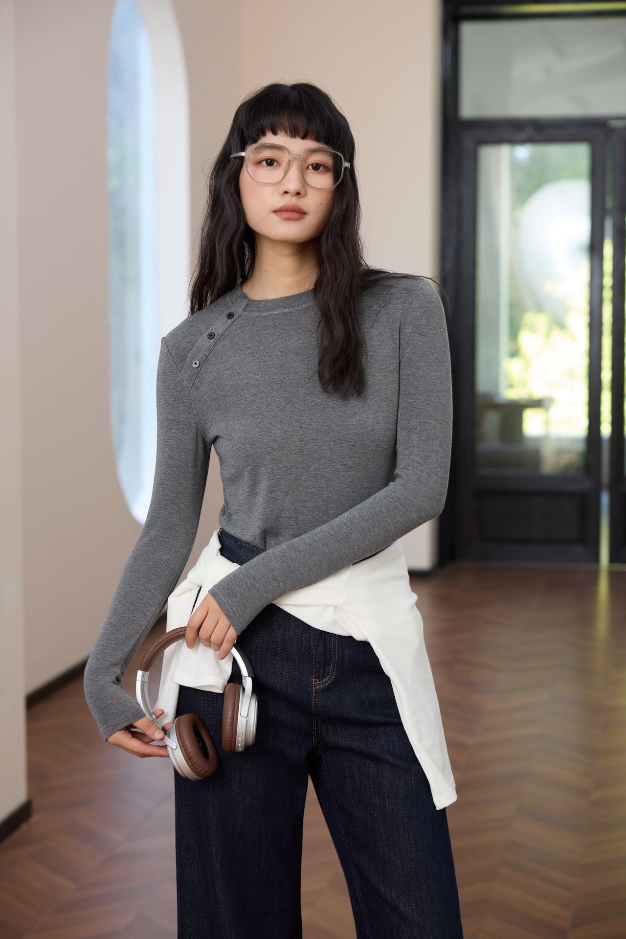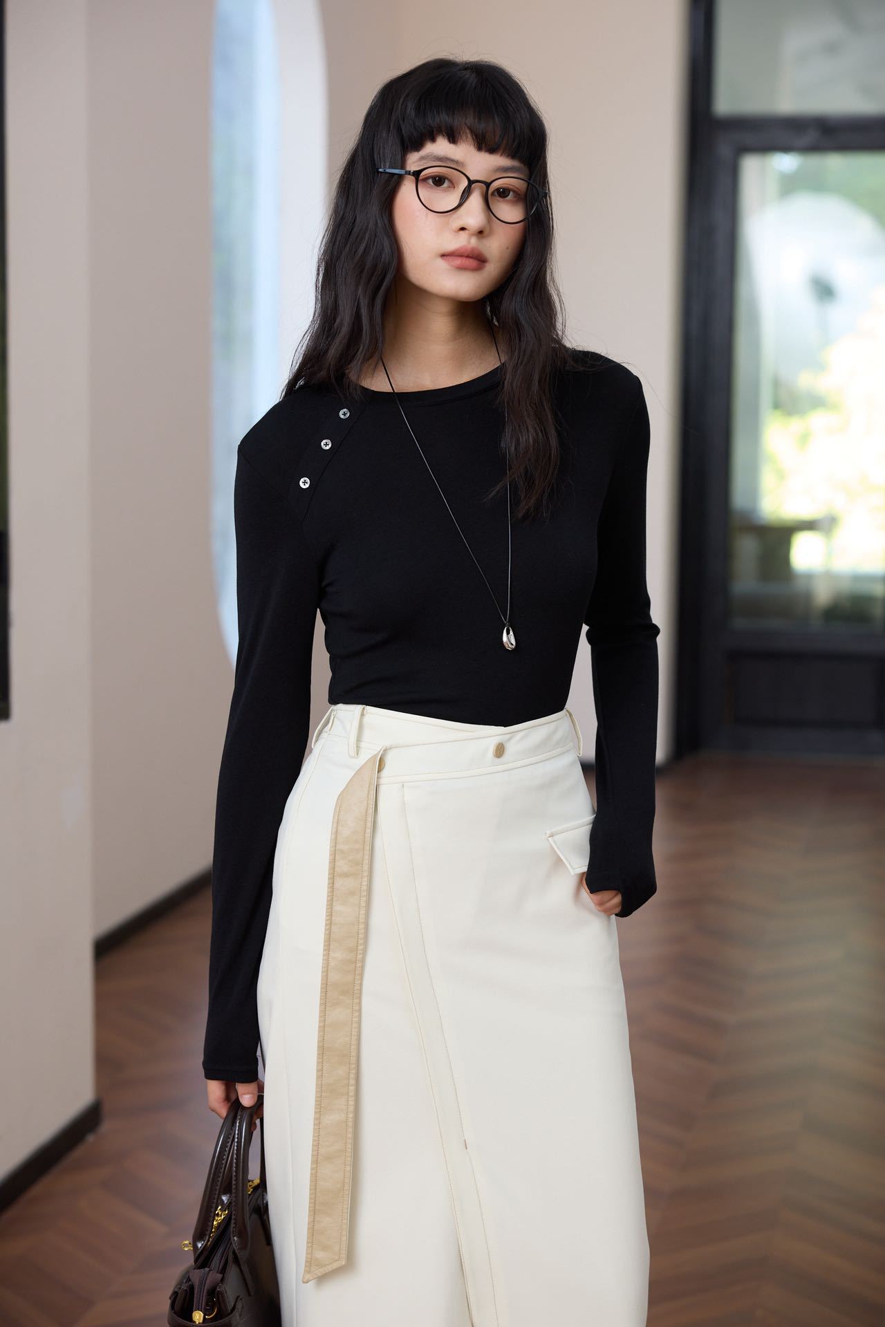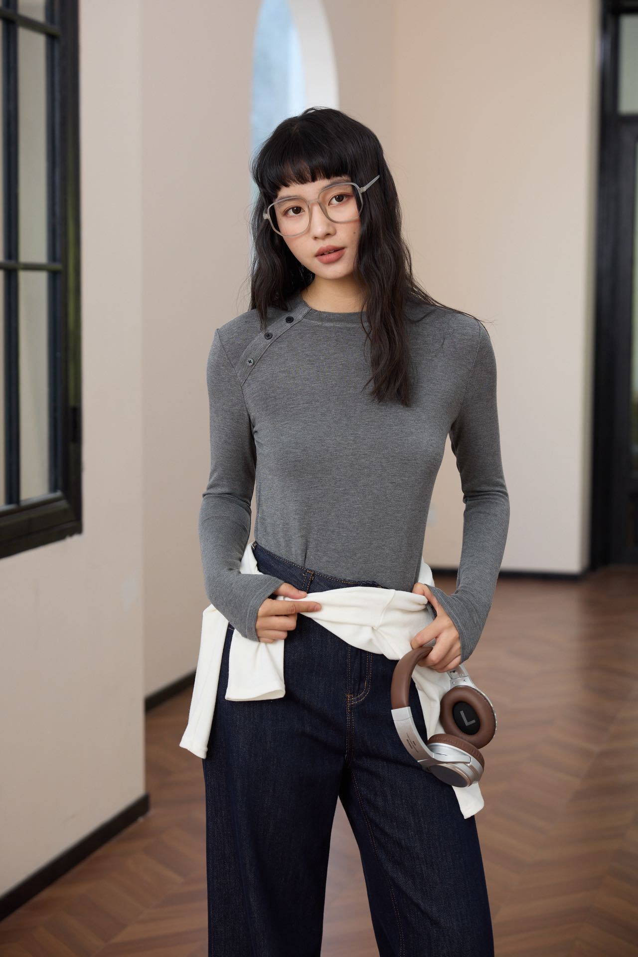 会呼吸的面料【春夏天丝羊毛轻奢打底衫】领口不对称设计打扣圆领衫 羊毛休闲打底衫撸猫衫