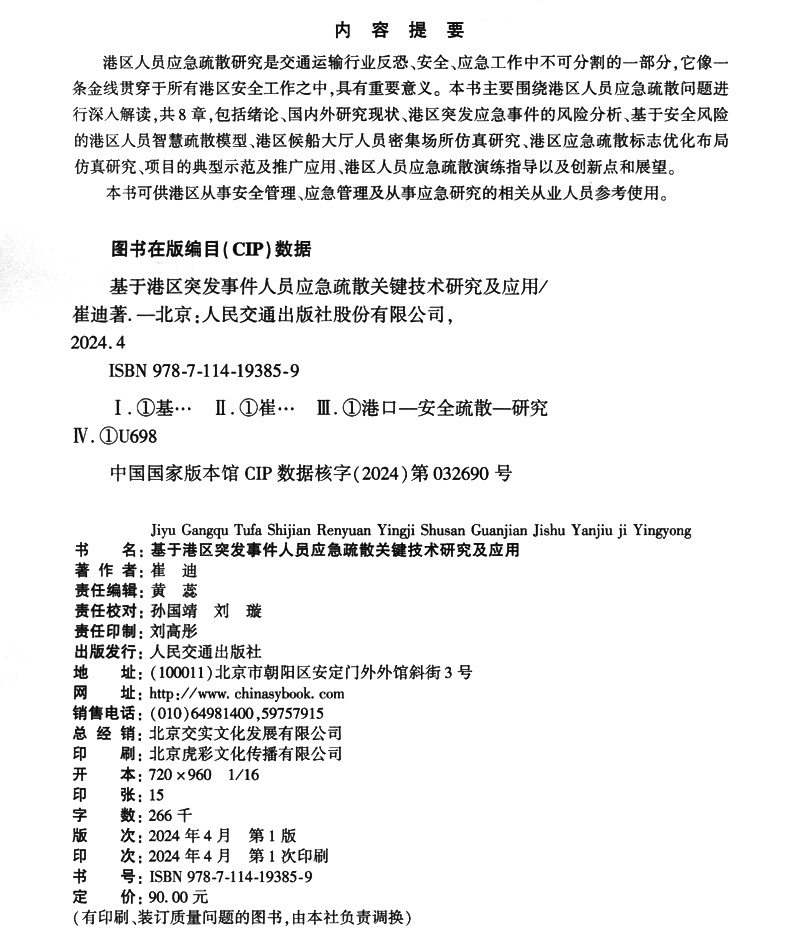 书名:基于港区突发事件人员应急疏散关键技术研究及应用