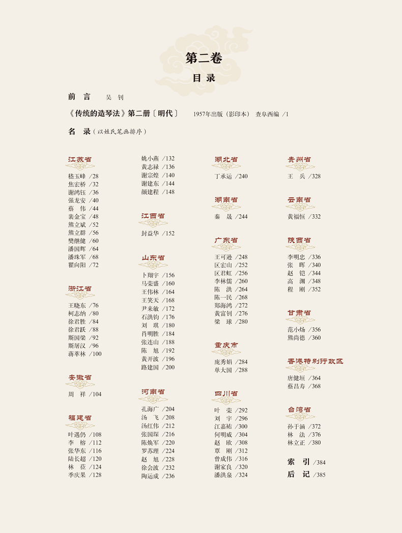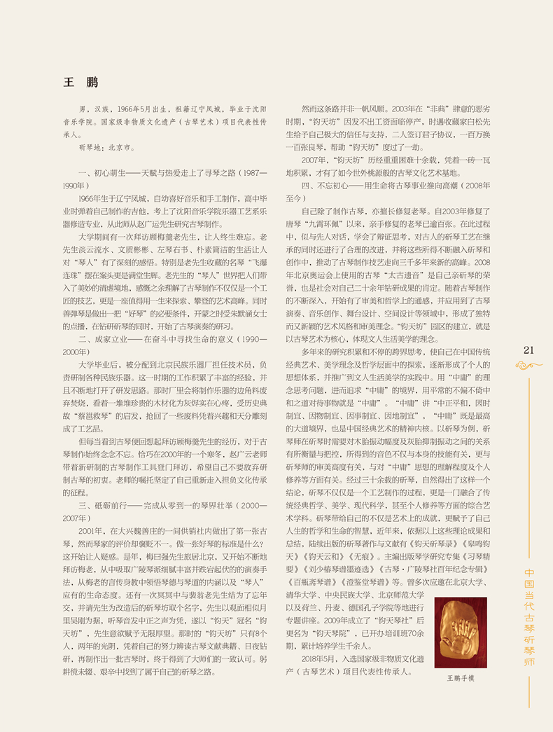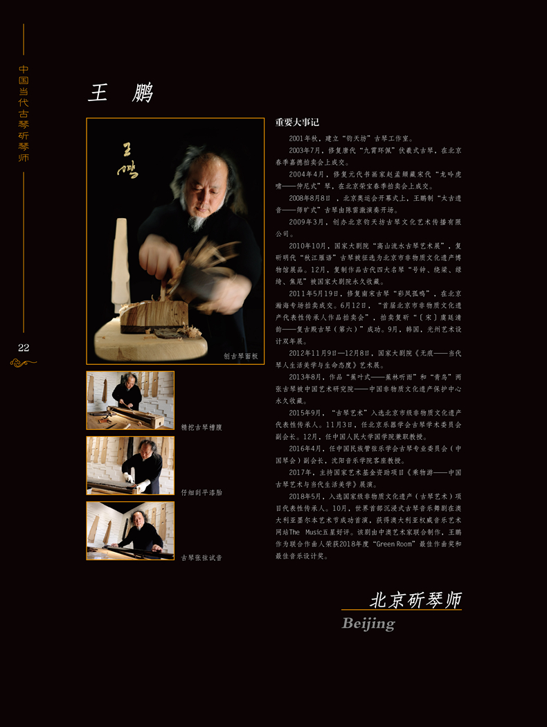 本书是一部全面记述当代中国古琴斫琴师的琴学类著作。斫琴师,中国制作古琴造诣至臻之人,他们是非物质文化遗产保护事业中值得关注的特定群体,在中国琴文化的发展与传播中有着举足轻重的地位。该作记录了当代中国(包括港台地区)具有代表性的古琴斫琴工匠172人,以精美的图片、自传纪实的形式对斫琴工匠们制琴经历、工艺传承、钻研探索等事项进行了客观详实的记录。细致描述了斫琴师们继承传统、钻研探索、恢复自唐代以来古琴斫制的工艺特点、音色特性、人文品质等丰富、生动的内容。