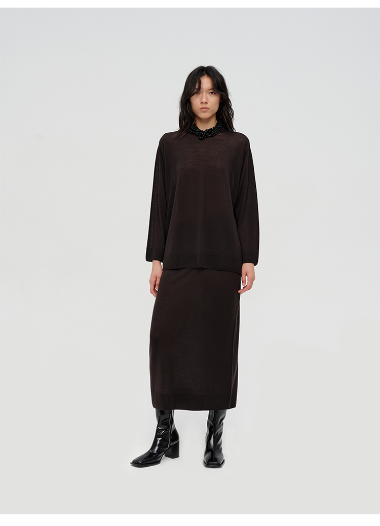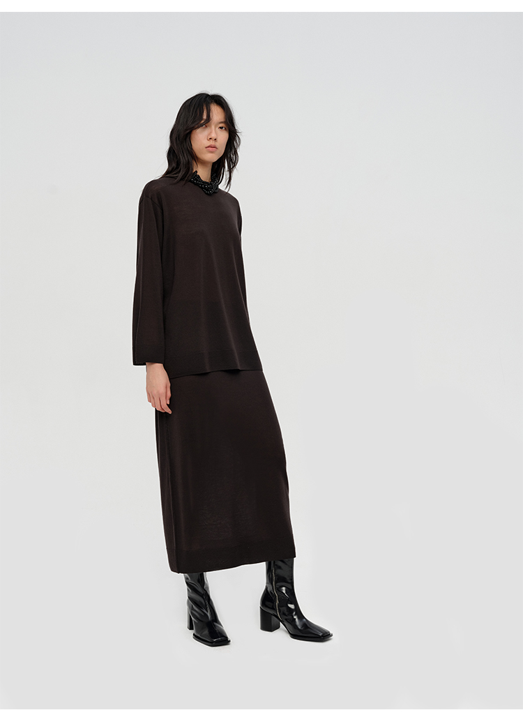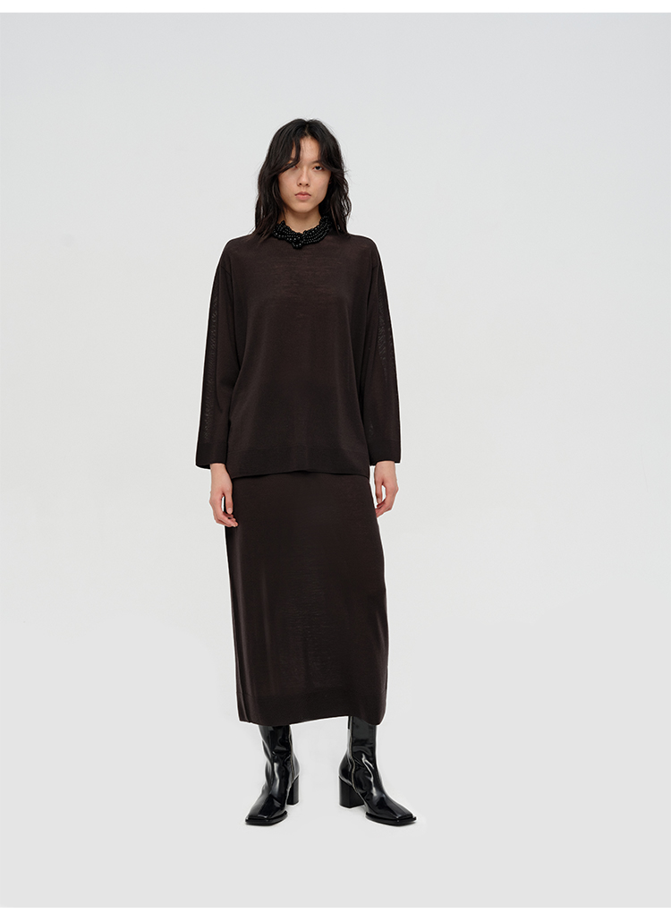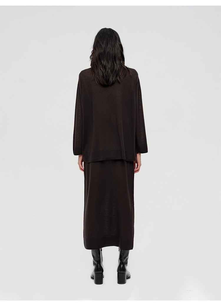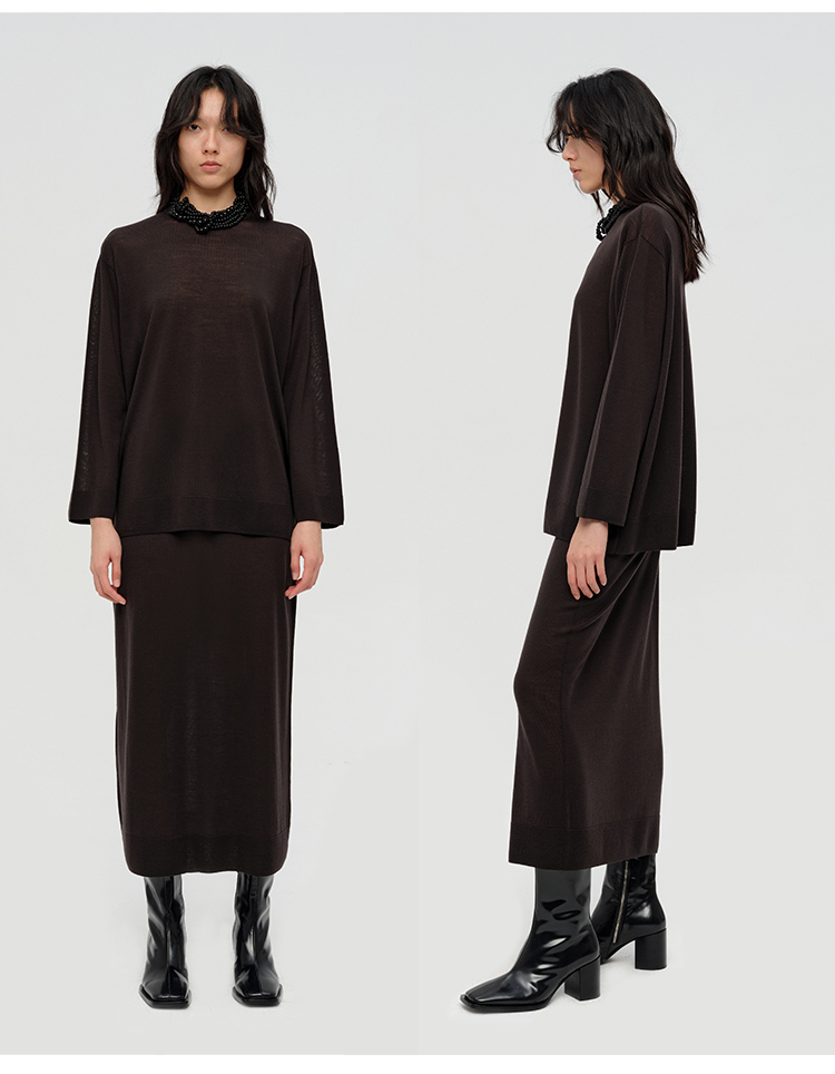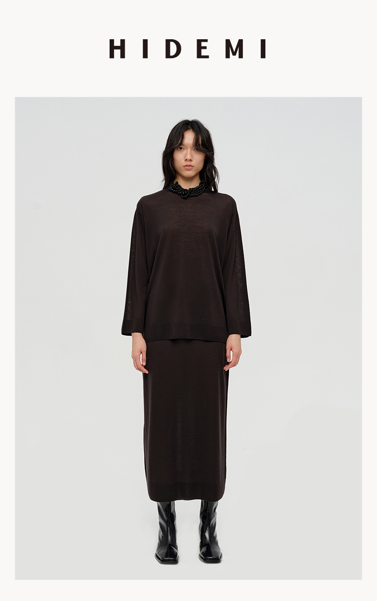 HIDEMI 澳洲进口美利奴羊毛系列60支极细精纺羊毛极简圆领廓形感毛衣半裙套装 乌木棕/深烟灰
