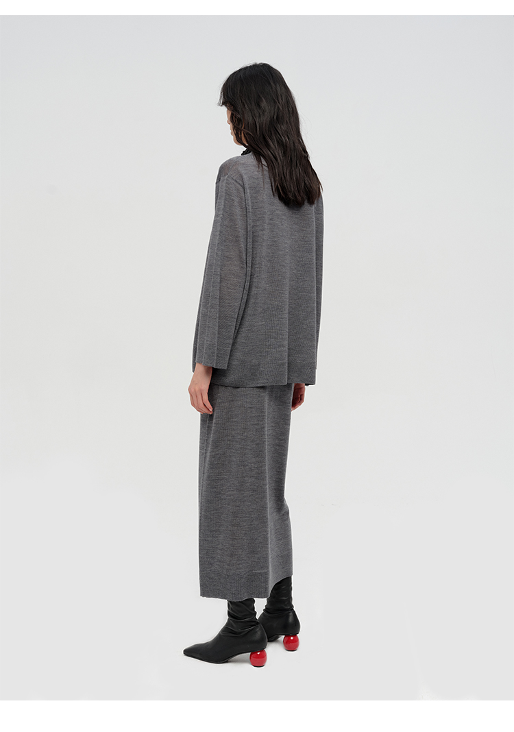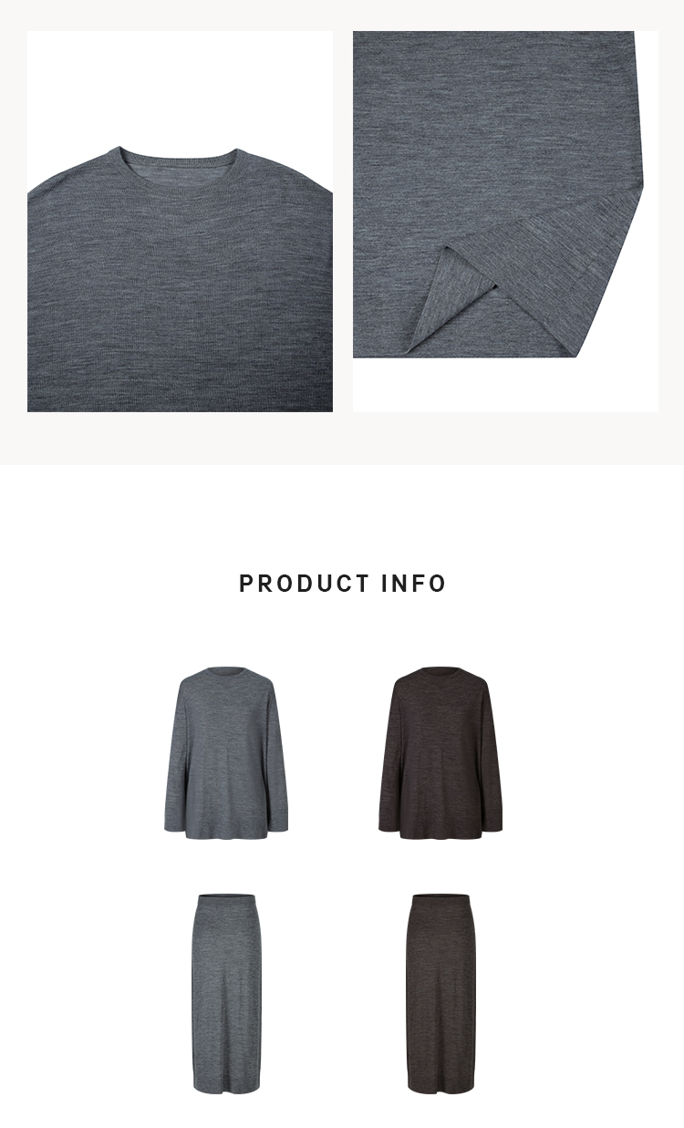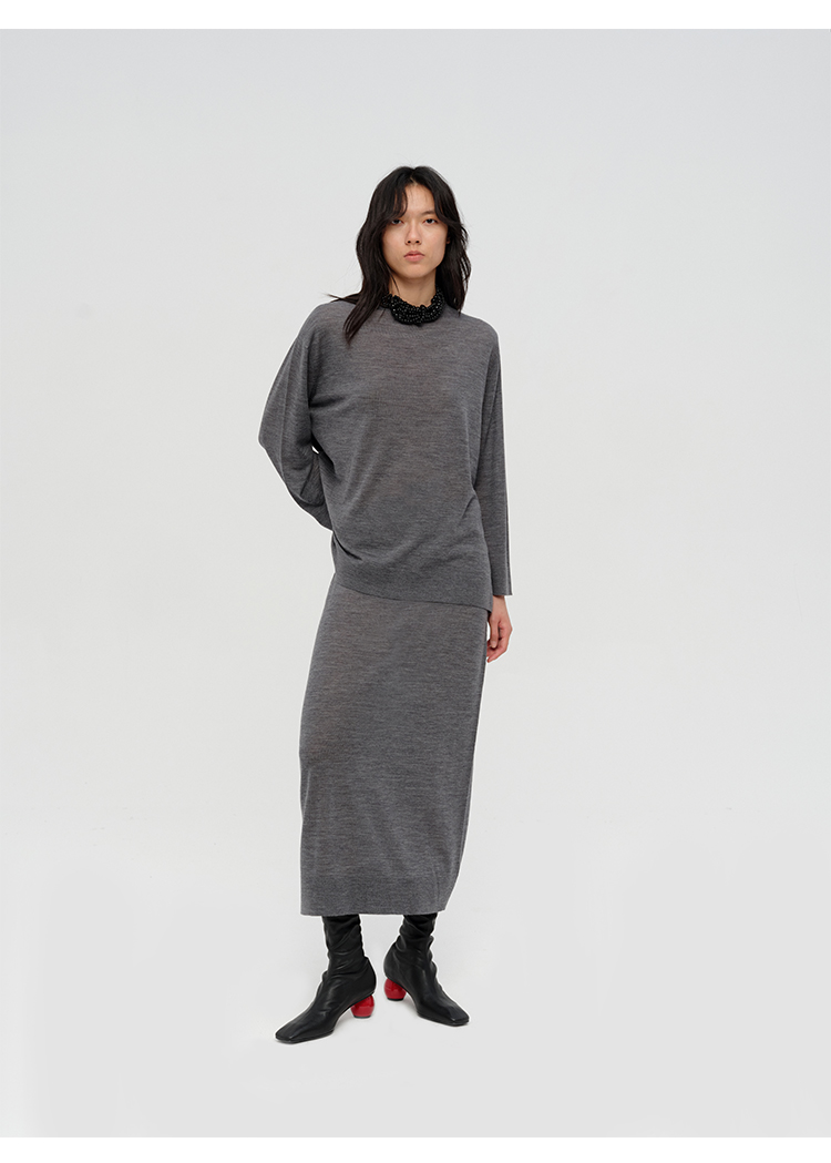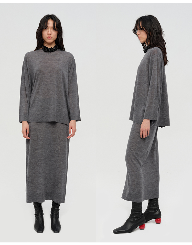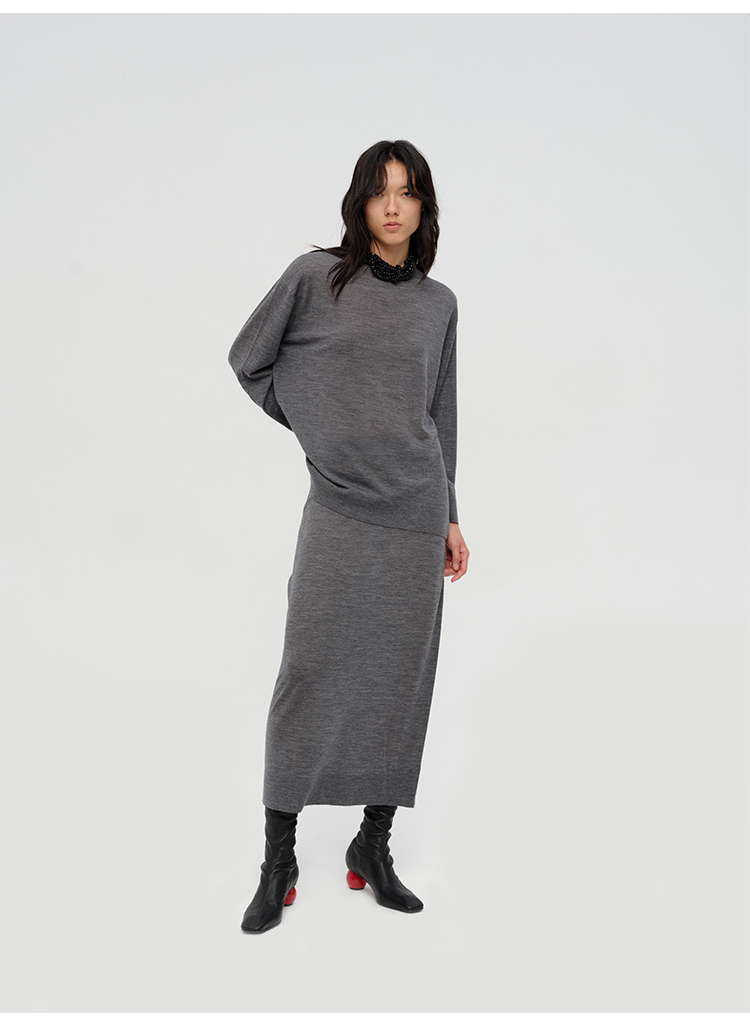 HIDEMI 澳洲进口美利奴羊毛系列60支极细精纺羊毛极简圆领廓形感毛衣半裙套装 乌木棕/深烟灰