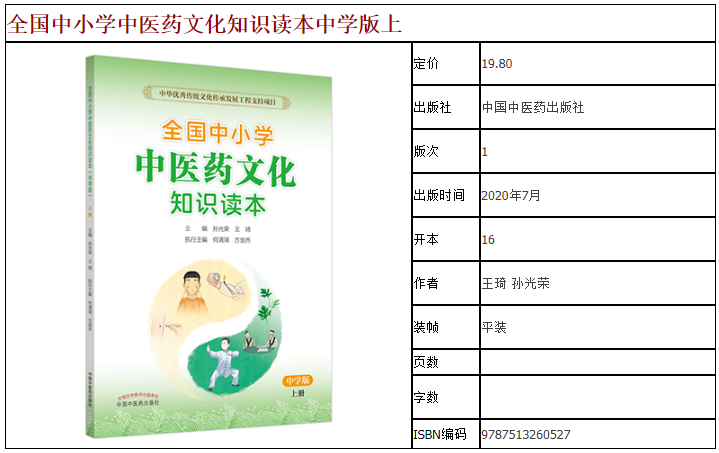 全国中小学中医药文化知识读本中学版上 王琦 孙光荣编 中华优秀传统文化传承发展工程支持项目 9787513260527中国中医药出版社
