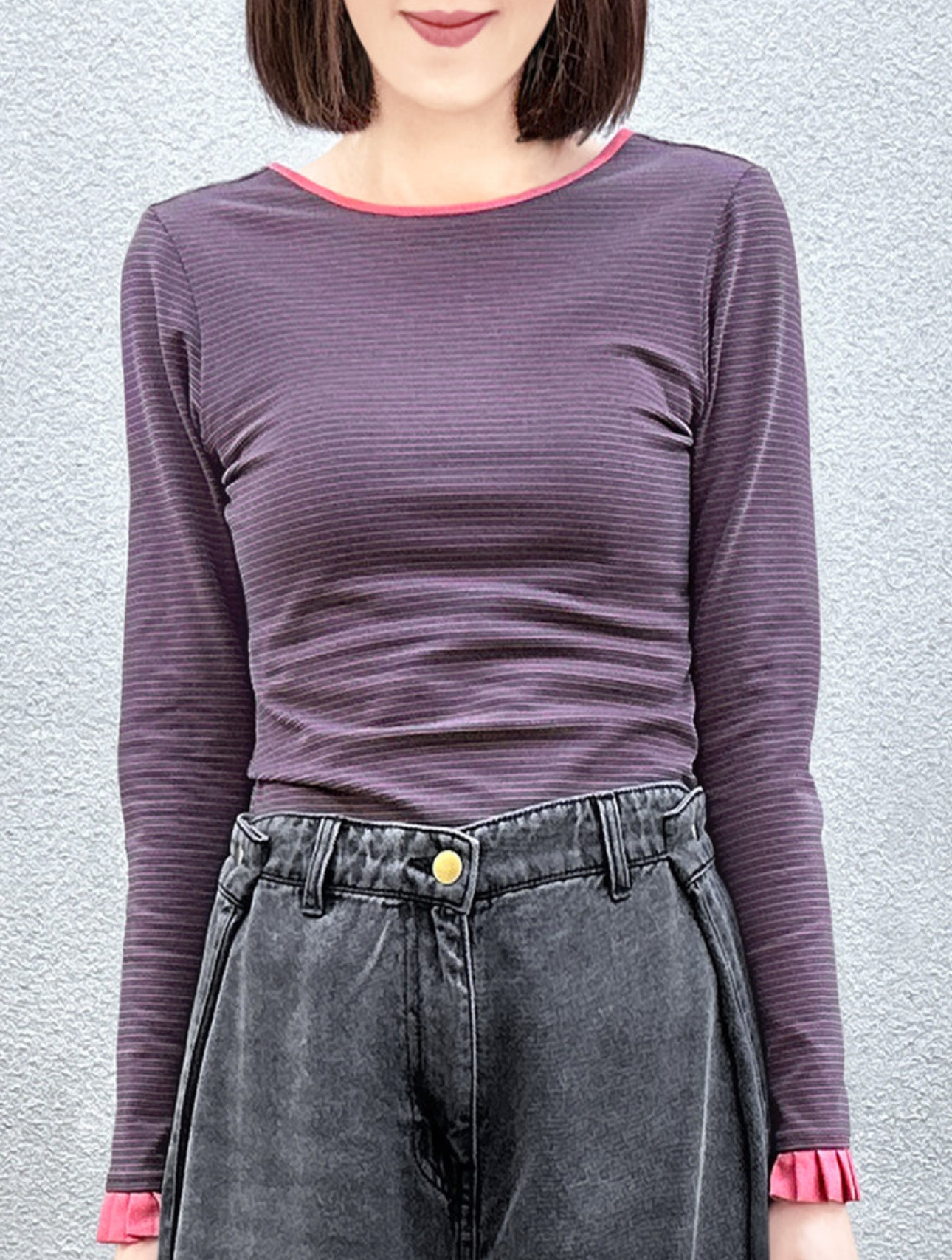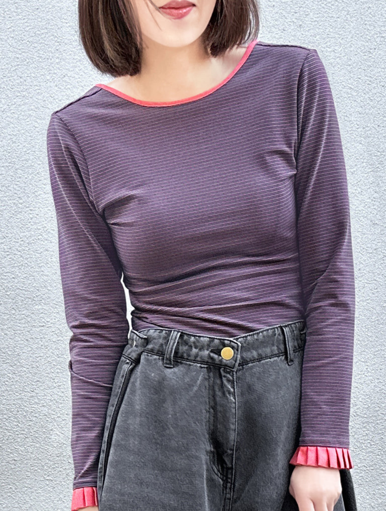 TYNVIE 排褶装饰袖口露背长袖上衣 - 红条纹