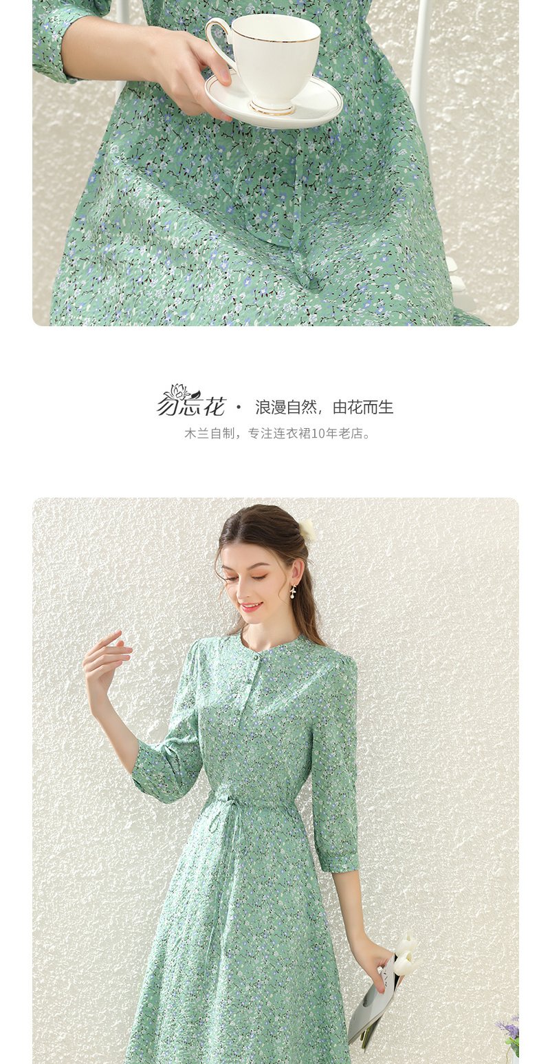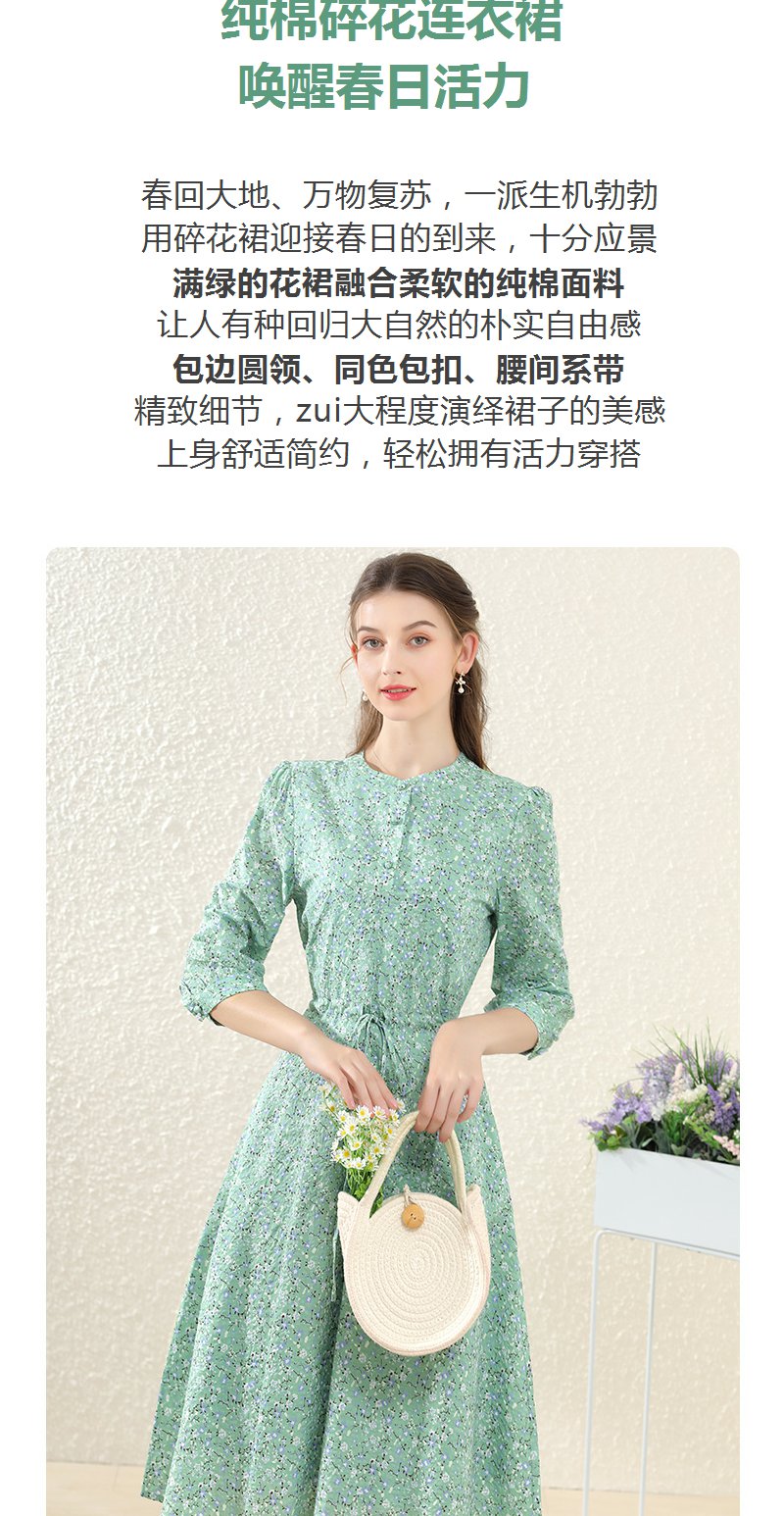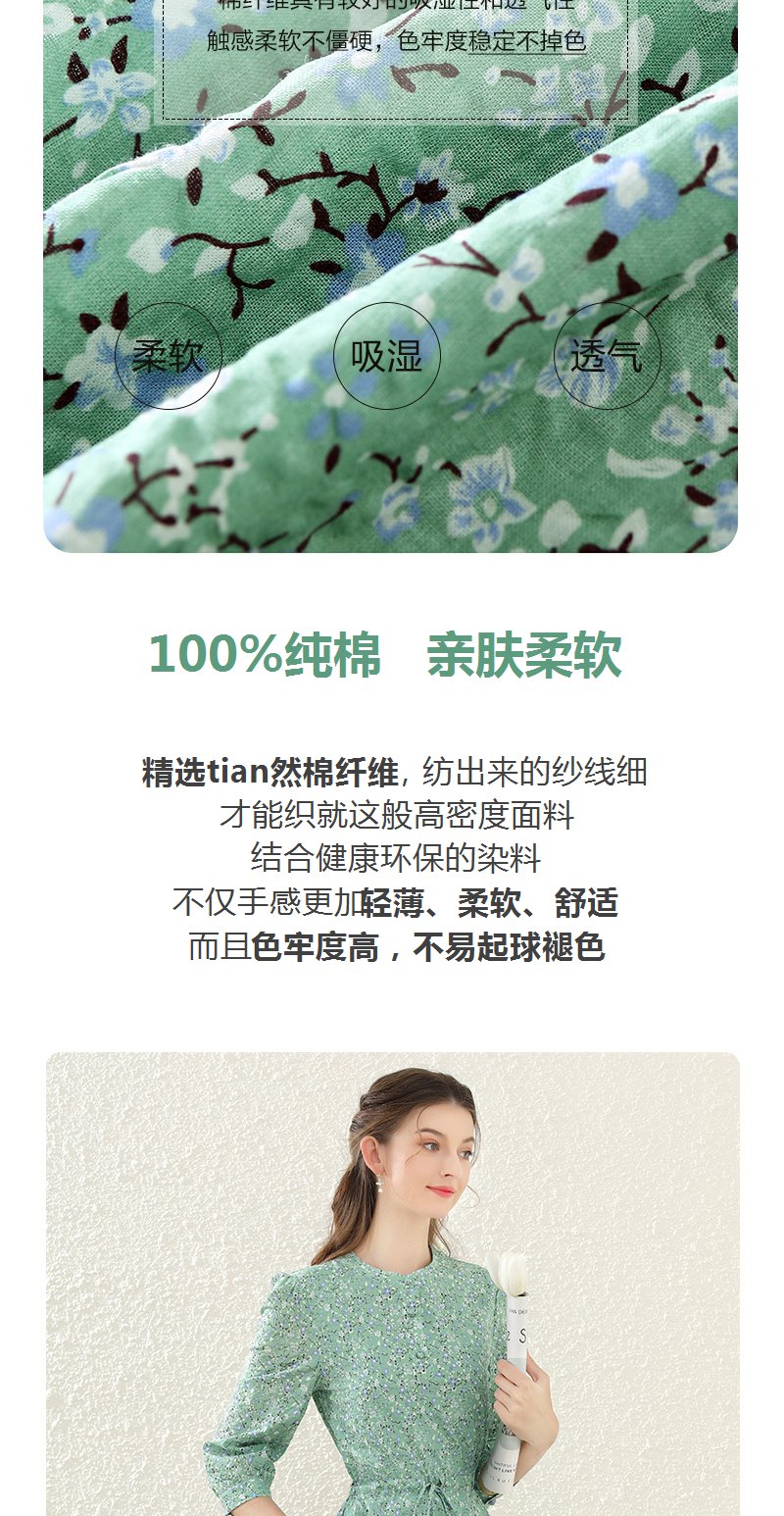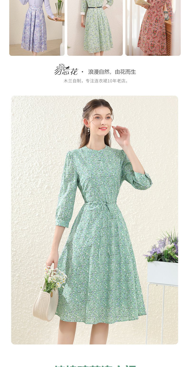 勿忘花绿色纯棉碎花遮肚子减龄连衣裙女2024秋季新款收腰显瘦裙子