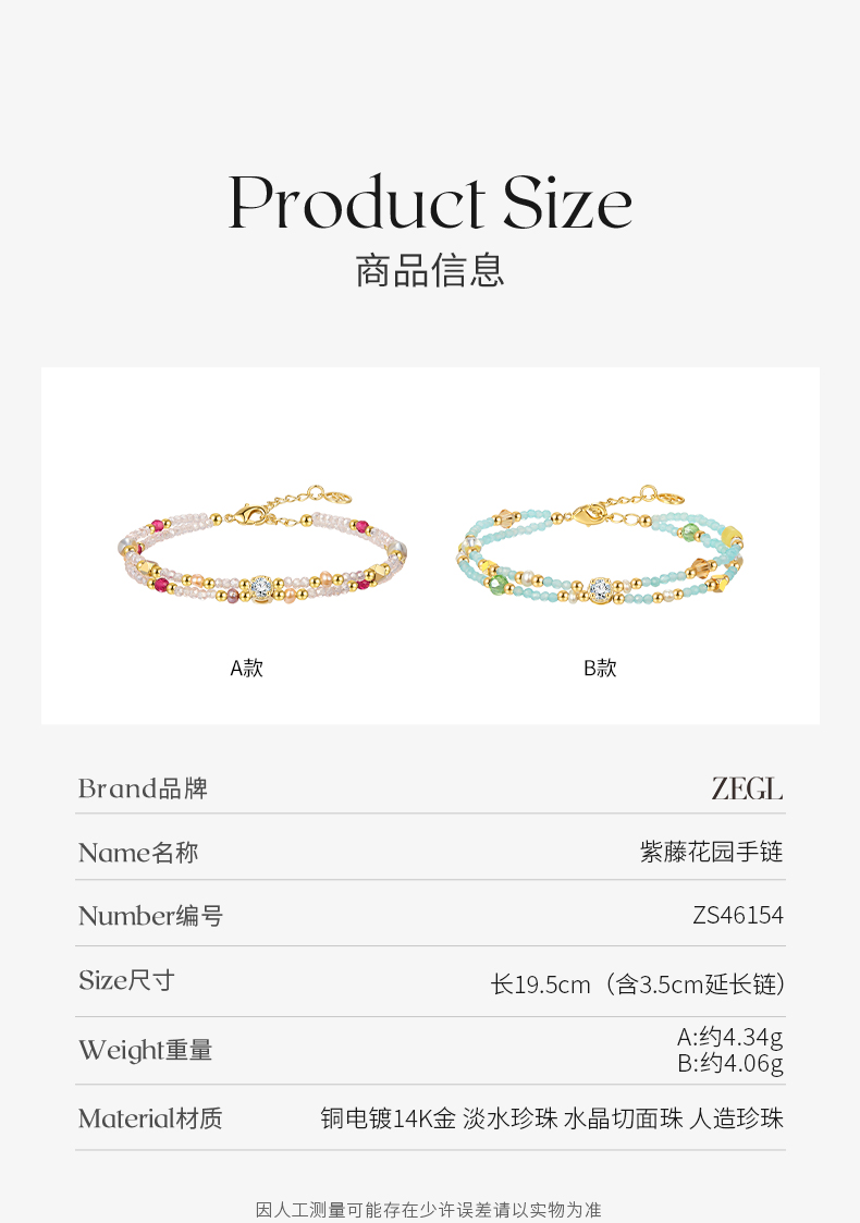 ZEGL粉色水晶珍珠串珠手链女生轻奢小众精致彩色2023年新款手饰品