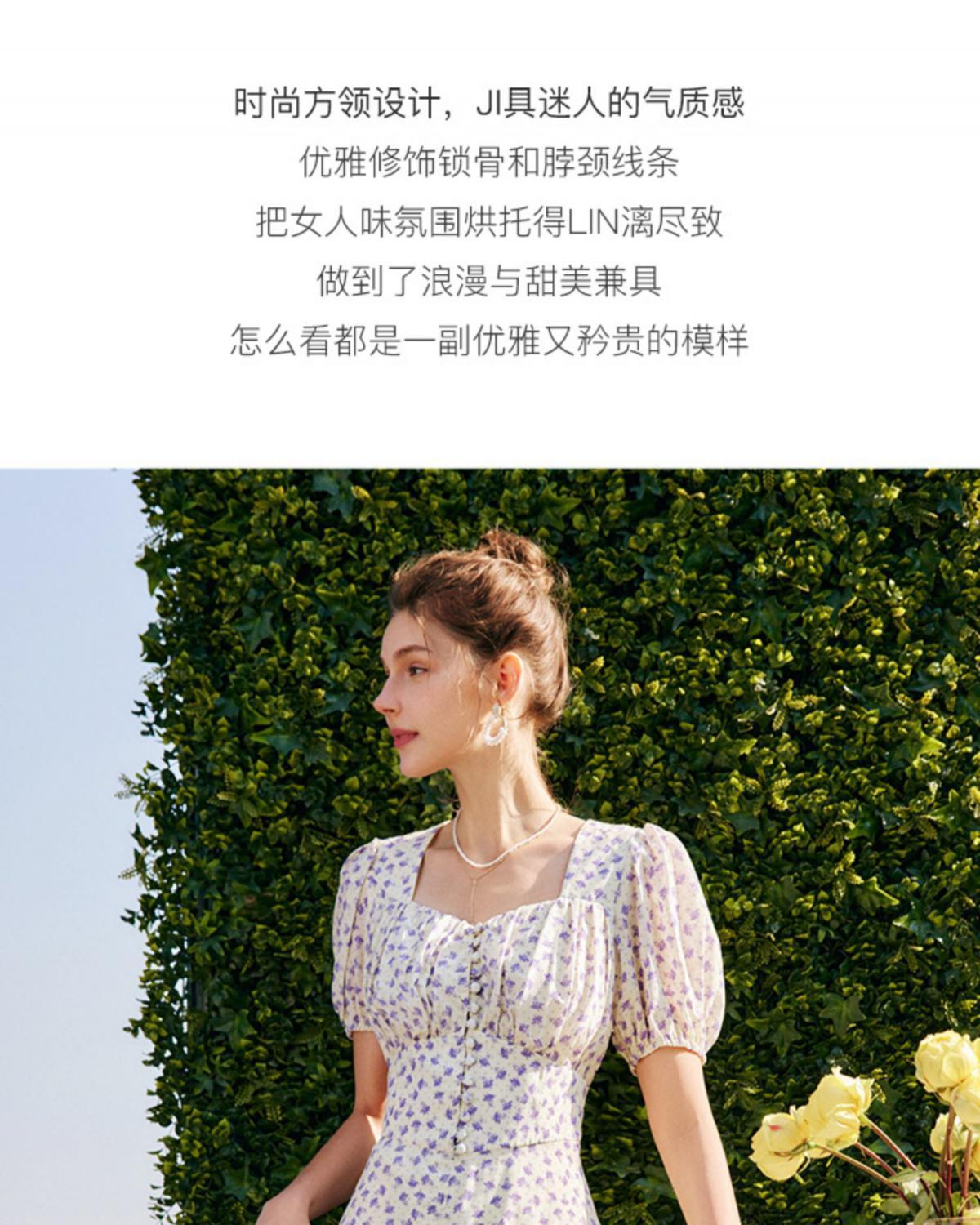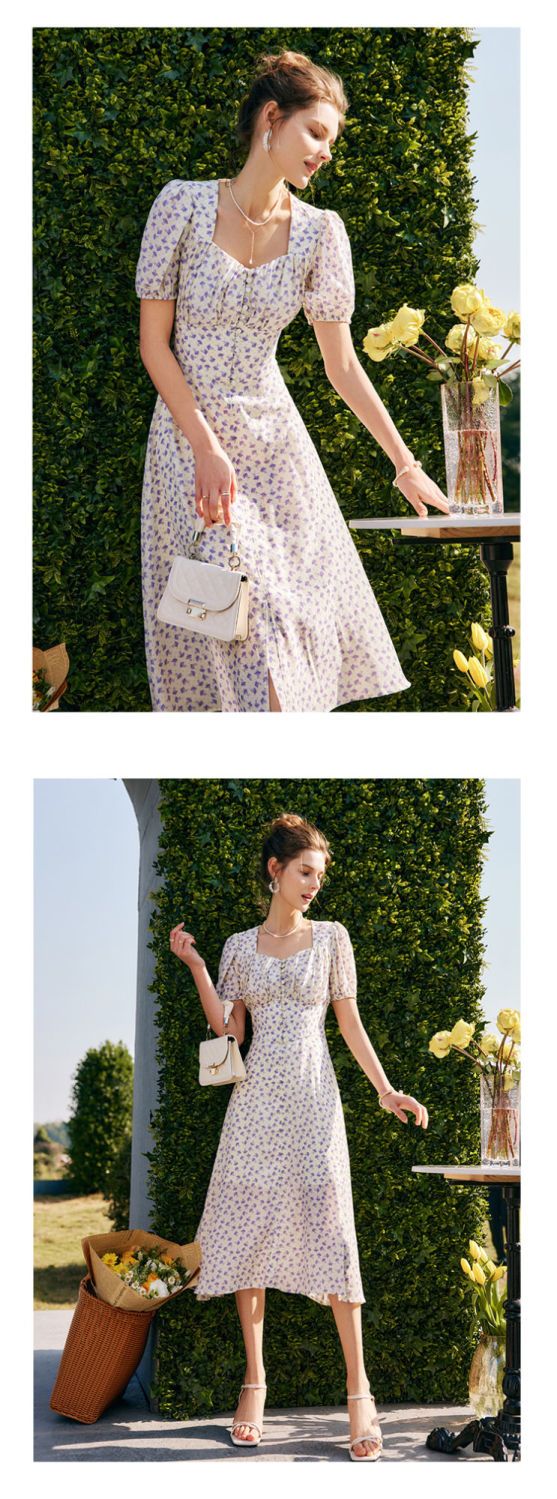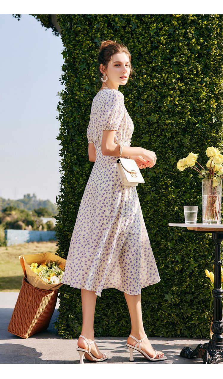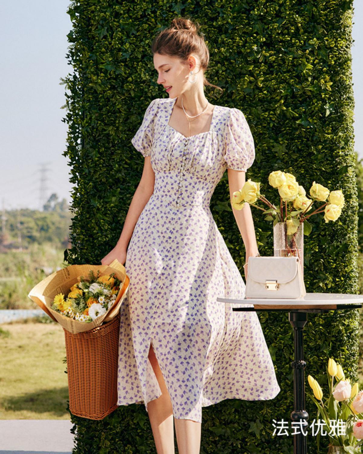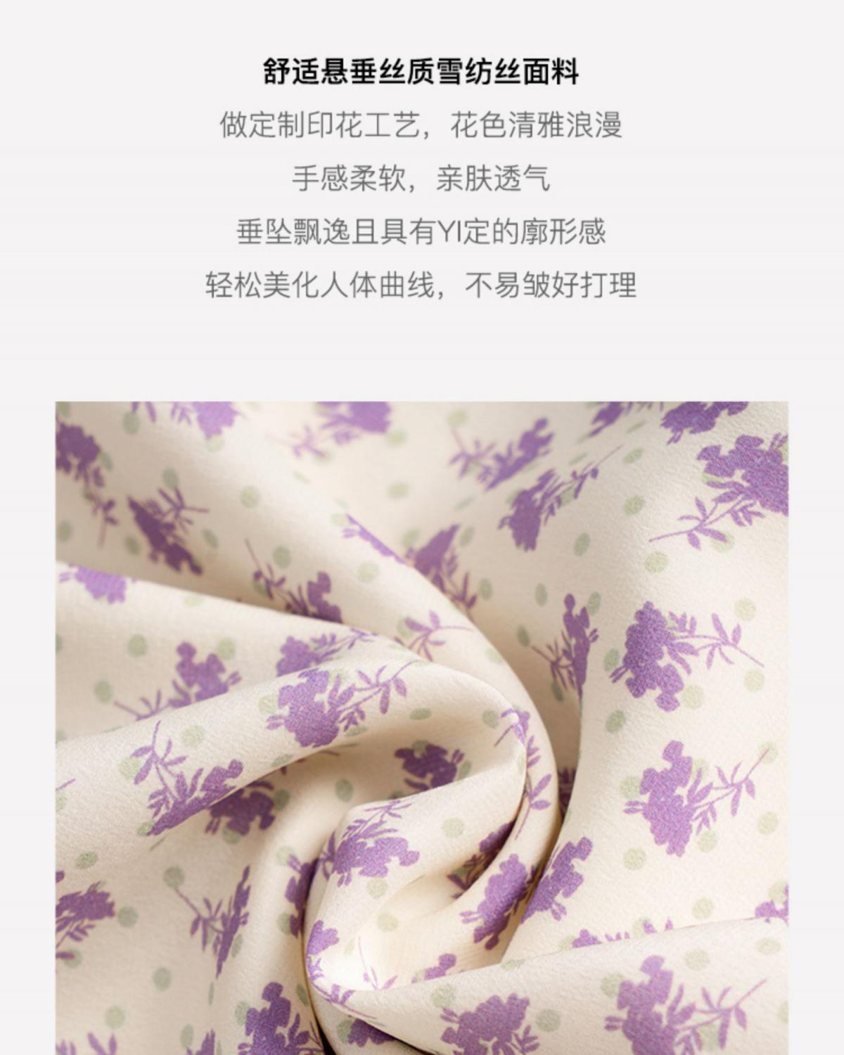 欧芮儿碎花雪纺连衣裙女春装2022年新款收腰时尚法式灯笼袖大摆裙