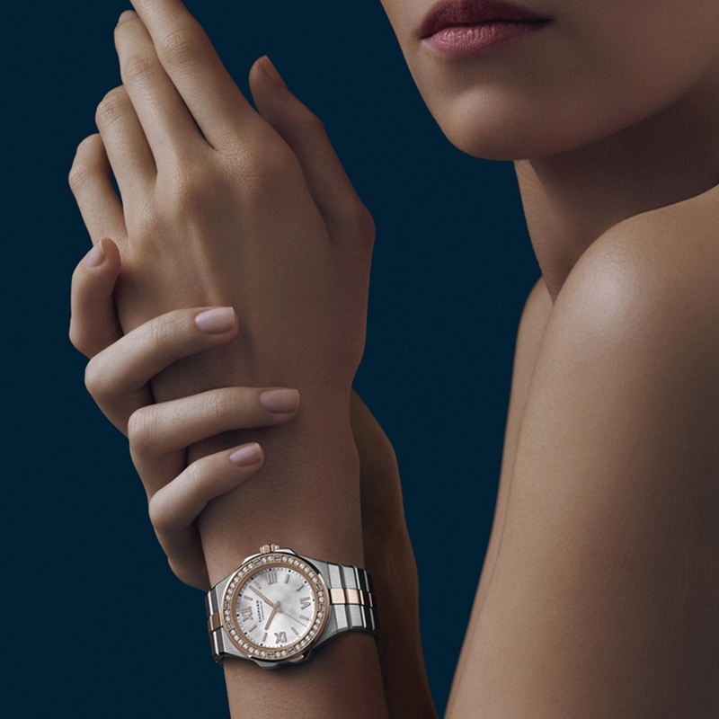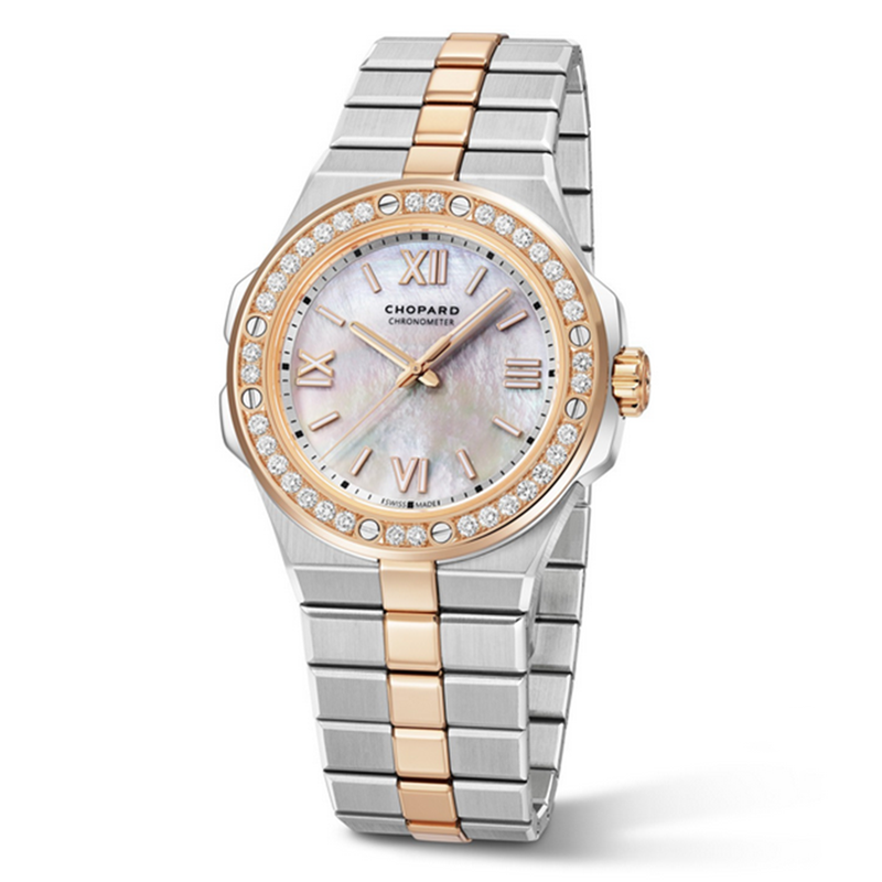镜面材质 | 蓝宝石水晶玻璃 | 表盘 | 精钢 18K玫瑰金表壳 镶钻表圈 珍珠母贝纹理表盘,镀金罗马数字,时针、分针及时标均覆以Super-LumiNova® X1级荧光涂层 透底 |