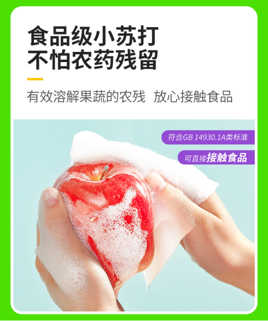 我们吃的水果蔬菜表面总会有农残,用清水清洗总是有些不放心, 涤尚这款泡泡洗碗巾是食品级的小苏打成分,非常温和安全, 可以放心直接接触食物,家里的蔬菜水果,甚至是婴儿的奶瓶辅食工具,都能放心使用