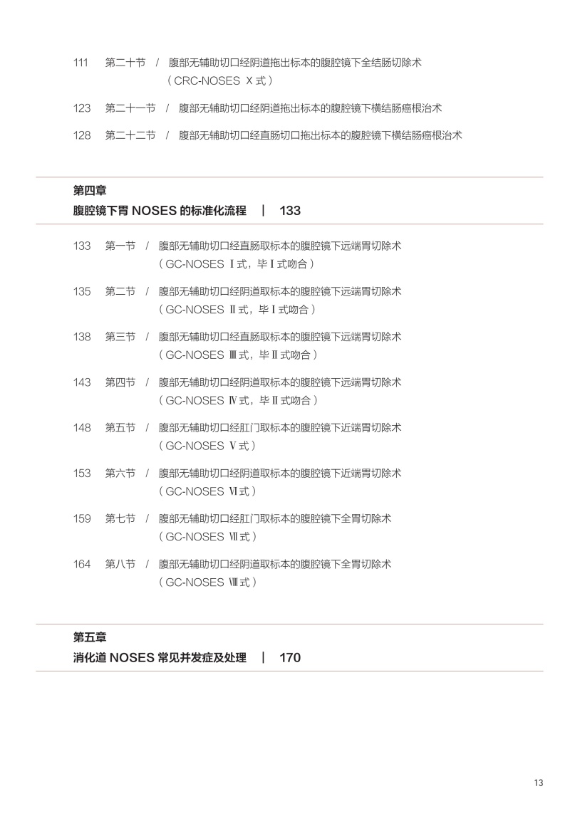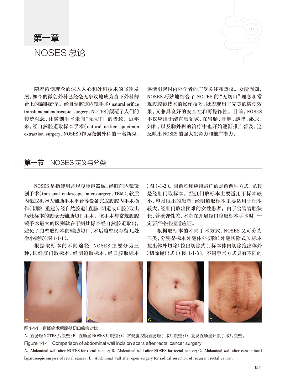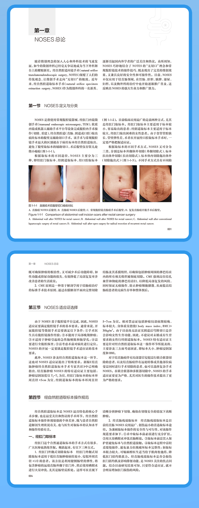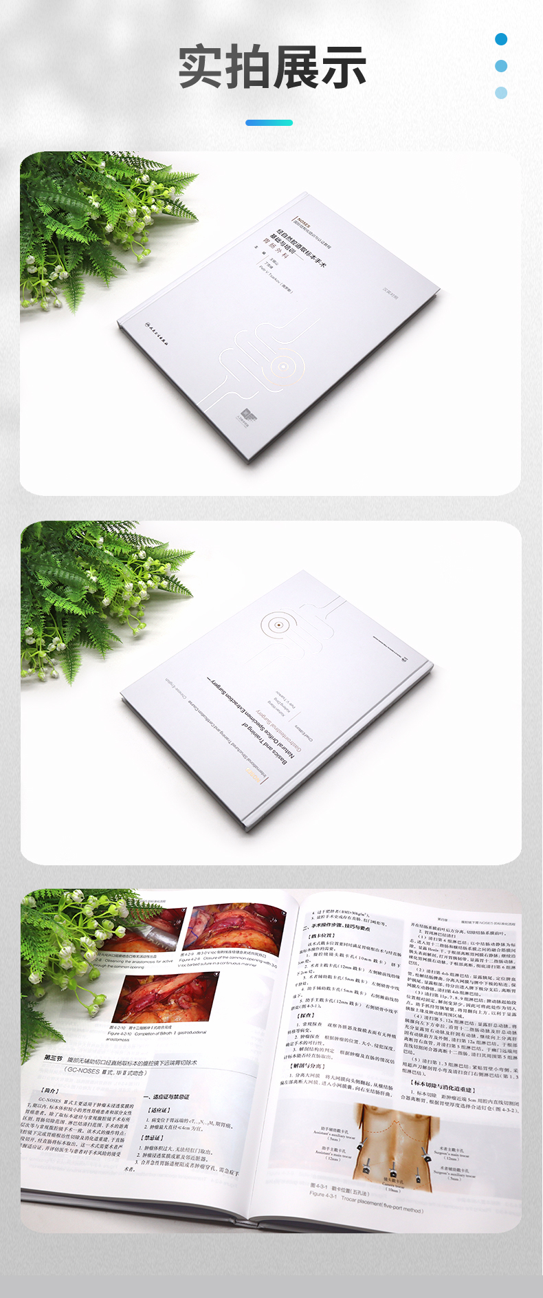 全书分为五个部分,总论、术前准备、腹腔镜结直肠NOSES、腹腔镜胃NOSES和并发症防治。 【1】总论包含NOSES提出的背景、定义、目前临床开展现状、技术的优势与局限性、分类及适应证、专用器械设备与无菌无瘤技术等内容。 【2】术前准备包括患者评估、手术选择、设备准备、团队配备、医患沟通等方面的内容。有助于临床医师在术前全面考虑各种因素,以确保手术顺利进行,提高手术成功率和患者满意度。 【3】腹腔镜结直肠NOSES详细阐述23个结直肠NOSES术式的基本操作步骤。内容涵盖经直肠与经阴道取标本的低位直肠、中位直肠、高位直肠、乙状结肠、左半结肠、右半结肠和全结肠手术。 【4】腹腔镜胃NOSES详细阐述9个胃NOSES术式的基本操作步骤。内容涵盖经直肠与经阴道取标本的远端胃、近端胃及全胃切除术。 【5】并发症防治介绍NOSES中常见的并发症及其处理策略,包括腹腔感染、吻合口漏、肠梗阻等。