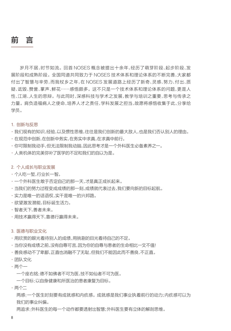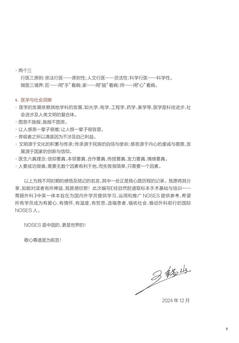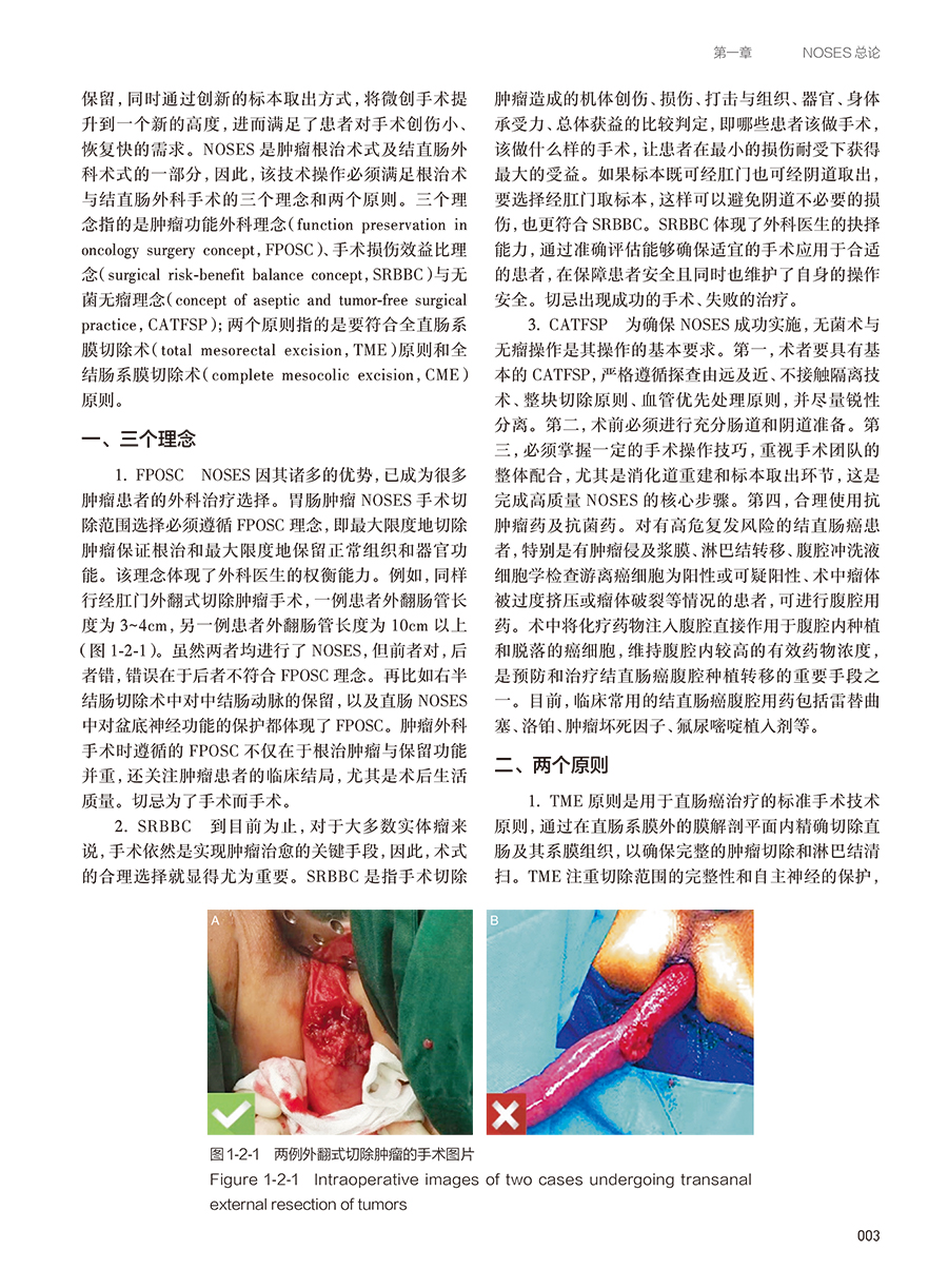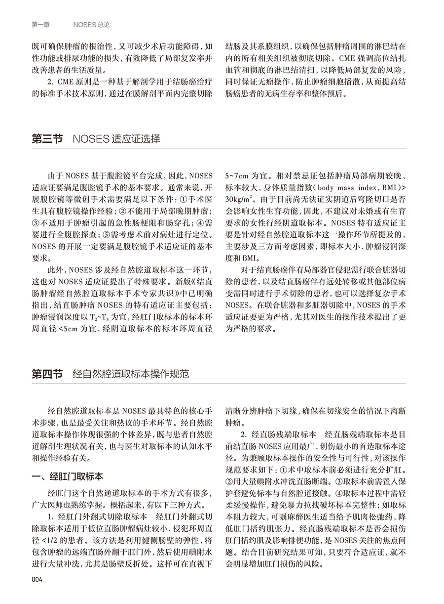 全书分为五个部分,总论、术前准备、腹腔镜结直肠NOSES、腹腔镜胃NOSES和并发症防治。 【1】总论包含NOSES提出的背景、定义、目前临床开展现状、技术的优势与局限性、分类及适应证、专用器械设备与无菌无瘤技术等内容。 【2】术前准备包括患者评估、手术选择、设备准备、团队配备、医患沟通等方面的内容。有助于临床医师在术前全面考虑各种因素,以确保手术顺利进行,提高手术成功率和患者满意度。 【3】腹腔镜结直肠NOSES详细阐述23个结直肠NOSES术式的基本操作步骤。内容涵盖经直肠与经阴道取标本的低位直肠、中位直肠、高位直肠、乙状结肠、左半结肠、右半结肠和全结肠手术。 【4】腹腔镜胃NOSES详细阐述9个胃NOSES术式的基本操作步骤。内容涵盖经直肠与经阴道取标本的远端胃、近端胃及全胃切除术。 【5】并发症防治介绍NOSES中常见的并发症及其处理策略,包括腹腔感染、吻合口漏、肠梗阻等。