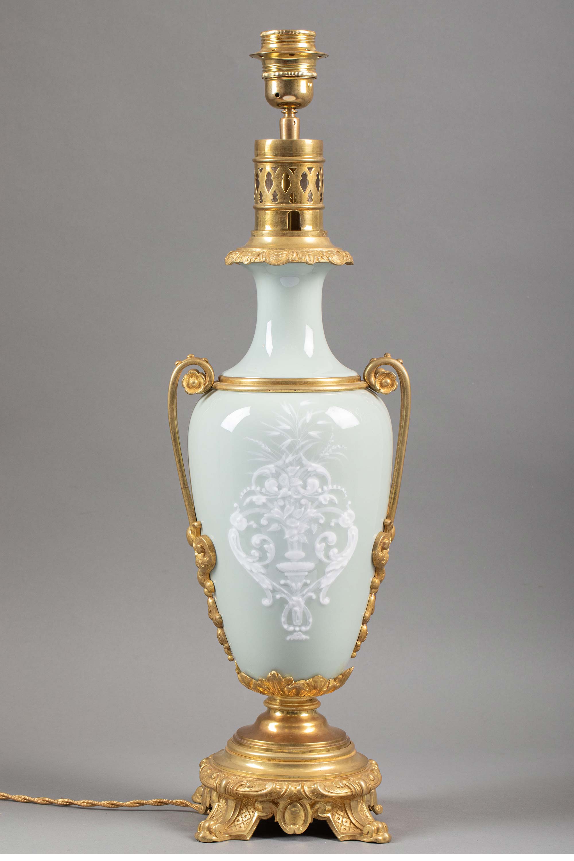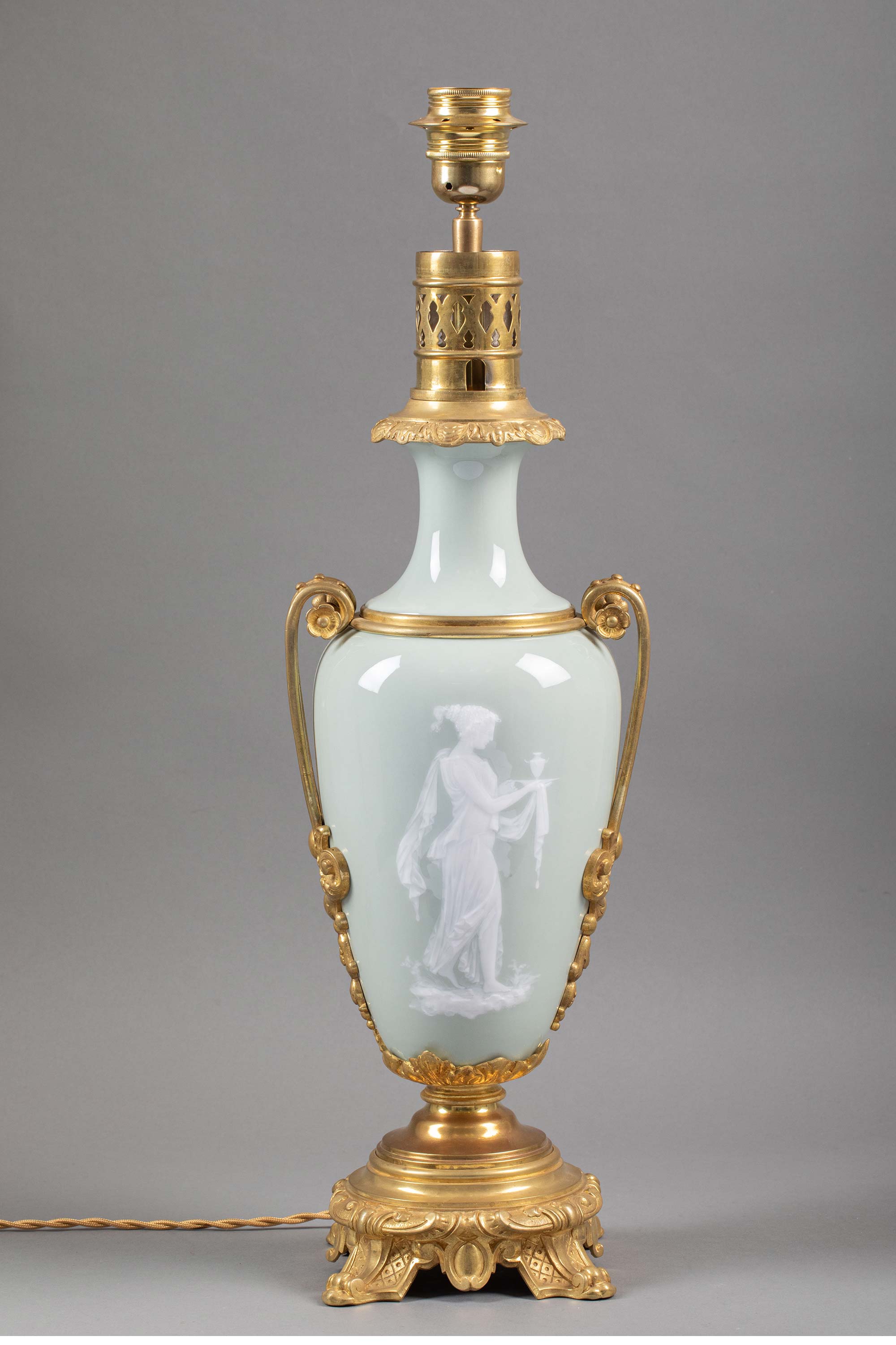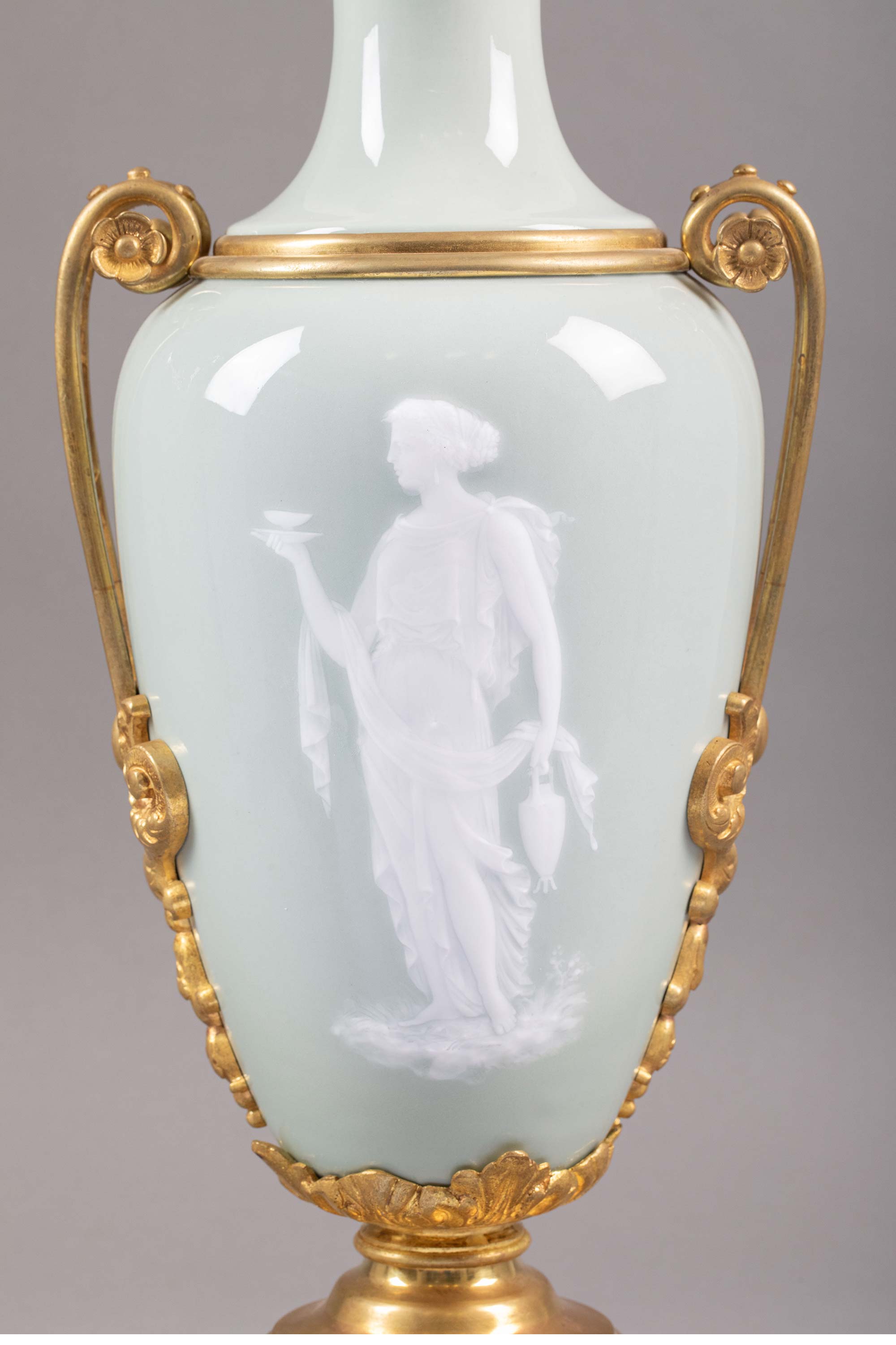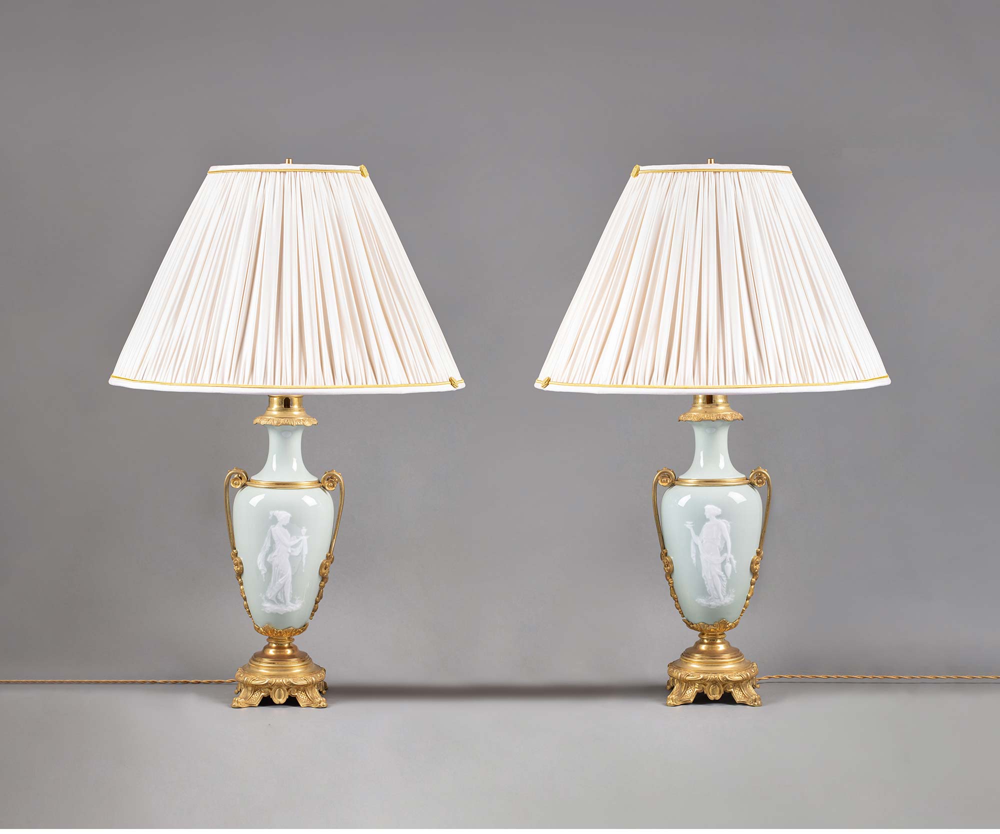 19世纪末法国出品铜鎏金精雕装饰古典人物主题豆青釉堆白瓷瓶台灯一对