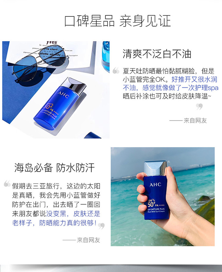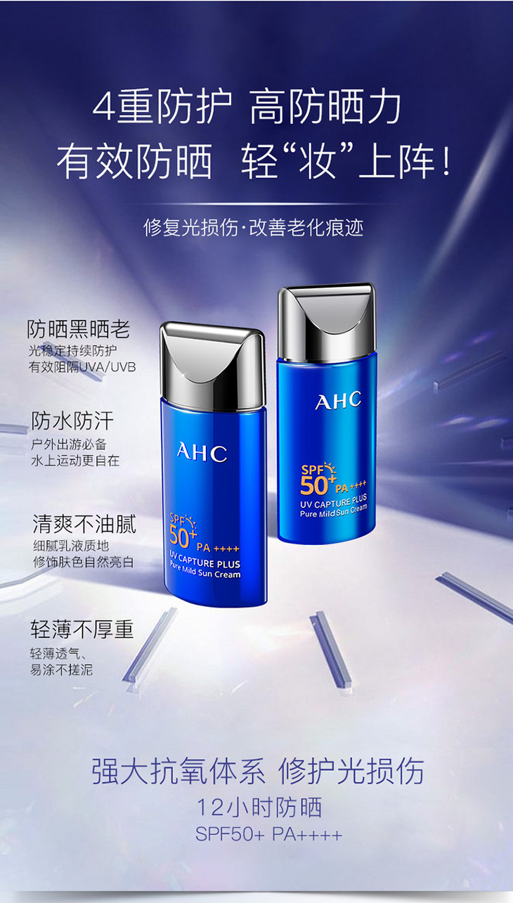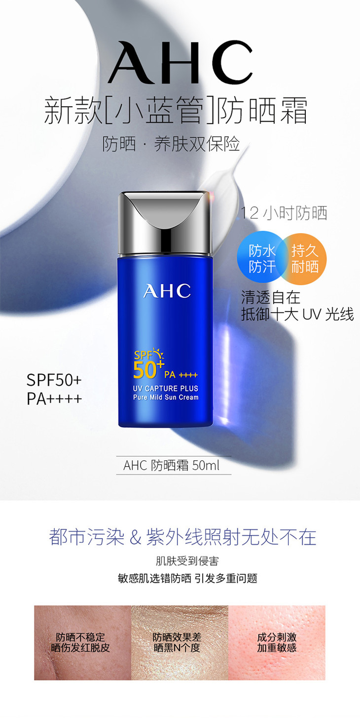 【物理+化学】韩国 AHC爱和纯 小蓝瓶清爽水润素颜防晒霜 SPF50+/PA 50ml/90ml
