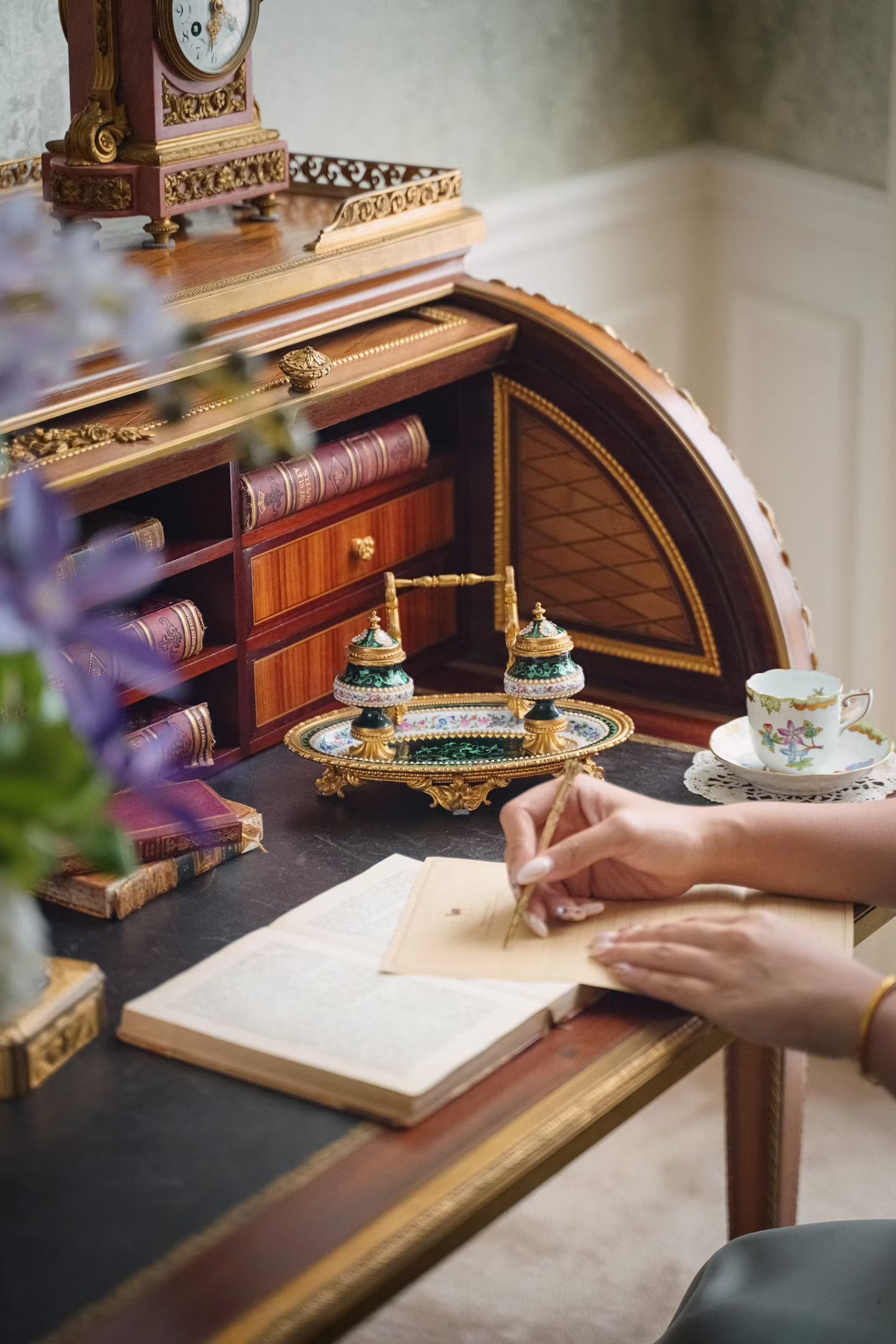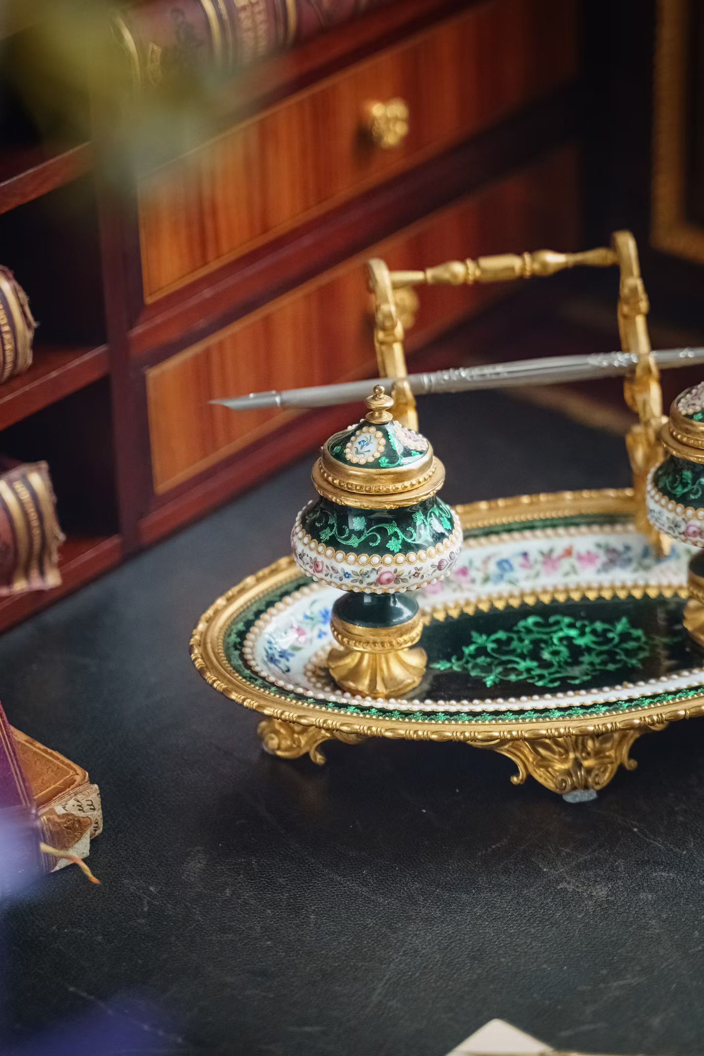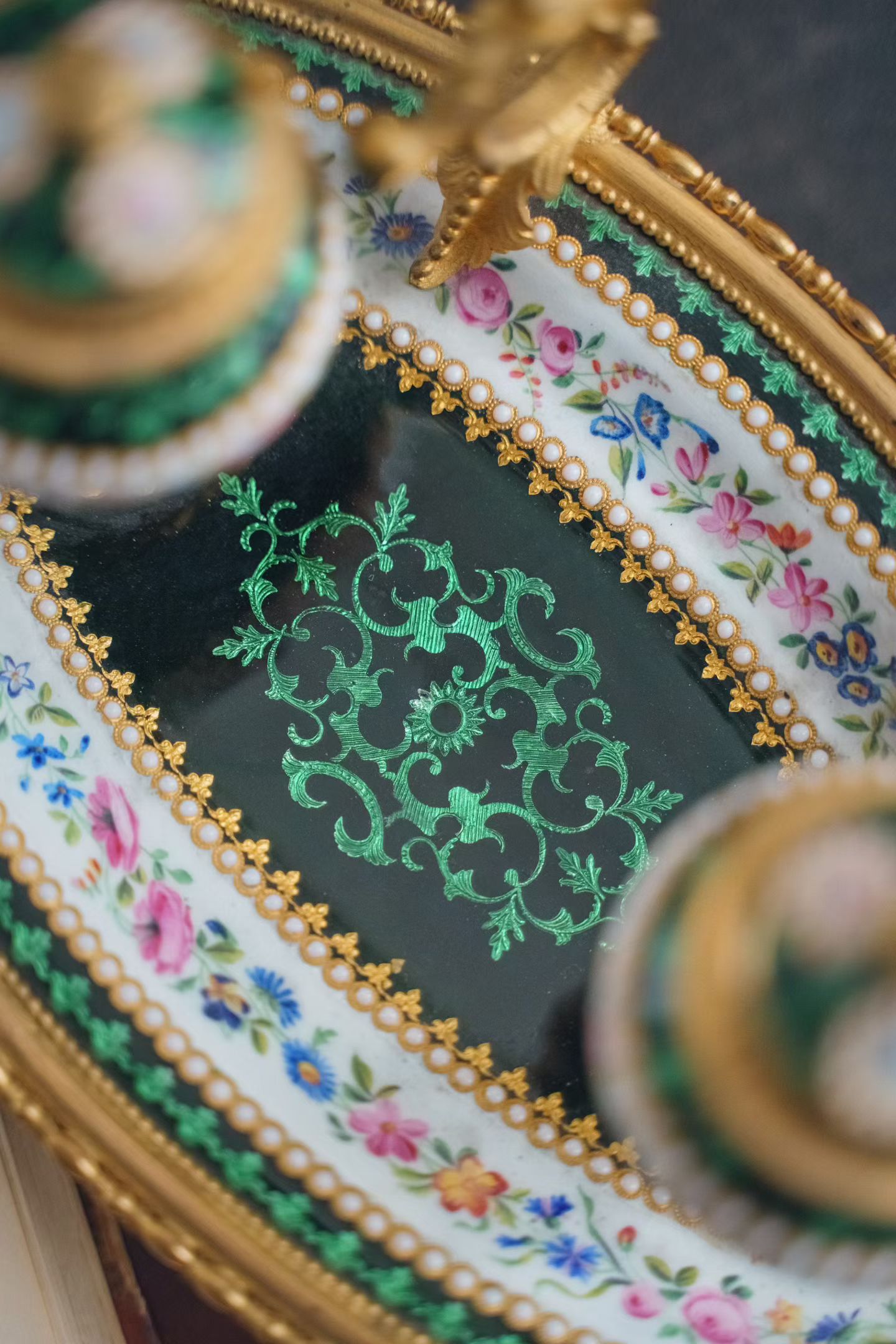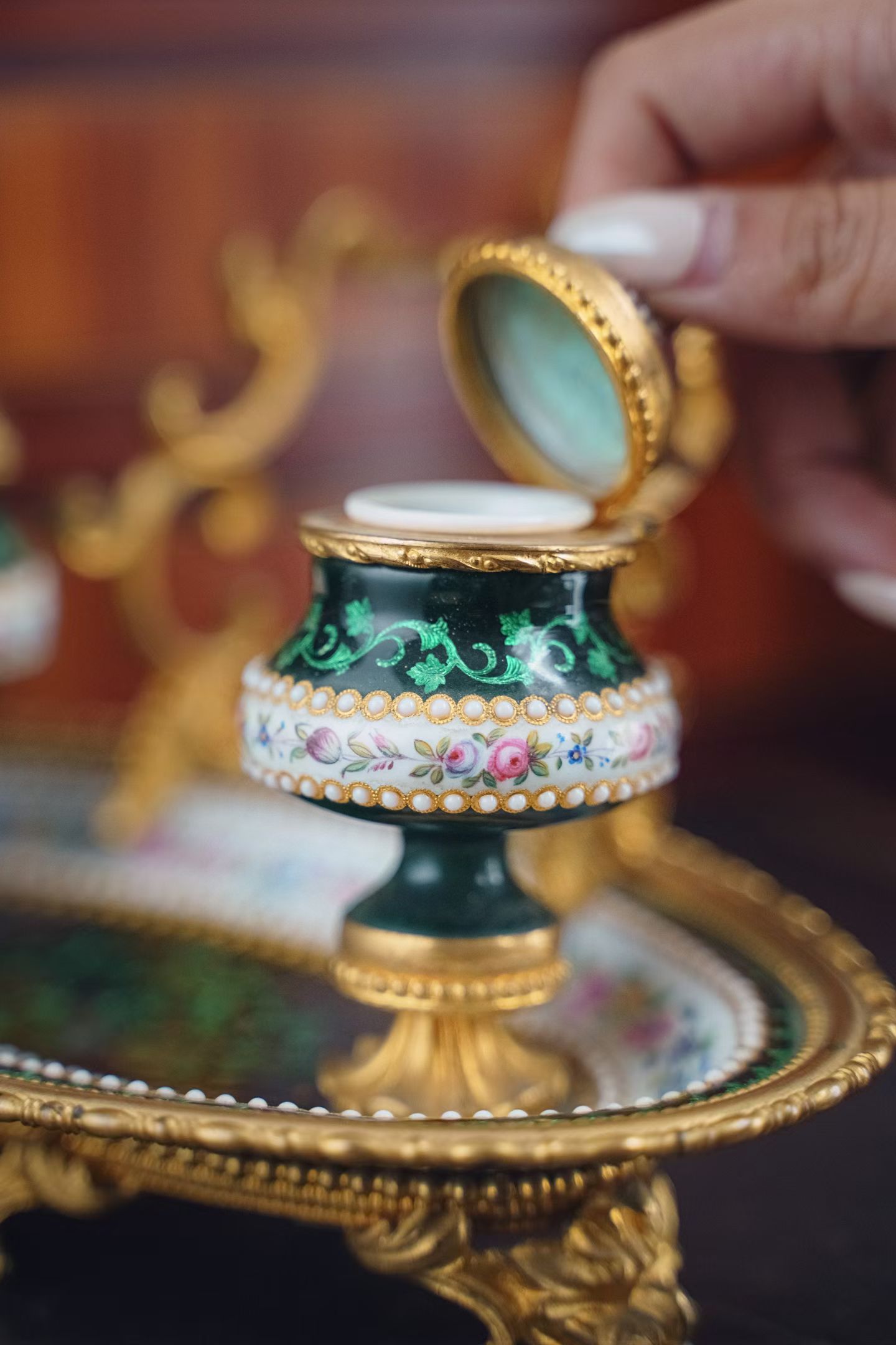 独角鹿西洋古董19世纪法国著名工坊TAHAN PARIS签名出品卷叶纹铜鎏金精雕装饰珠边布雷松珐琅及花卉主题瓷面彩绘墨水台套件