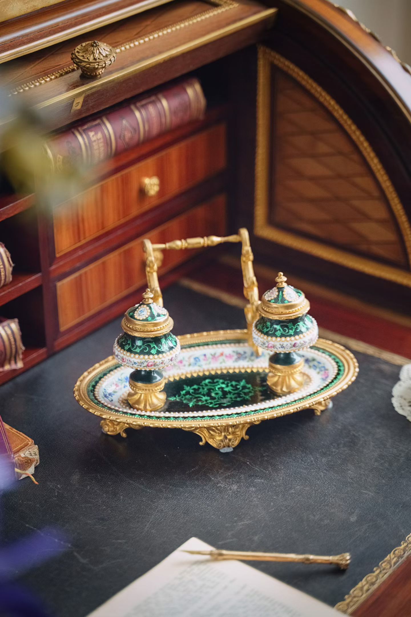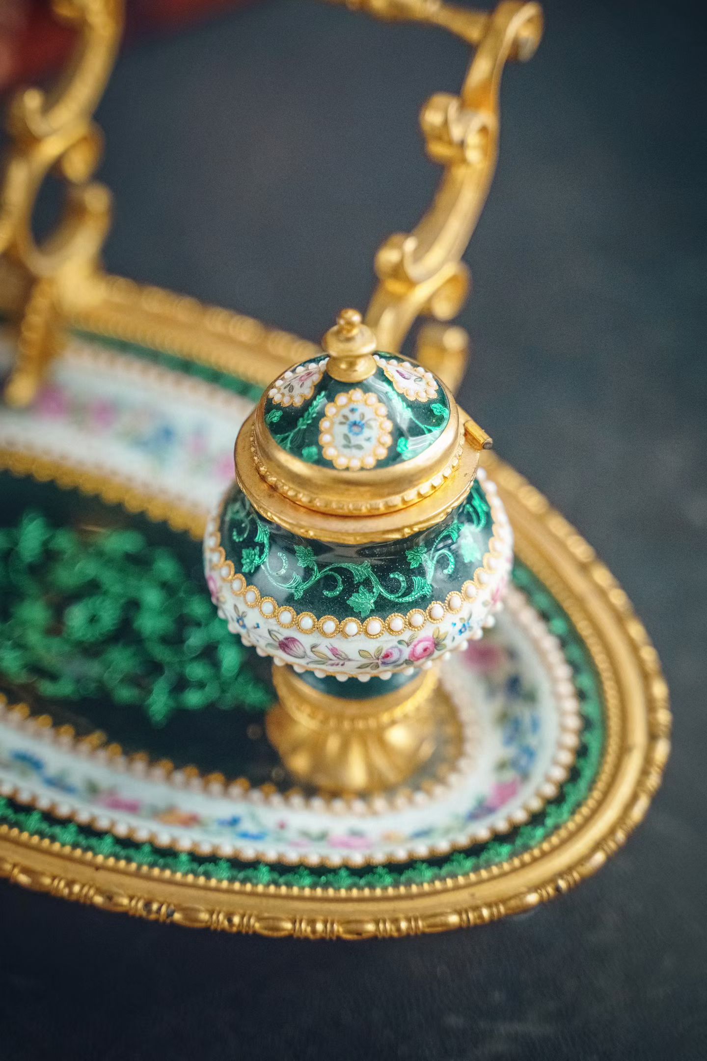 19世纪法国著名工坊TAHAN PARIS签名出品卷叶纹铜鎏金精雕装饰珠边布雷松珐琅及花卉主题瓷面彩绘墨水台套件