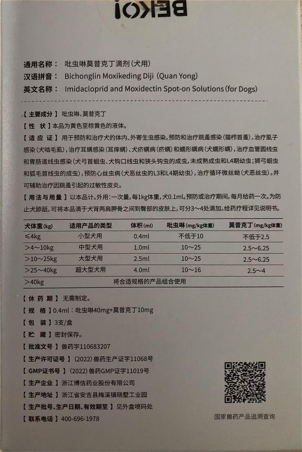 贝可益莫昔克丁吡虫啉(小犬)0.4ml*3支/盒【兽药字 110683207】有效期2028年6月19日【主要成分】吡虫啉、莫昔克丁【产品功能】外用预防和治疗 犬的体内、体外寄生虫感染。